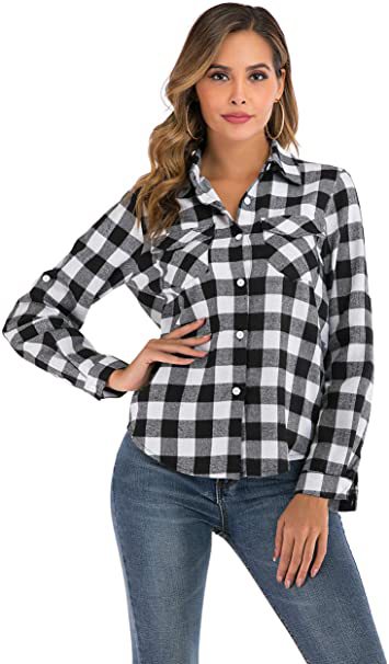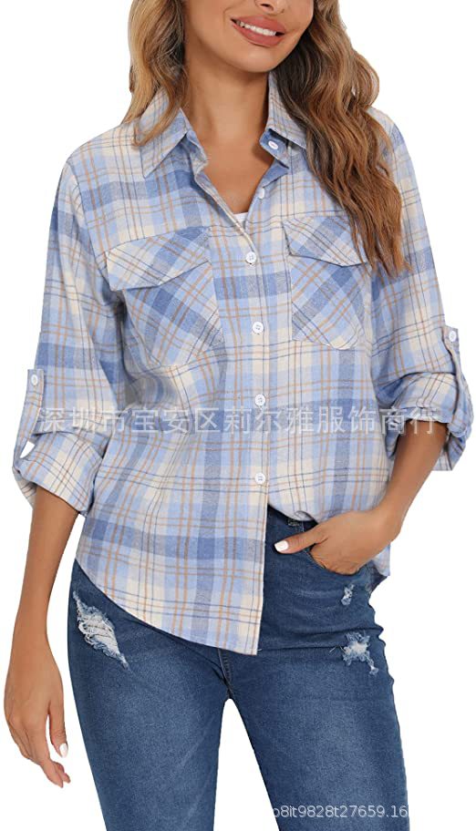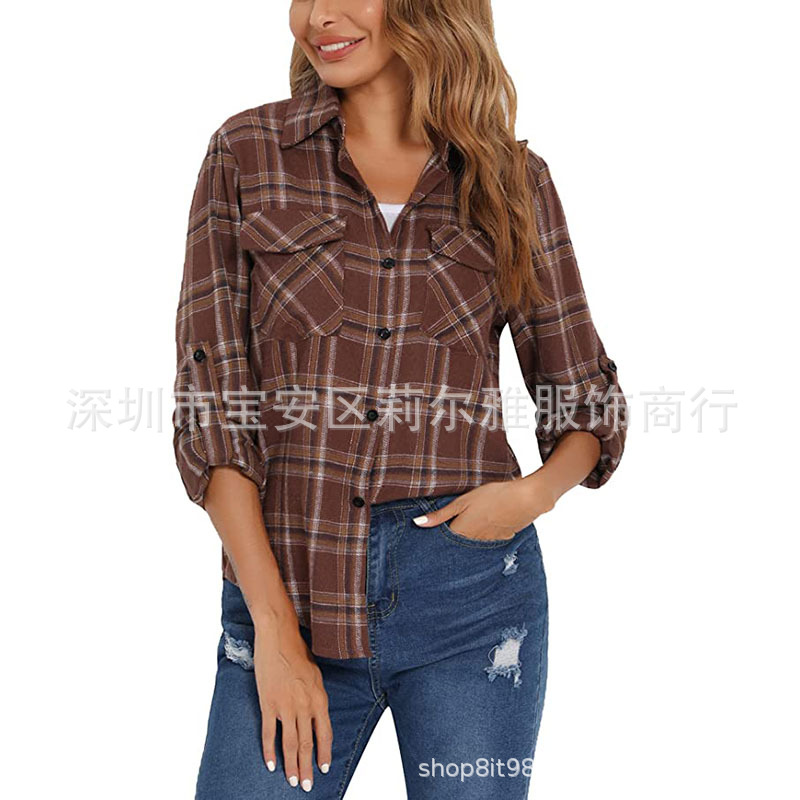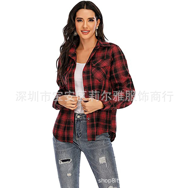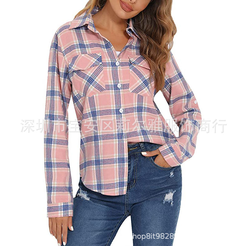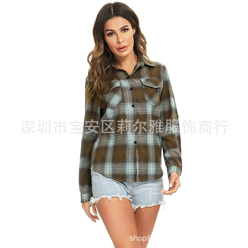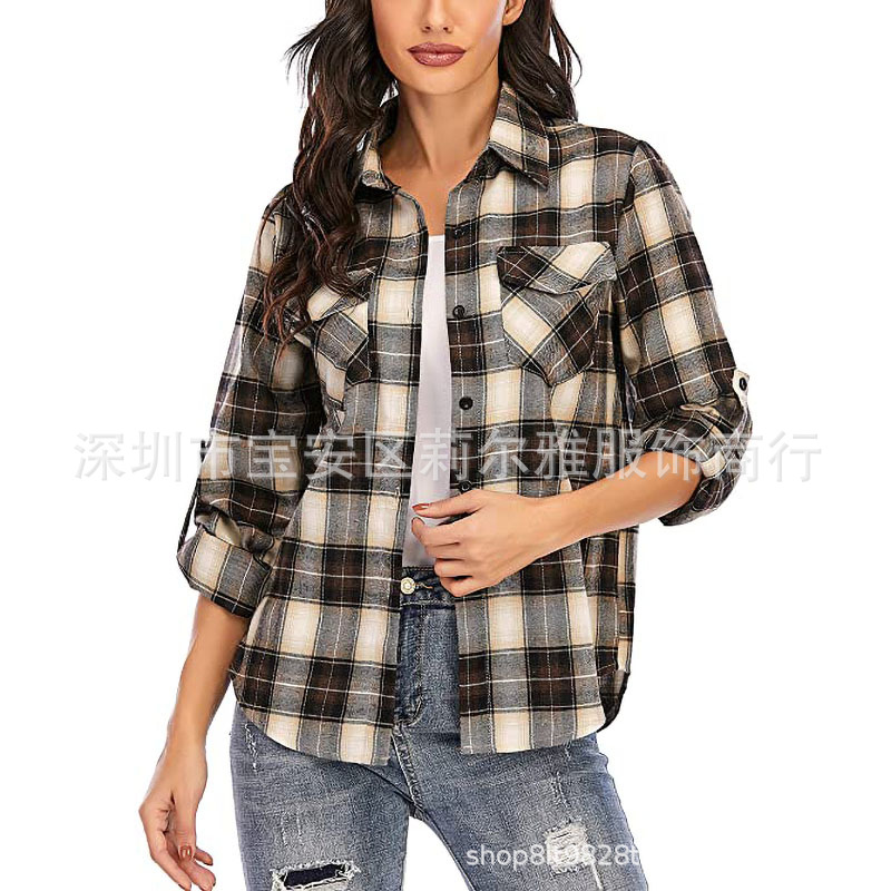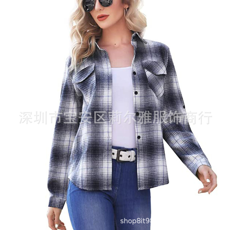 亚马逊女装秋冬新款外贸学院风格子衬衣欧美女装翻领长袖格纹衬衫