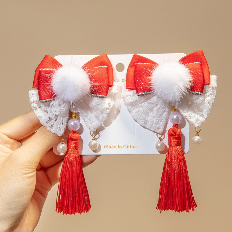 儿童新年喜庆发夹新中式过年流苏对夹发饰可爱公主红色蝴蝶结发卡