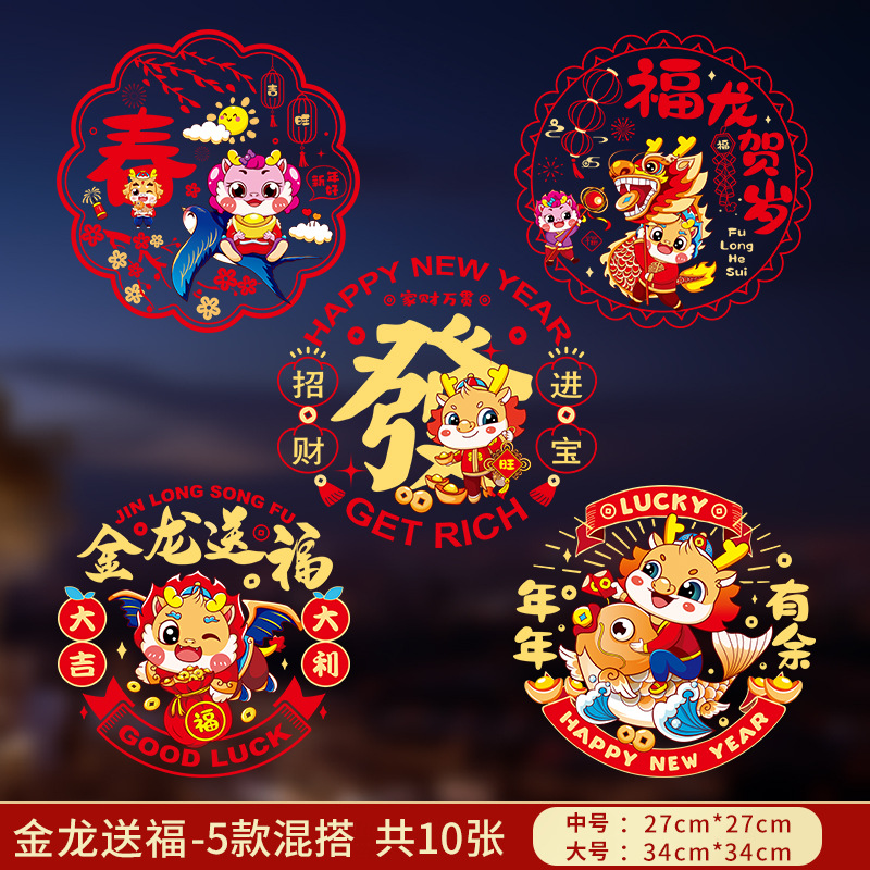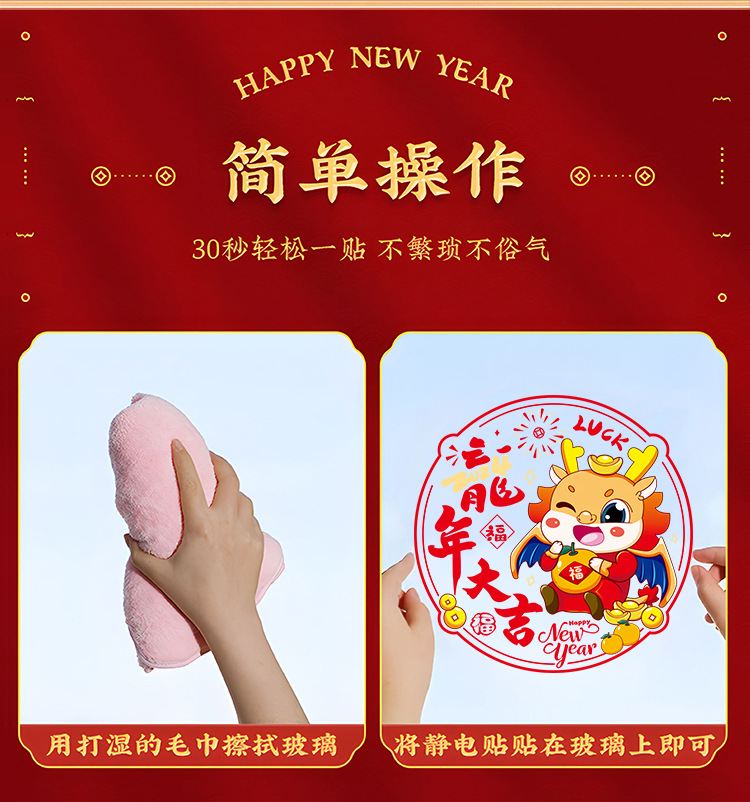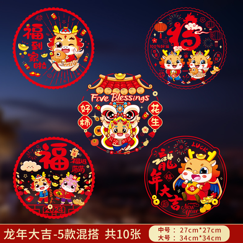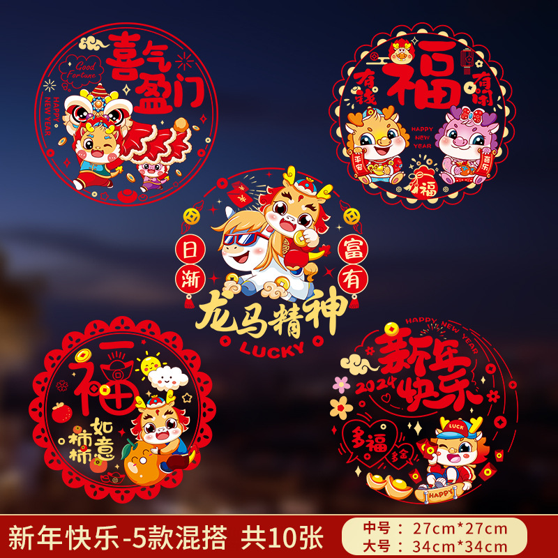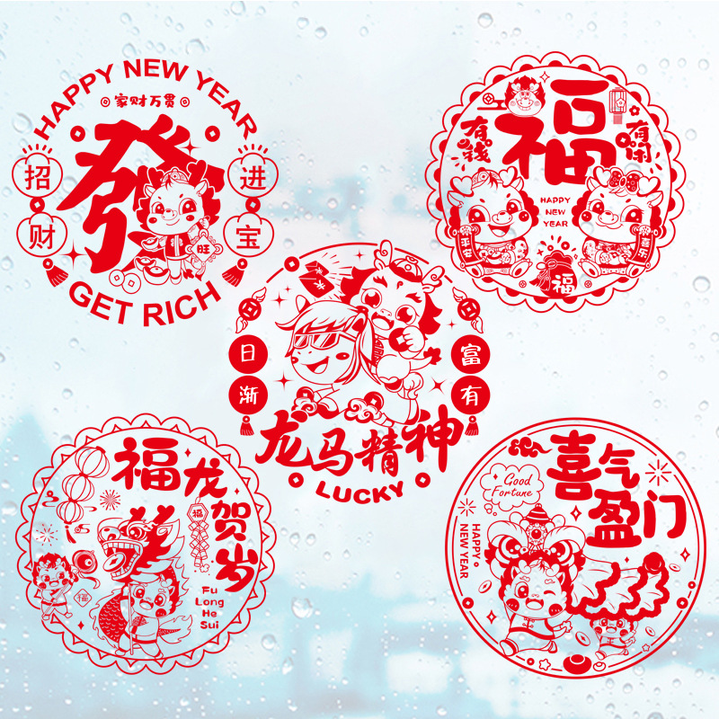 2024龙年彩色窗花生肖静电贴过年春节装饰用品新年福字贴卡通窗贴