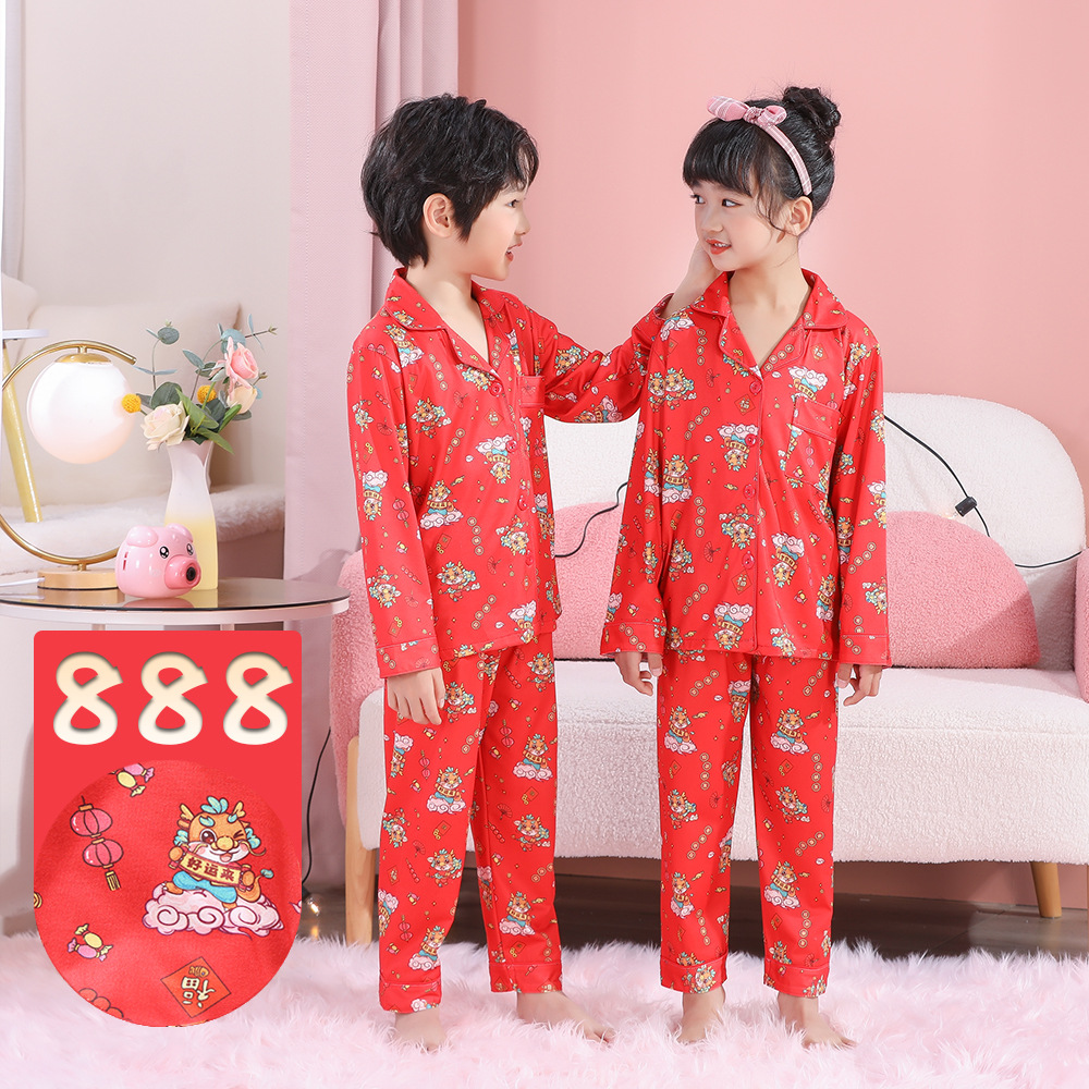 儿童睡衣男童春秋薄款套装红色本命年男孩卡通2024新年家居服外穿