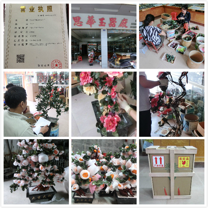 | 我们的产品都是经过仔细检查后才发货,请买家提货时最好当面验货,为了保障您的权益请仔细,检查验货时发现有件数不对或者运输损坏请不予签收并及时联系我们,物流公司返回后我们免费重新发货【请一定仔细检查,尤其外包装出现磨损或者刮蹭时一定要拆箱检查,运输过程中造成的货物损坏如不仔细检查而直接签收货运公司是拒绝赔偿的,会给您带来不必要的损失】 | 1.大件产品因特殊性只能通过专业物流公司发货,由于各地路程远近不同,产品体积不同,运费也就不相同,具体的运费请咨询客服。 2.为了保证产品在运输途中的安全性,部分产品建议打木架,详情咨询客服。 3.部分地区物流公司无法到达,请买家下单前,请买家下单前,先咨询好客服,协商好可到达 | 玉石盆景:摆放平整,避免经常处于不稳定状态而使结构松动,精良避免阳光直射。不要将玉石盆景直接放在空调或暖气旁,以免家具受潮而开裂。经常保持清洁,用纯棉布轻轻拭去表面灰尘。用干净的棉布、羽制毛掸或专用吸尘器清洁沙发;如果撒上液体请及时用软棉布吸干净,如有残留可用干净布沾专用的干洗剂从外围拭去。 |