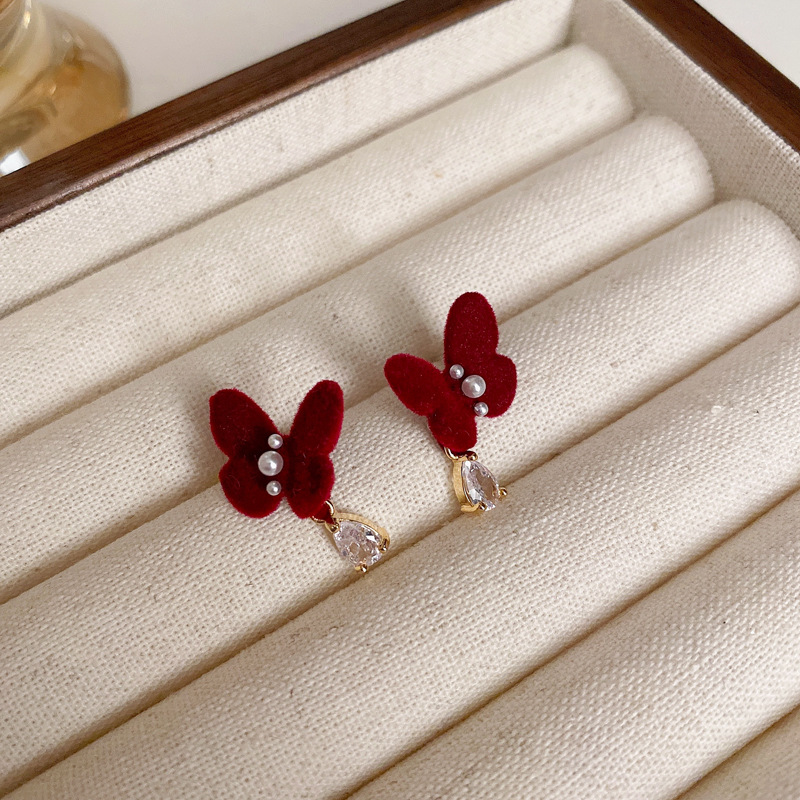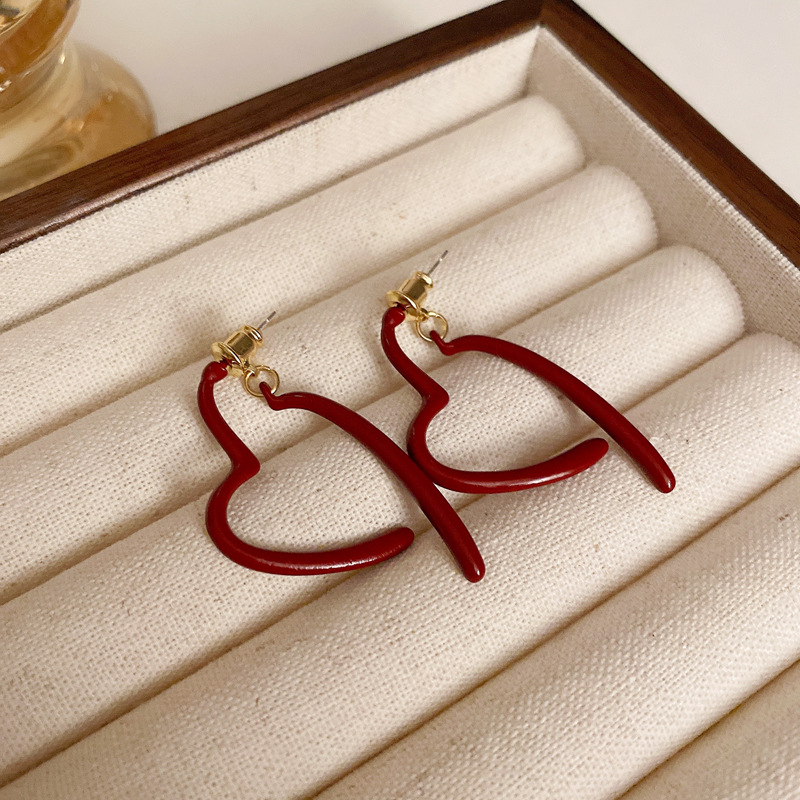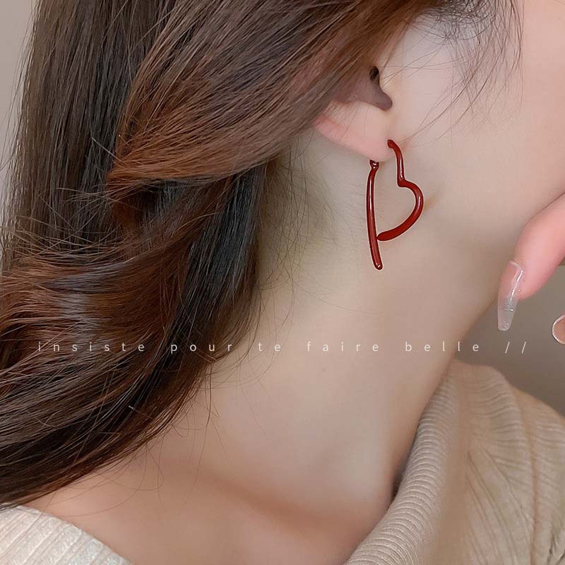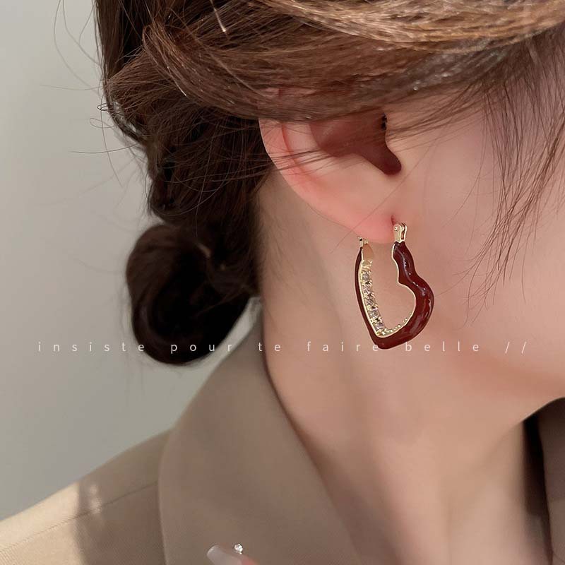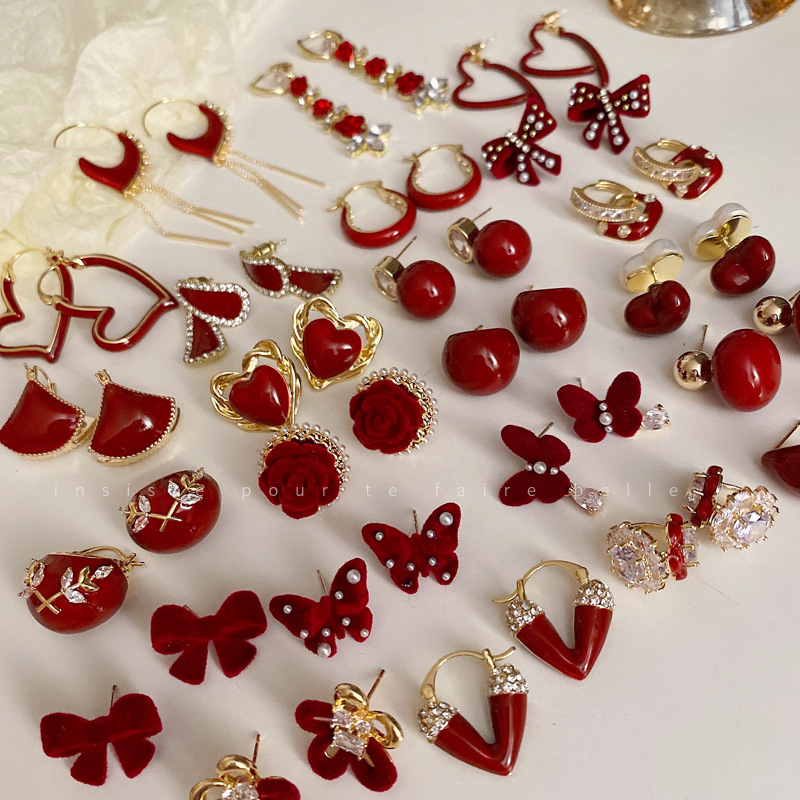 银针复古红色镶钻爱心花朵豆豆耳环网红气质耳钉新年高级感耳饰女