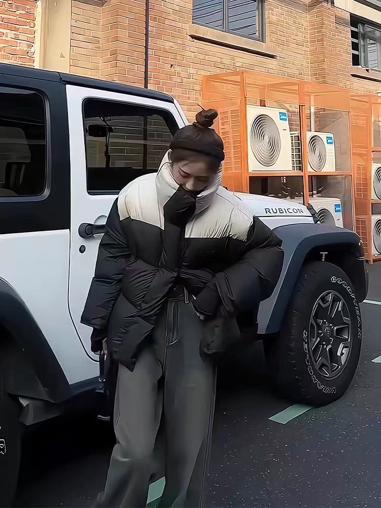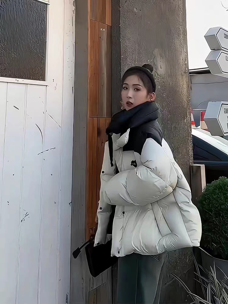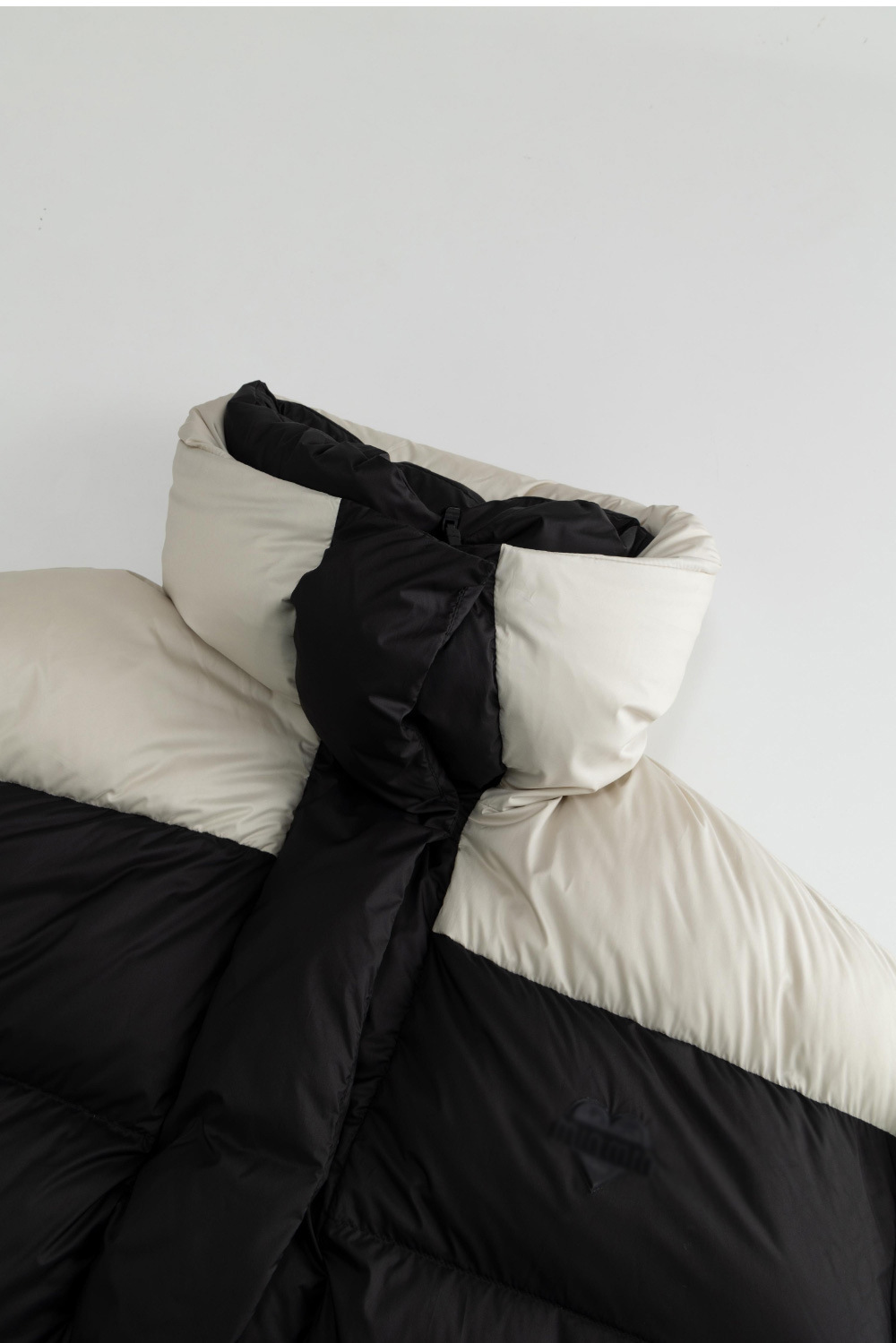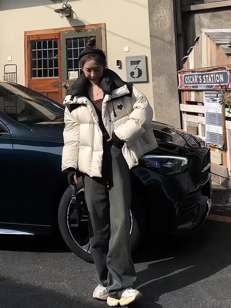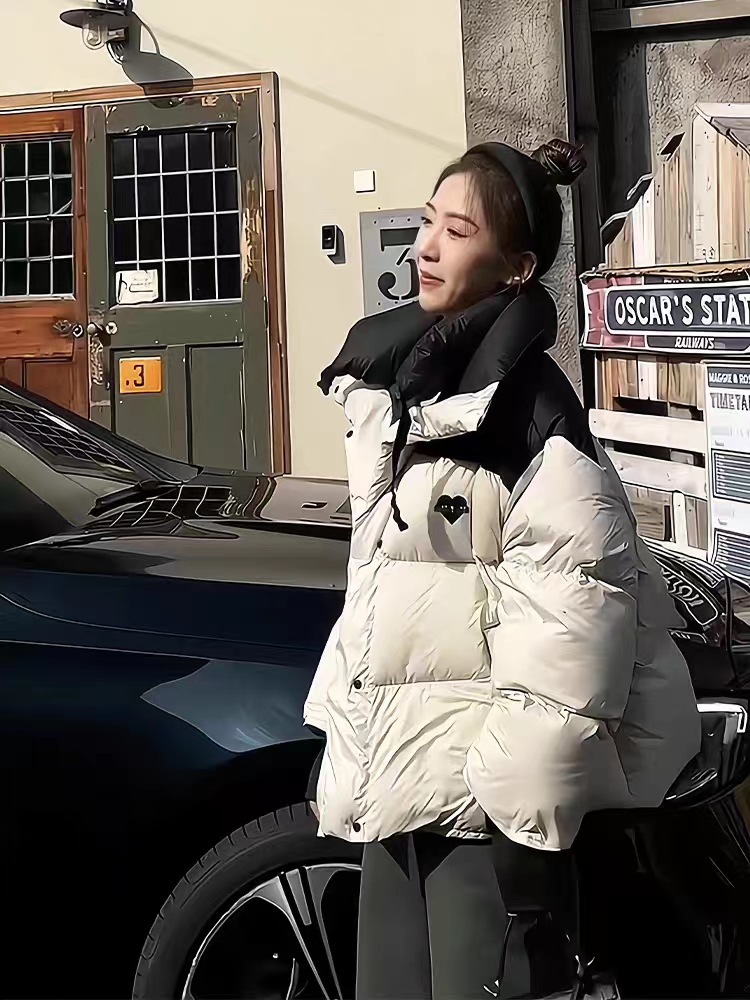 2023冬季新款羽绒服女撞色白鸭绒时尚爱心韩版宽松立领保暖外套