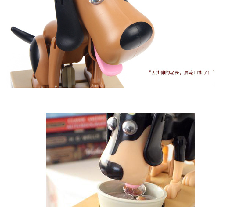 把硬币放在狗盘里面,狗狗就会低头去吃,可是一直吃不到哦,呵呵~~~~都滑到底座里面了!