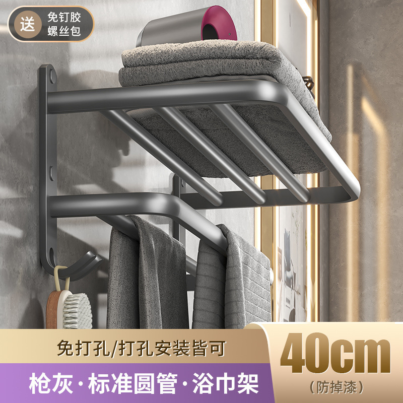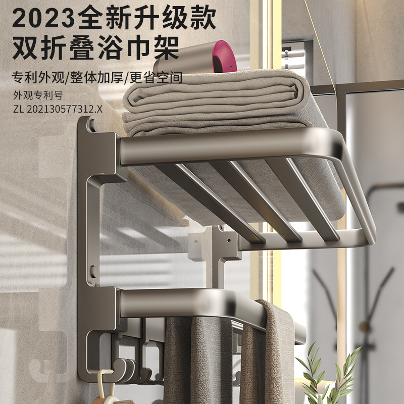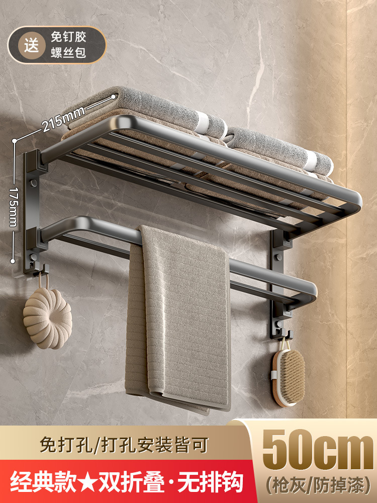 枪灰色折叠毛巾架免打孔卫生间置物架双层浴室厕所浴巾架洗手间