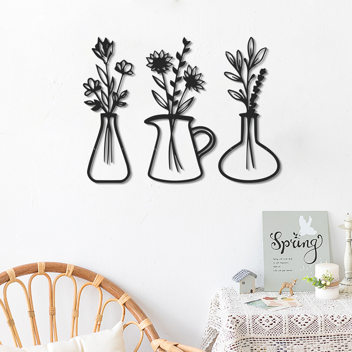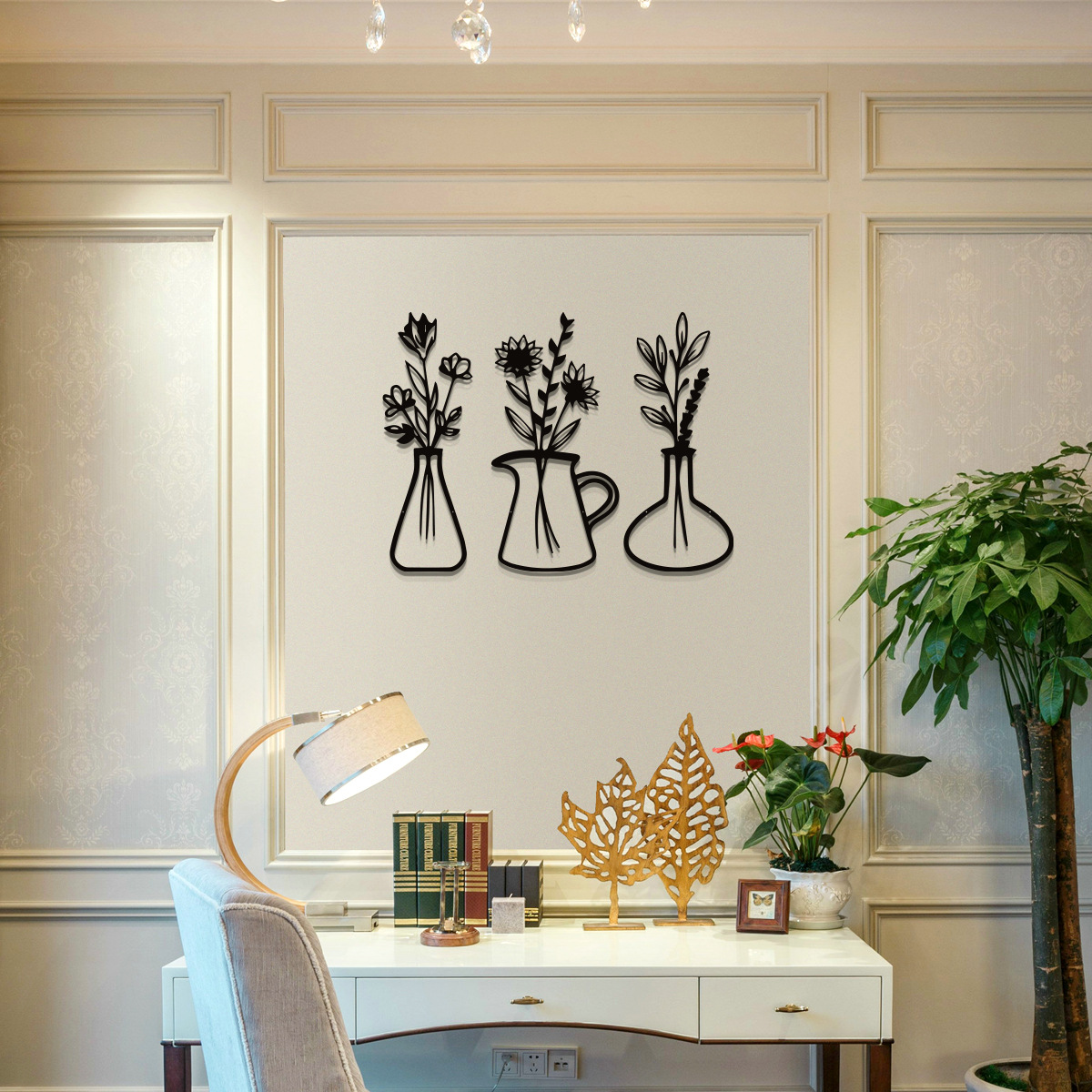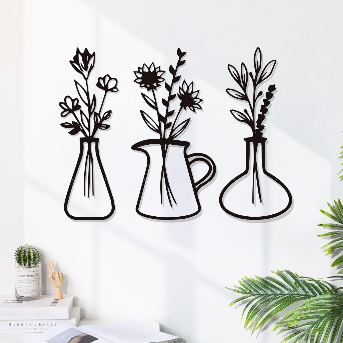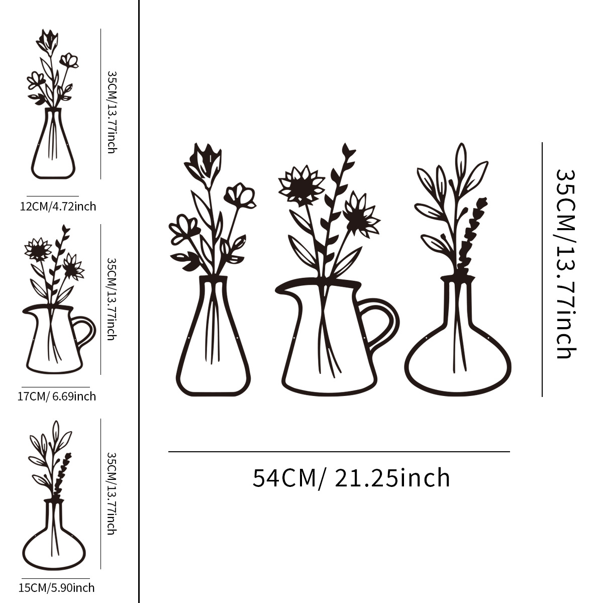 3件金属墙艺术壁挂式花瓶艺术黑色花卉图案墙雕塑艺术品家庭墙