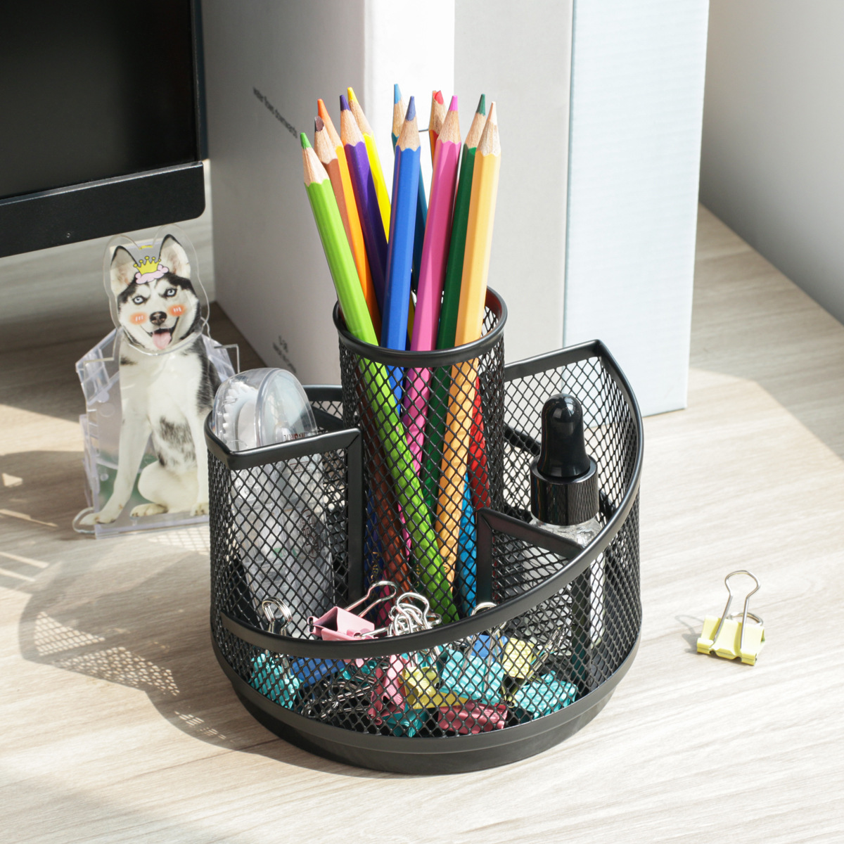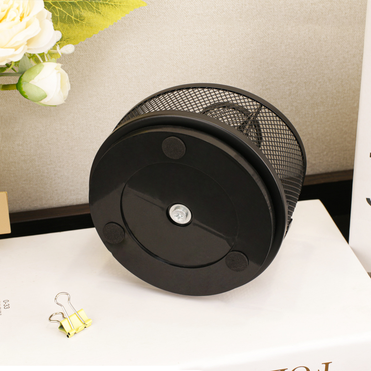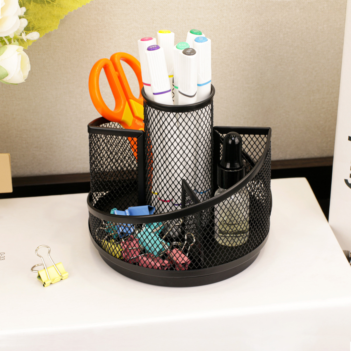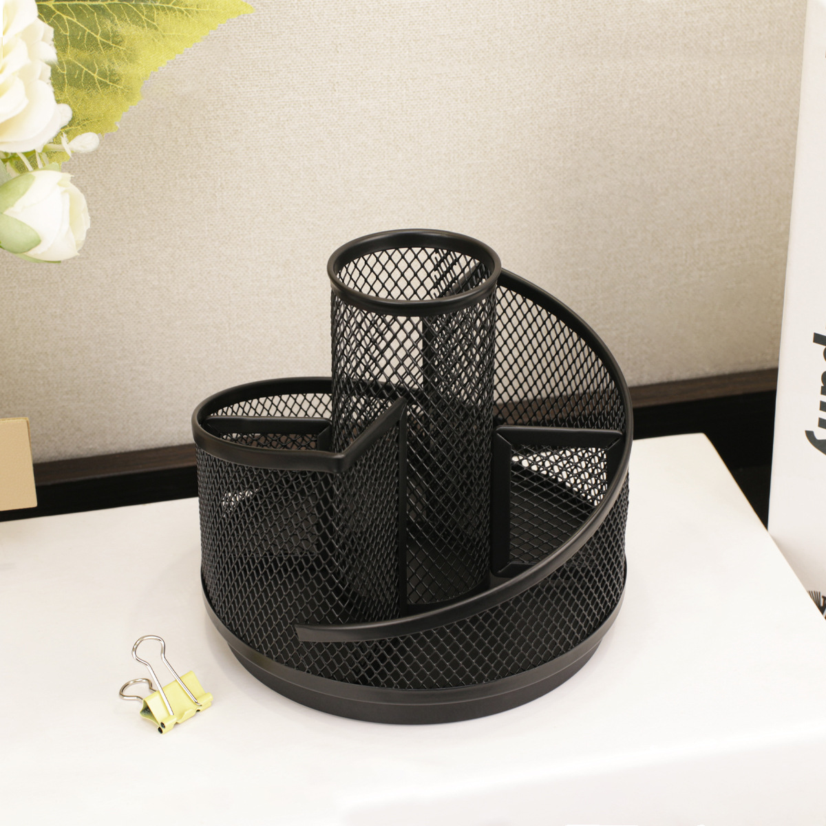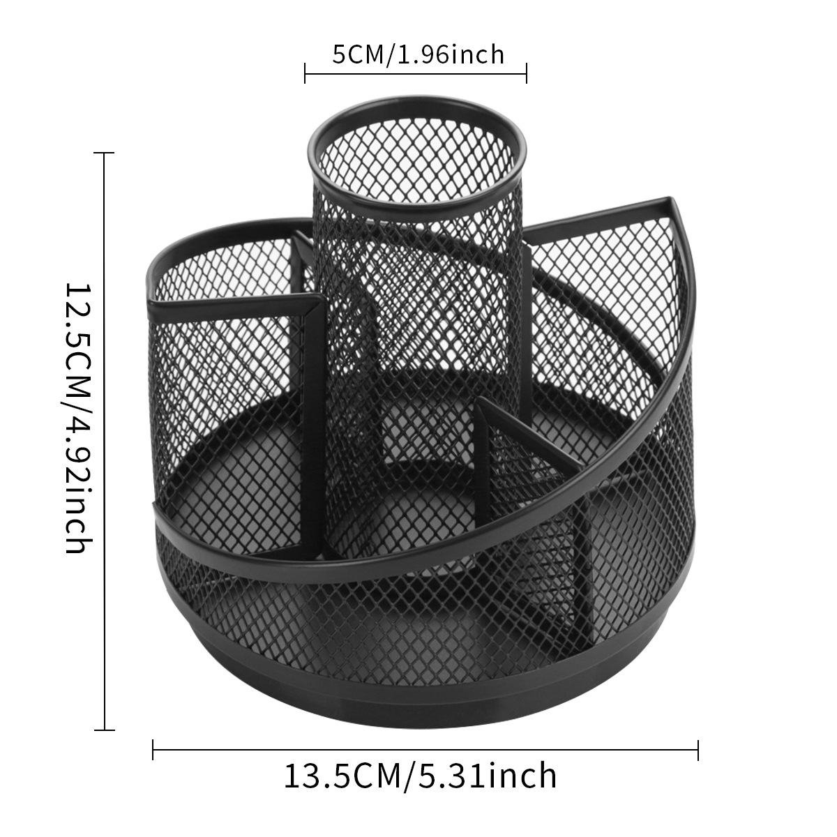 黑色金属旋转笔筒简约五格桌面文具收纳笔筒创意网格笔筒