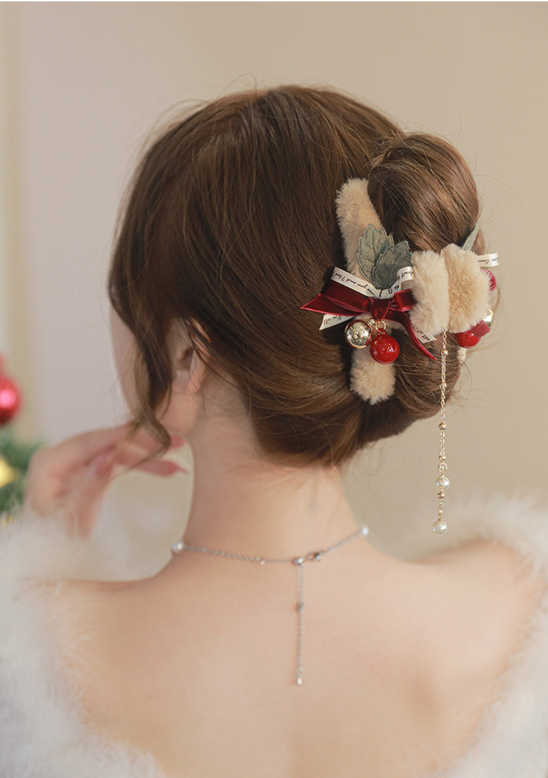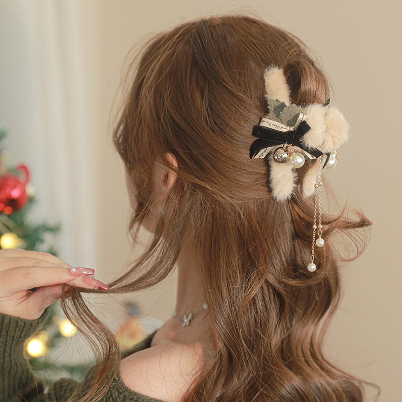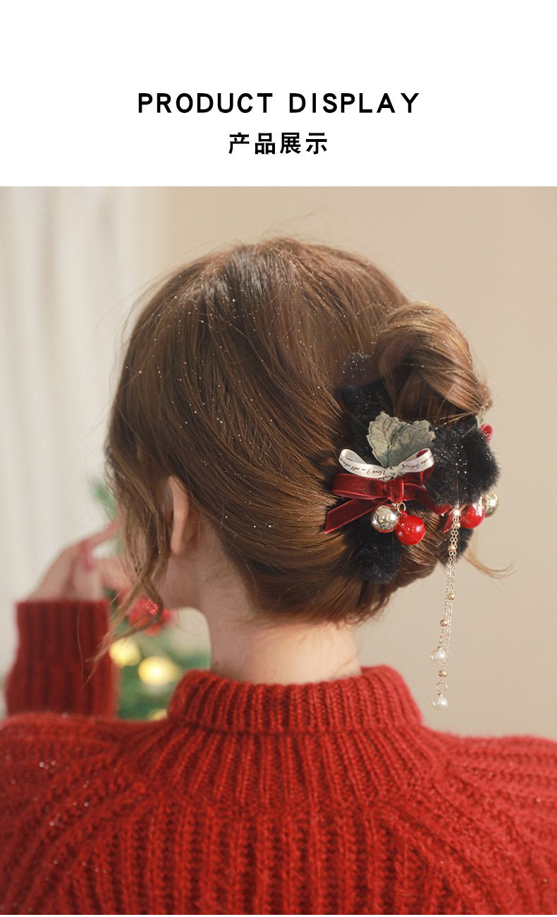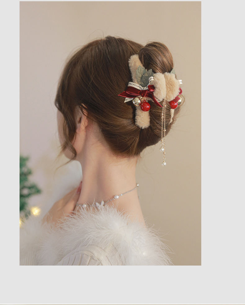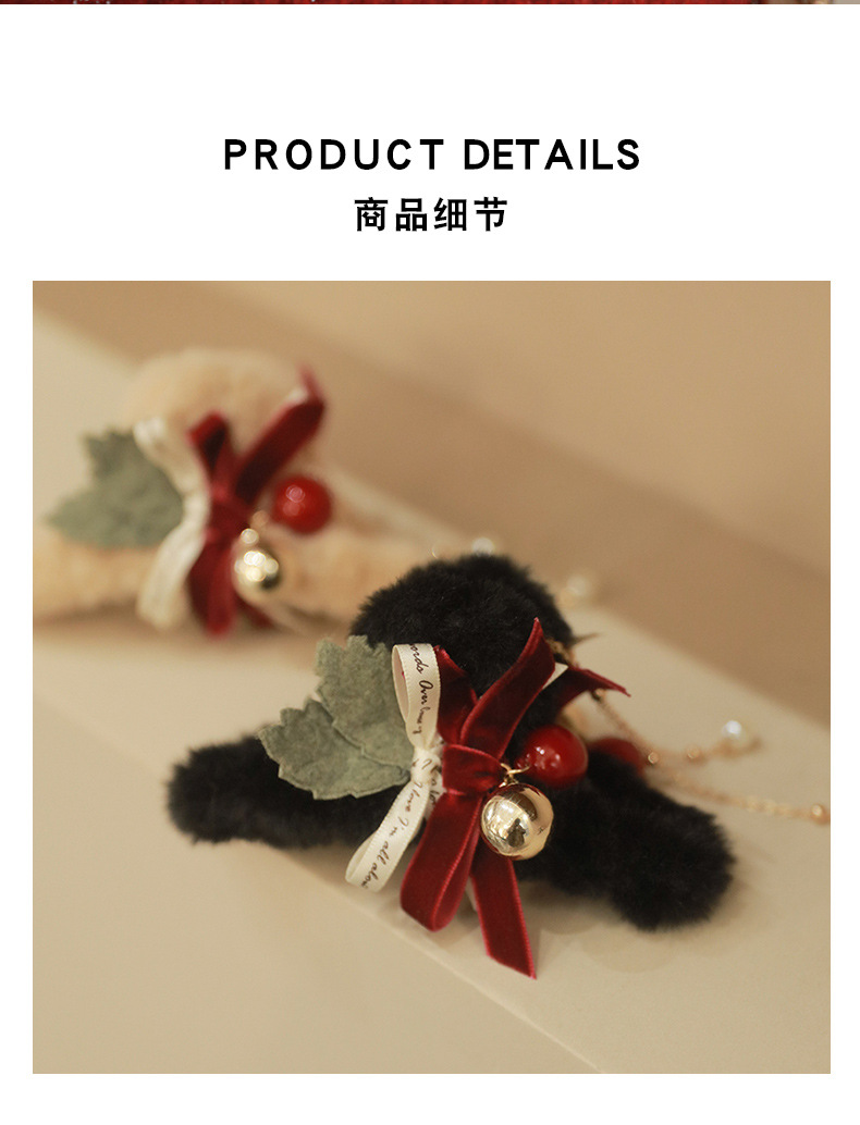 圣诞节气质毛绒抓夹秋冬女后脑勺蝴蝶结流苏头饰发夹鲨鱼夹发饰