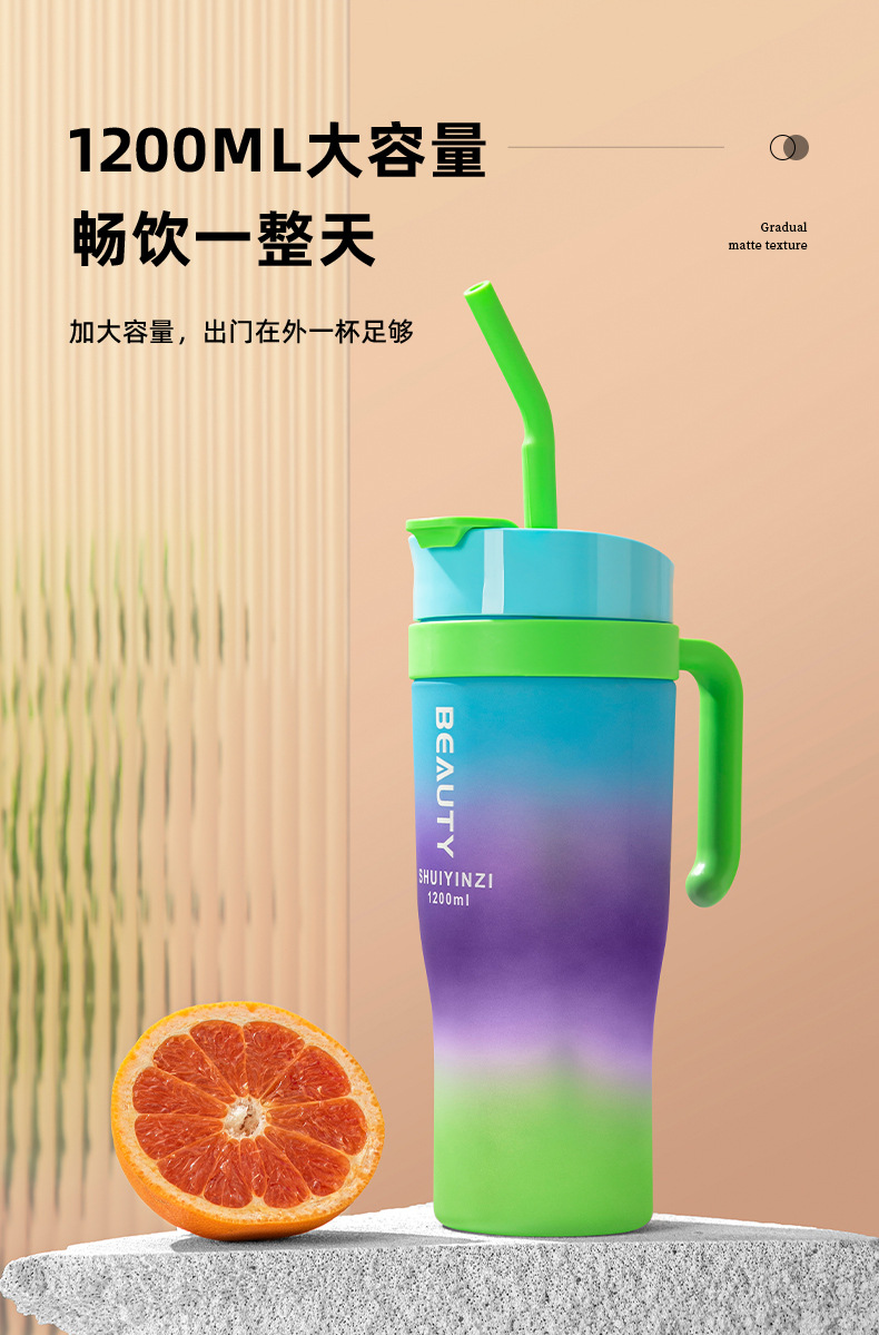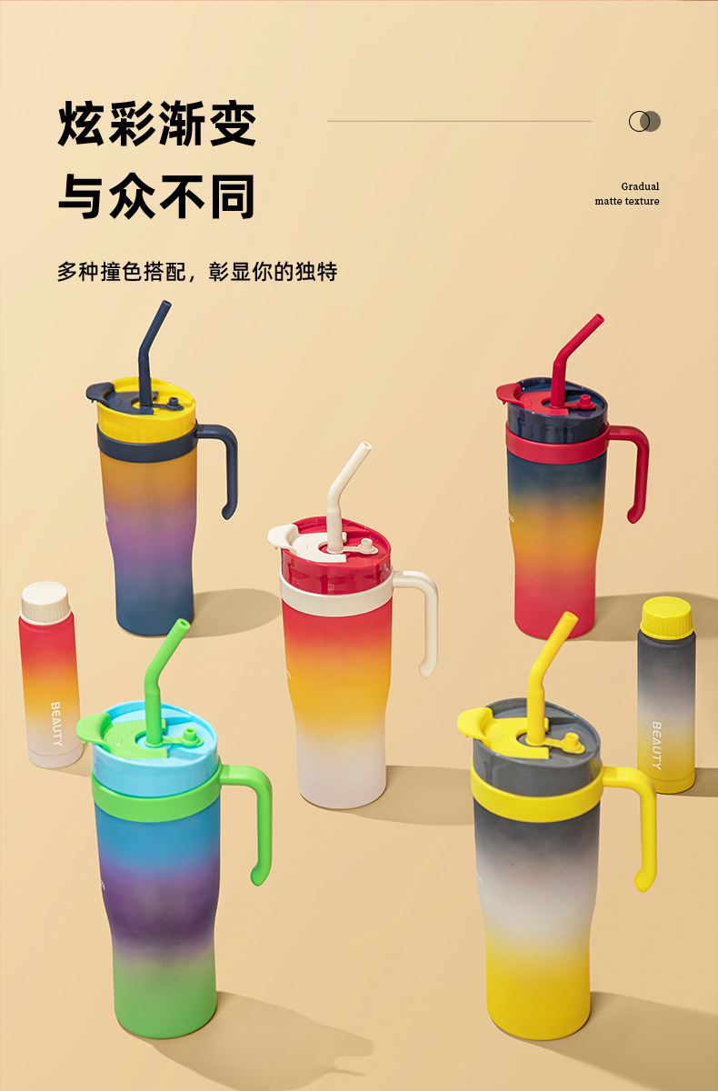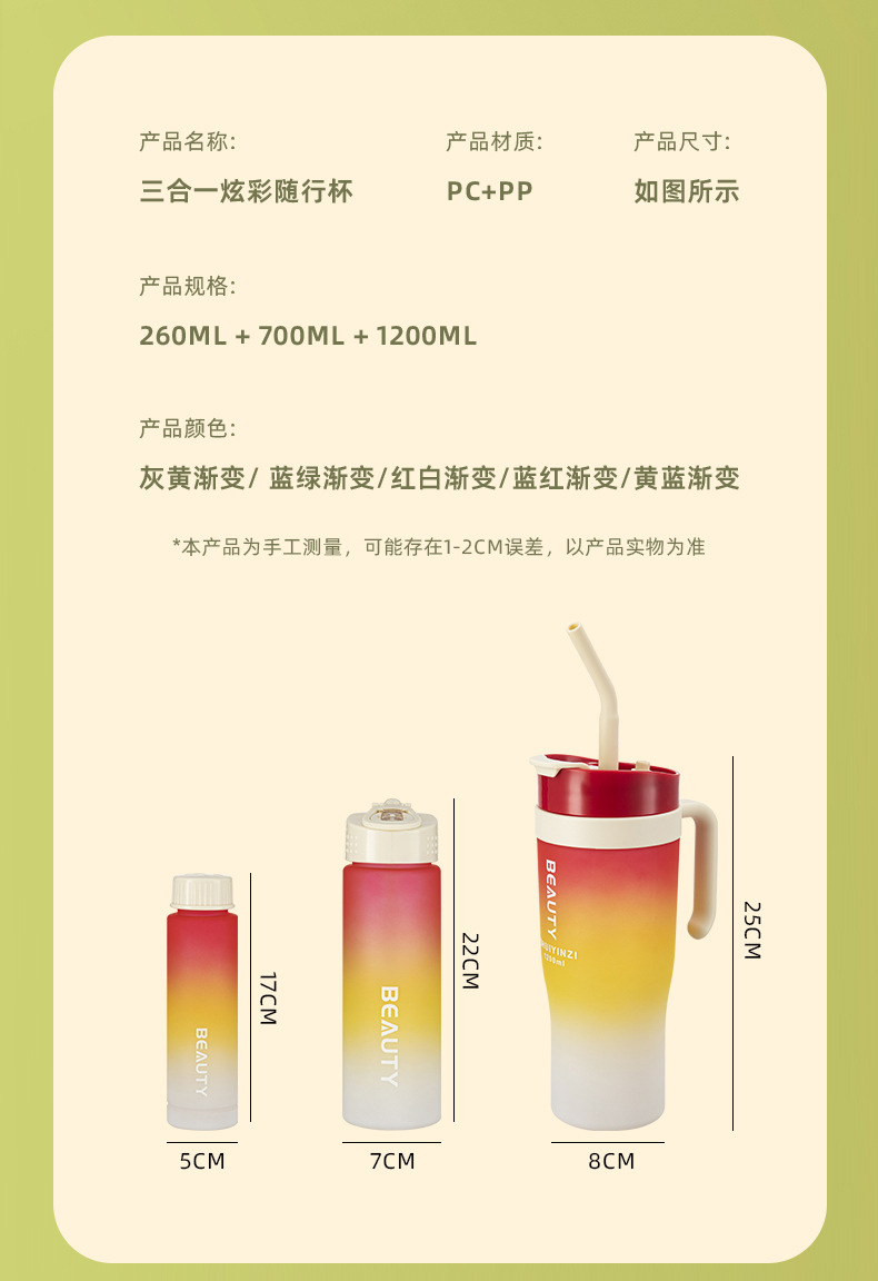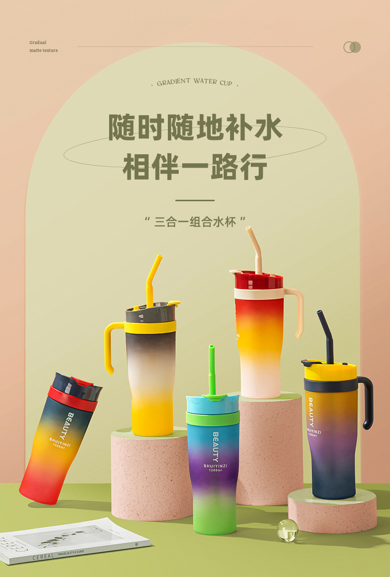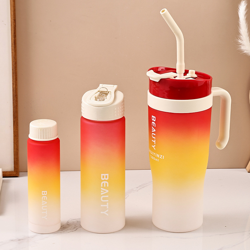 厂家大容量渐变色汽车杯磨砂透明塑料水杯三件套便携吸管杯直饮杯
