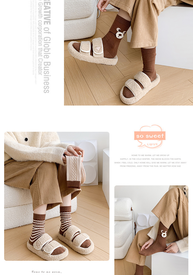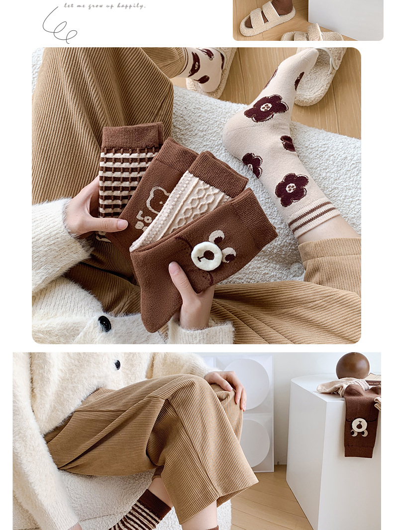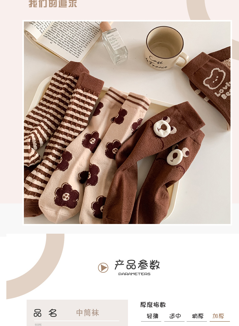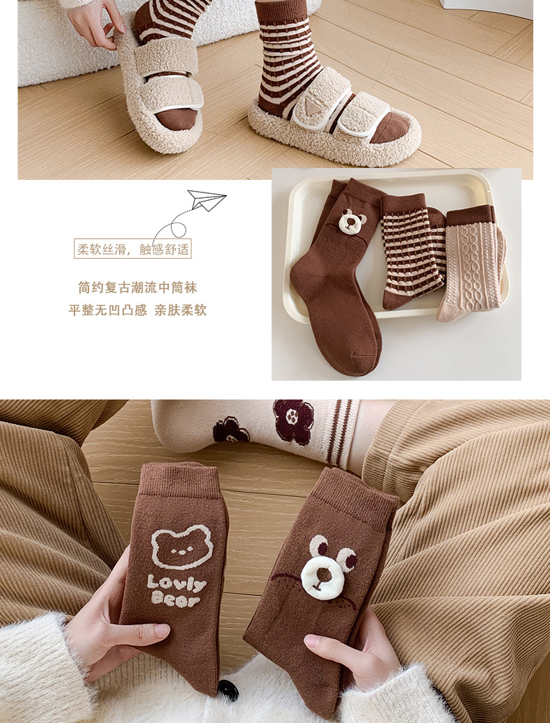 秋冬新款小熊羊绒袜子女中筒袜咖色立体卡通保暖堆堆袜学院风潮袜