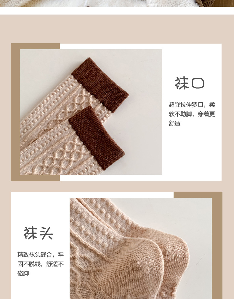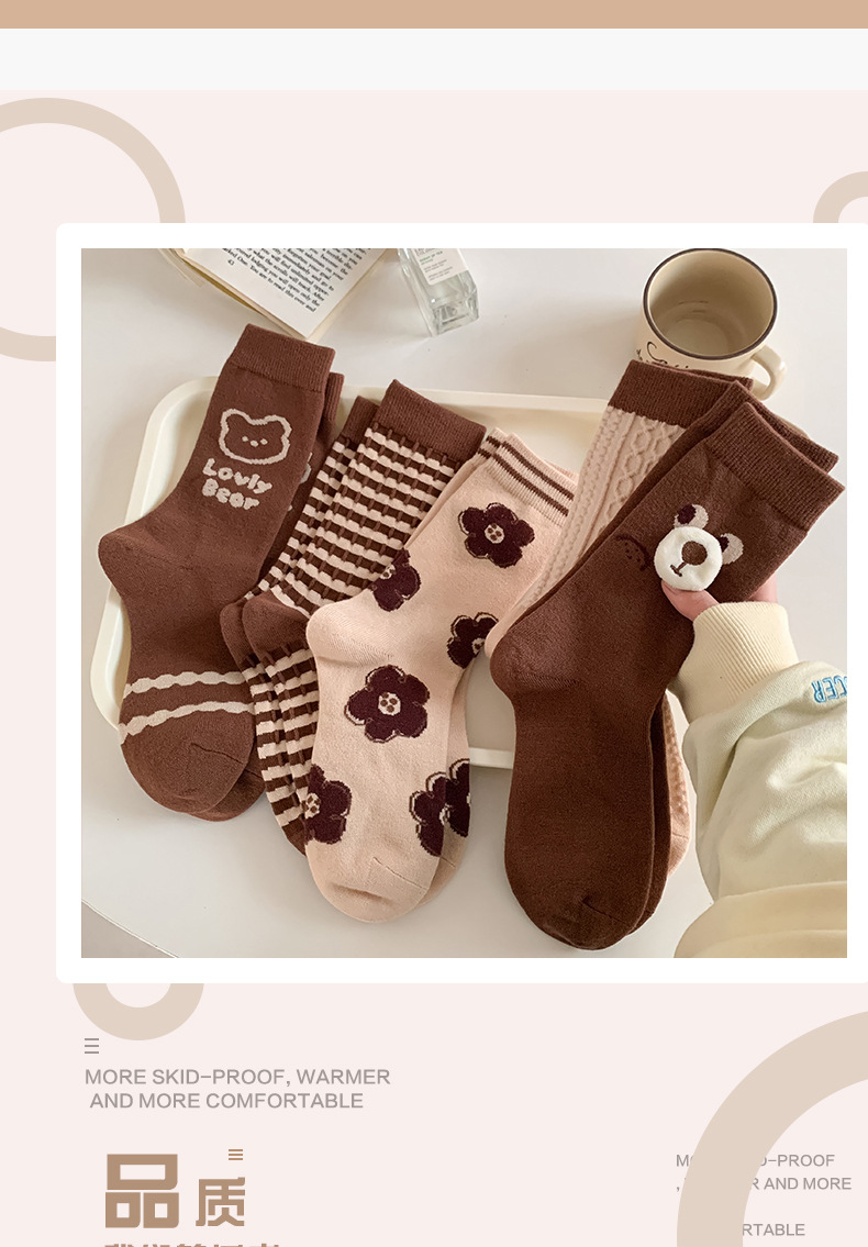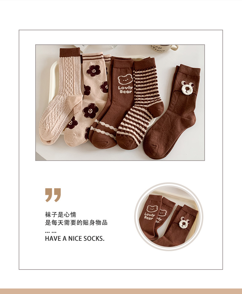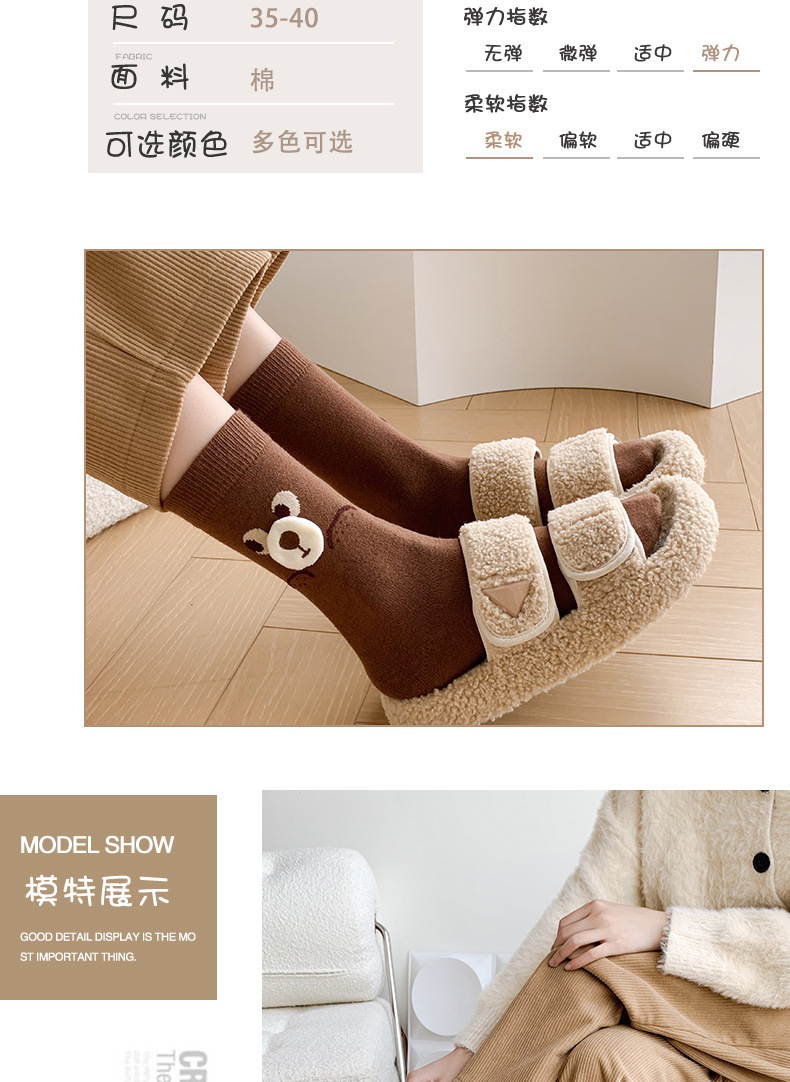 秋冬新款小熊羊绒袜子女中筒袜咖色立体卡通保暖堆堆袜学院风潮袜