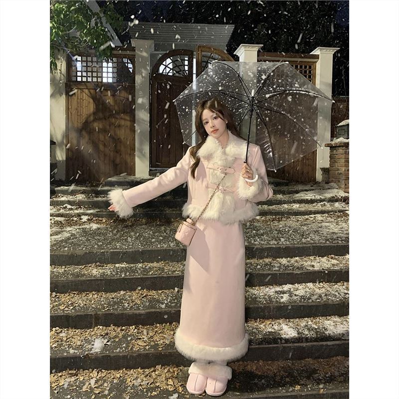 美拉德富家千金加绒加厚麂皮绒外套半身裙女秋季2023新款时尚套装
