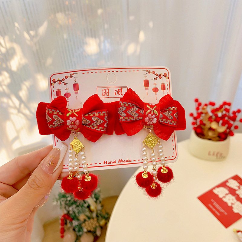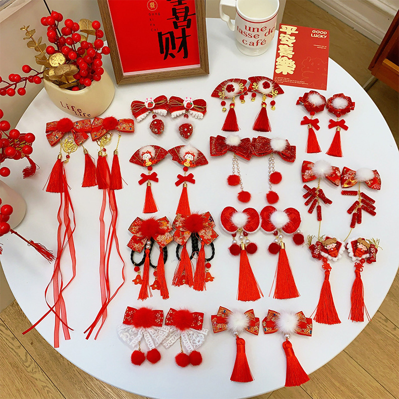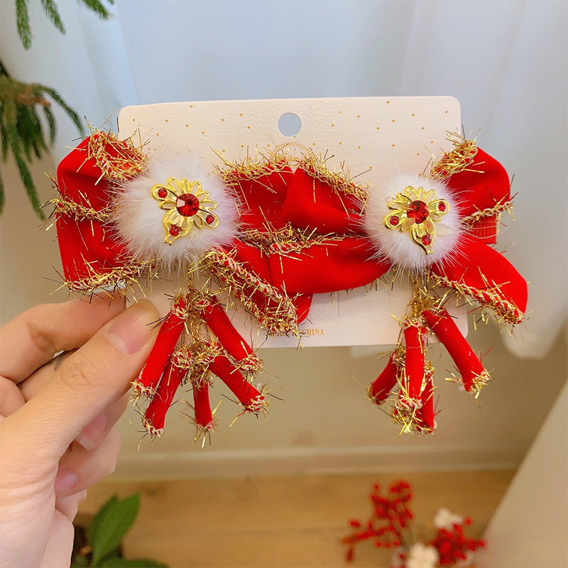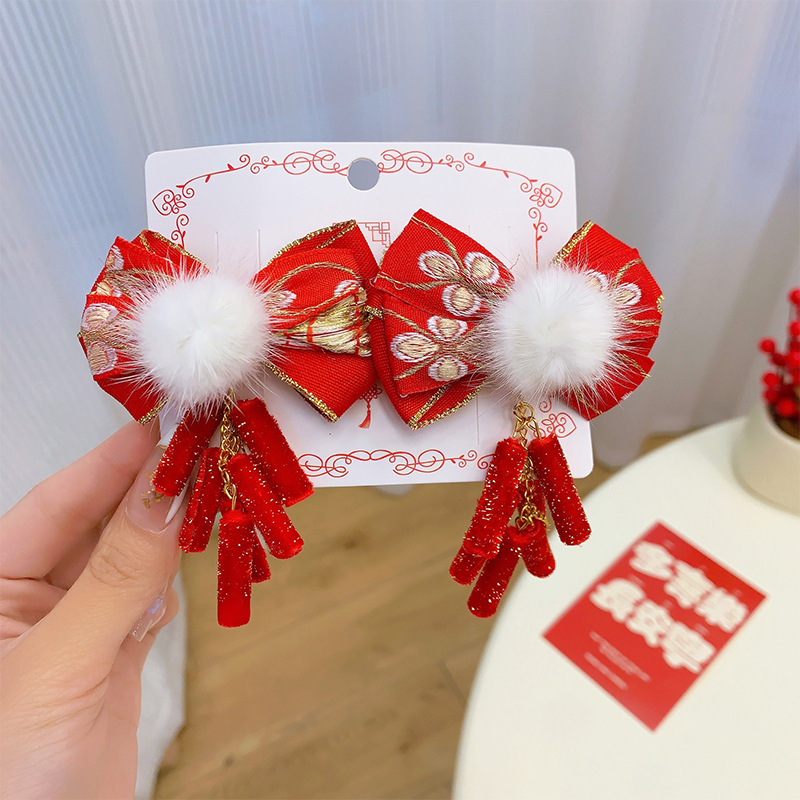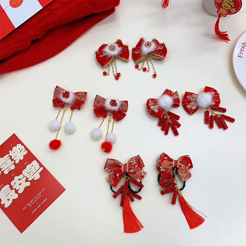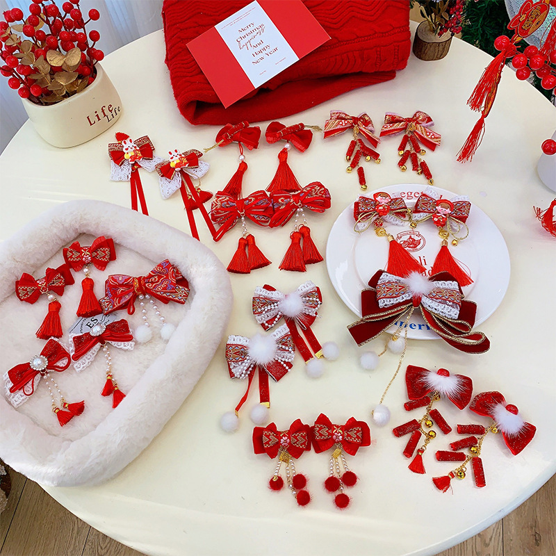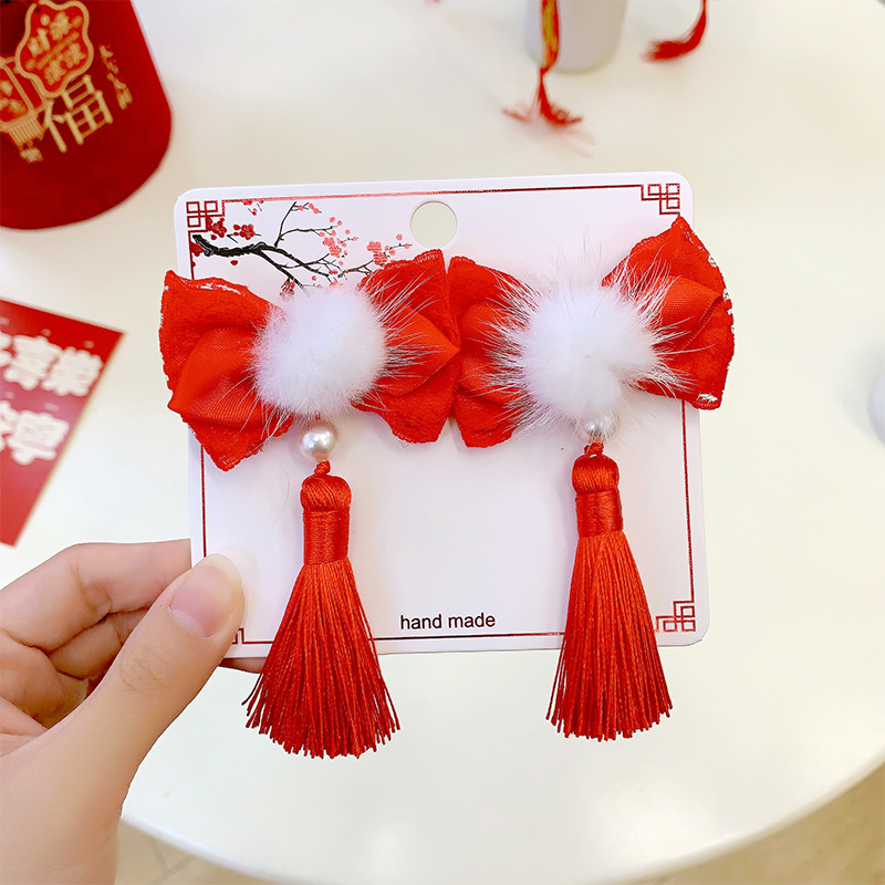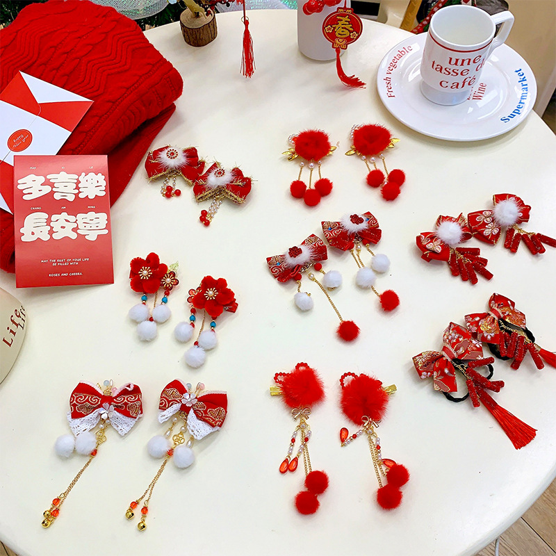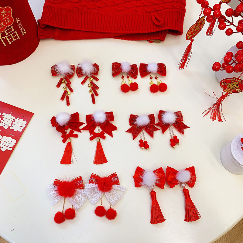 红色新年蝴蝶结发饰可爱儿童毛绒发夹新中式喜庆刘海对夹头饰批发