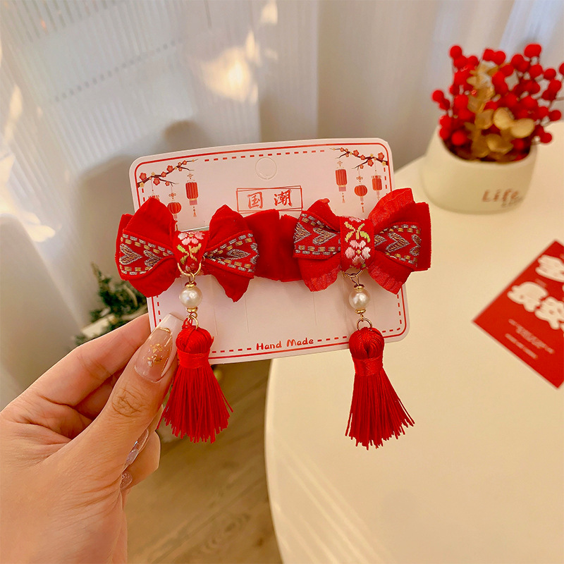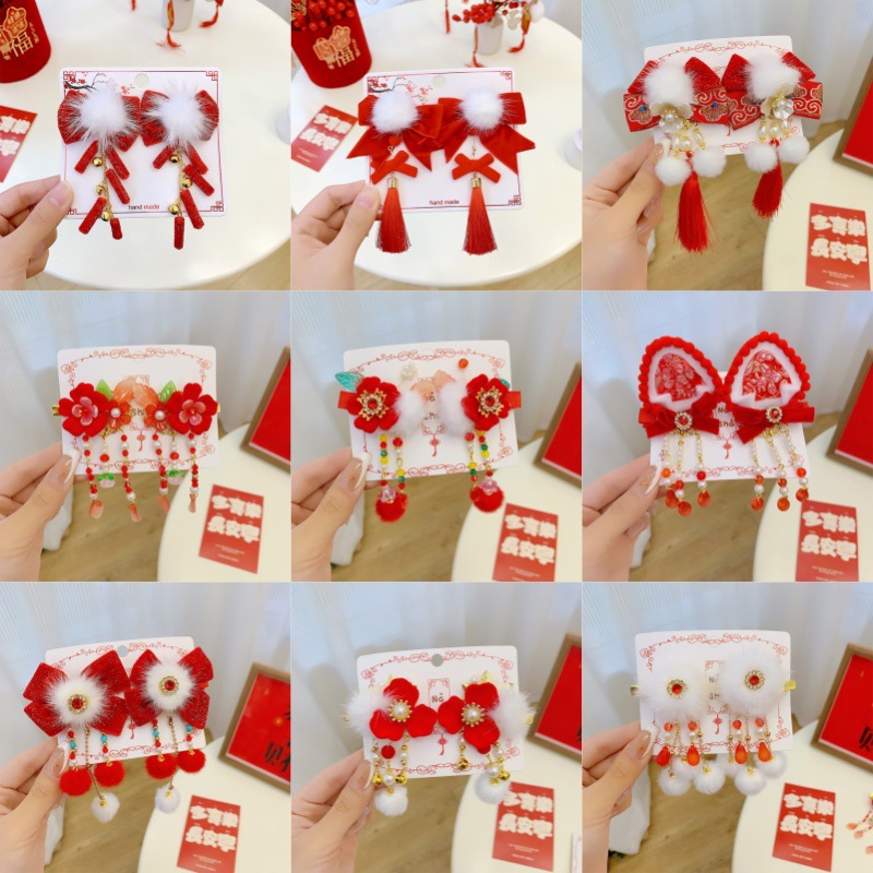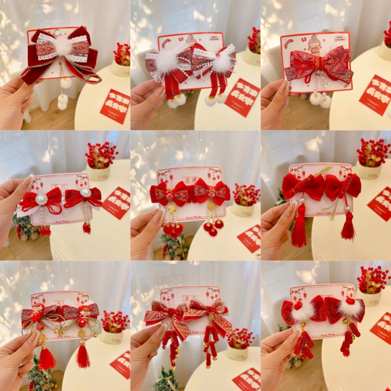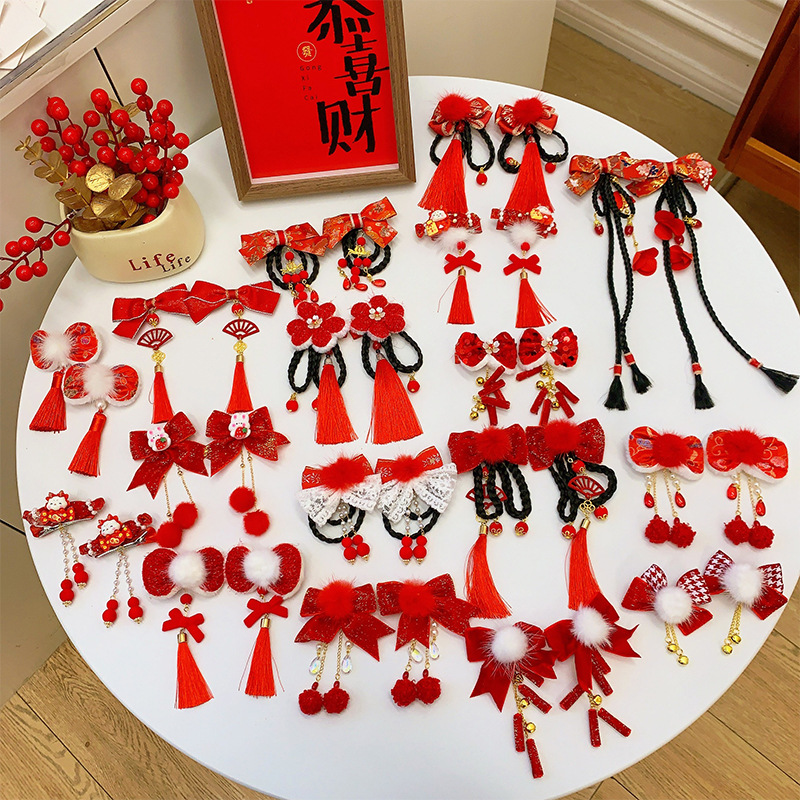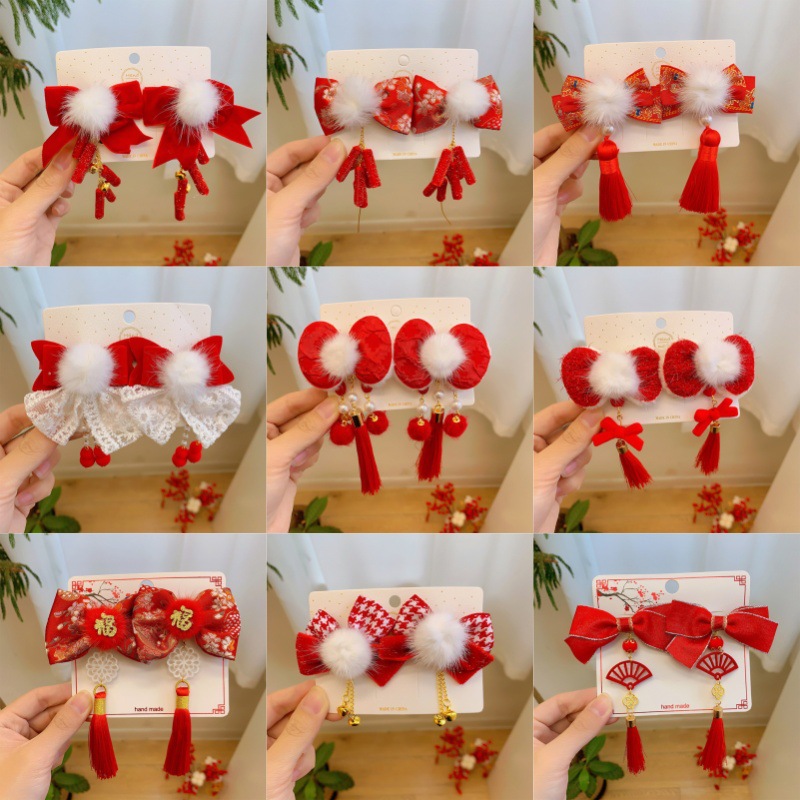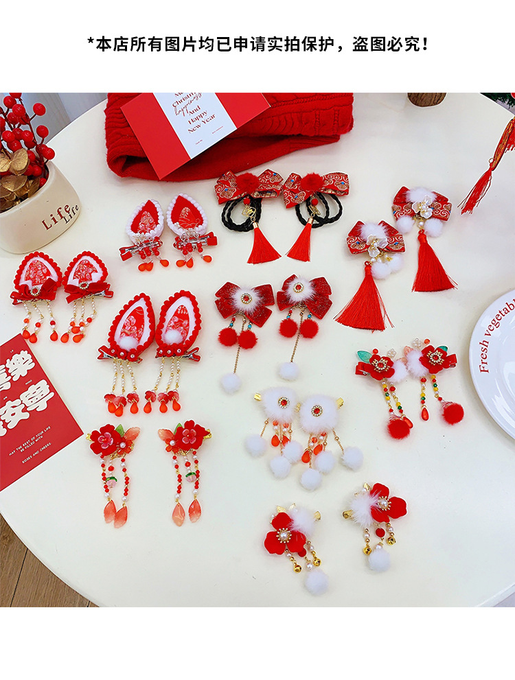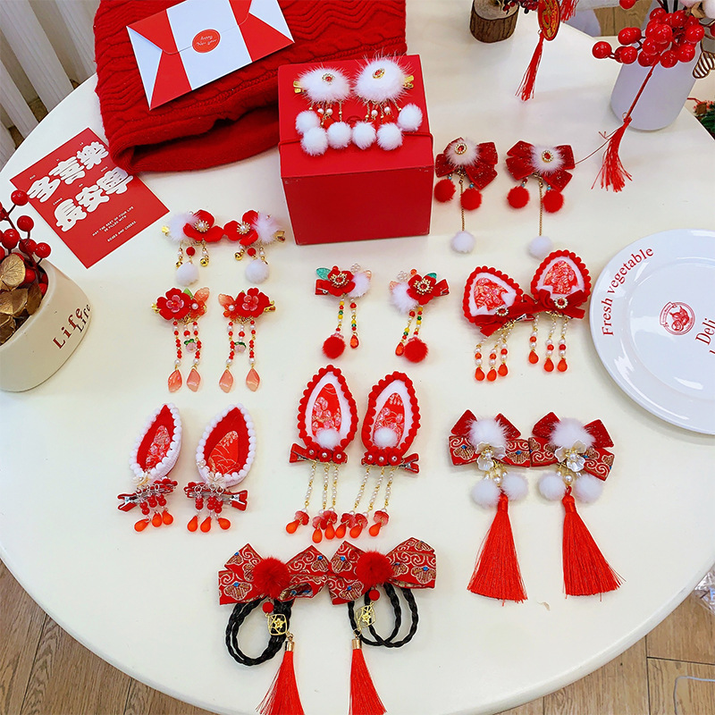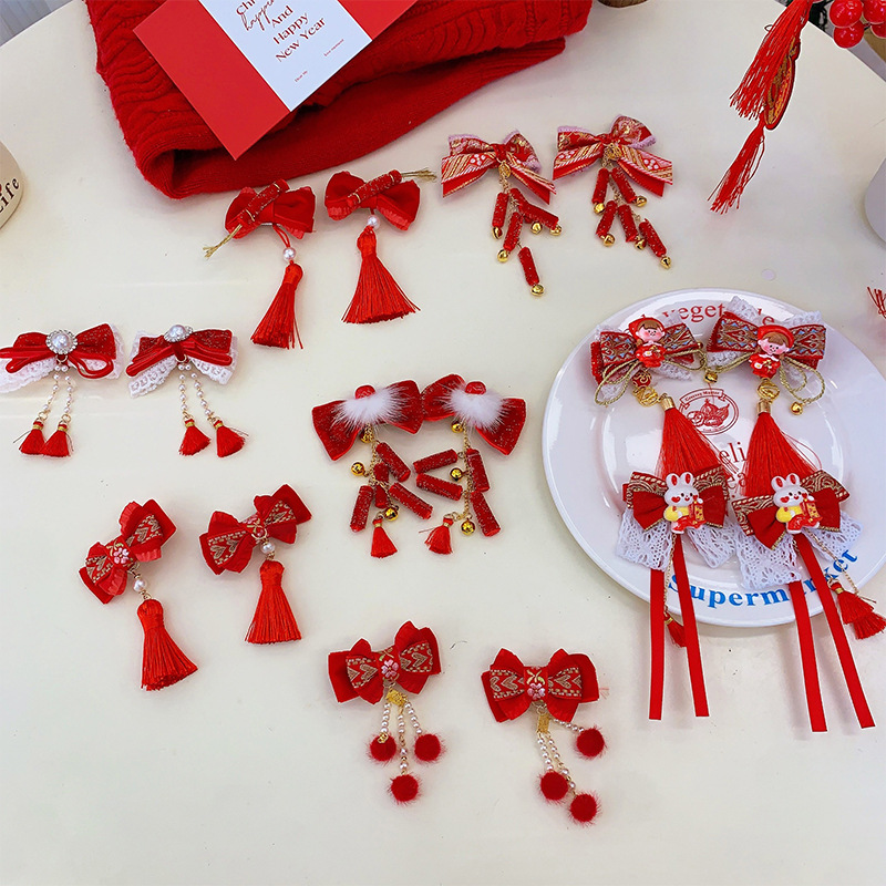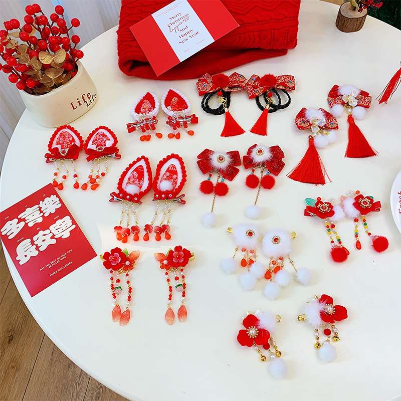 红色新年蝴蝶结发饰可爱儿童毛绒发夹新中式喜庆刘海对夹头饰批发