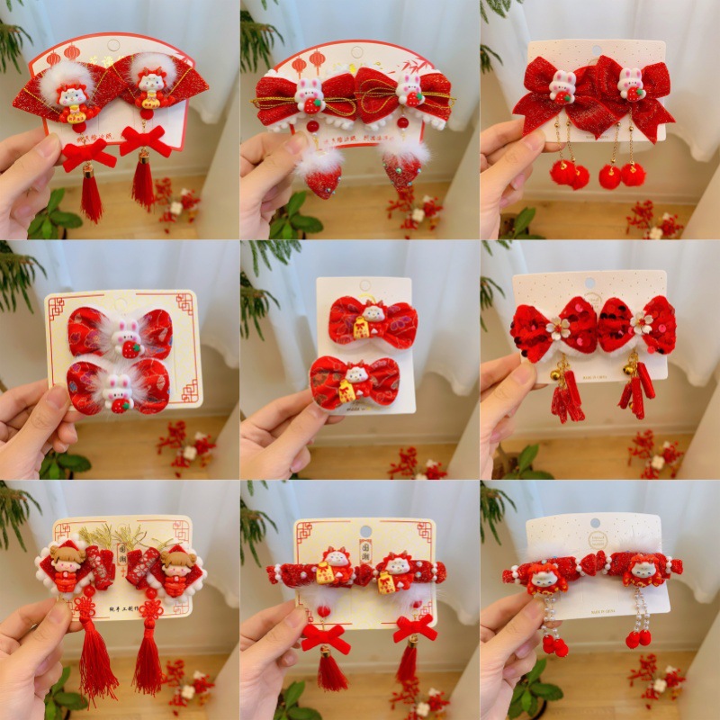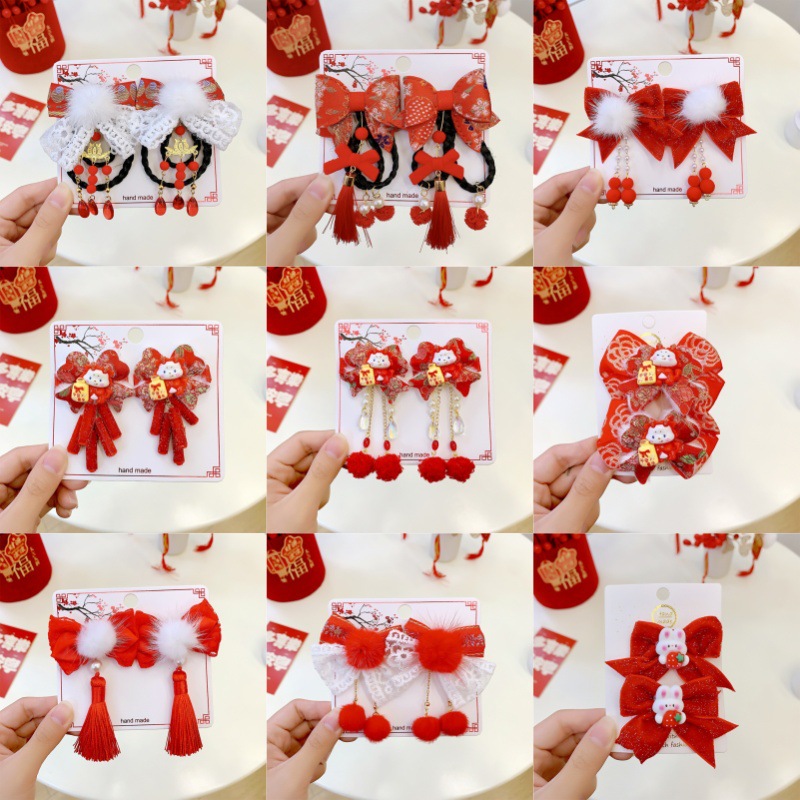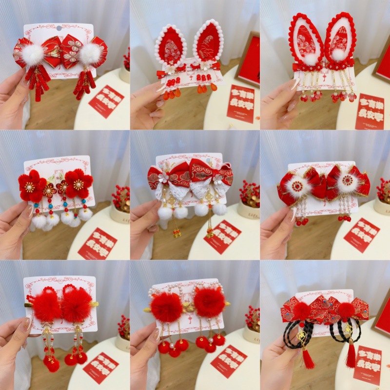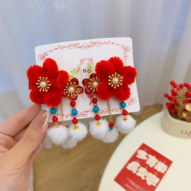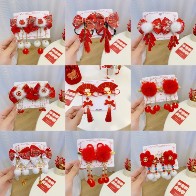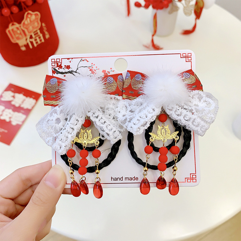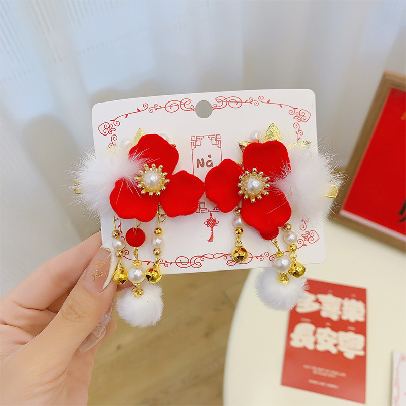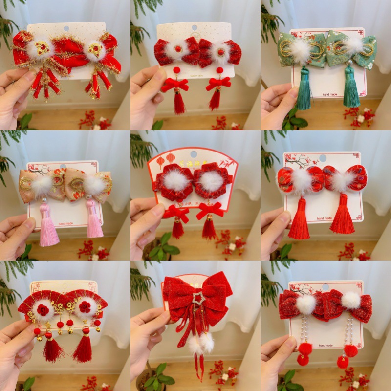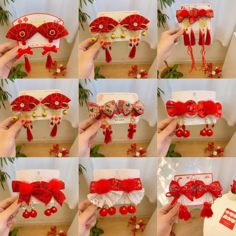 红色新年蝴蝶结发饰可爱儿童毛绒发夹新中式喜庆刘海对夹头饰批发