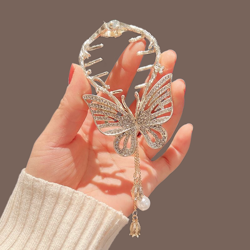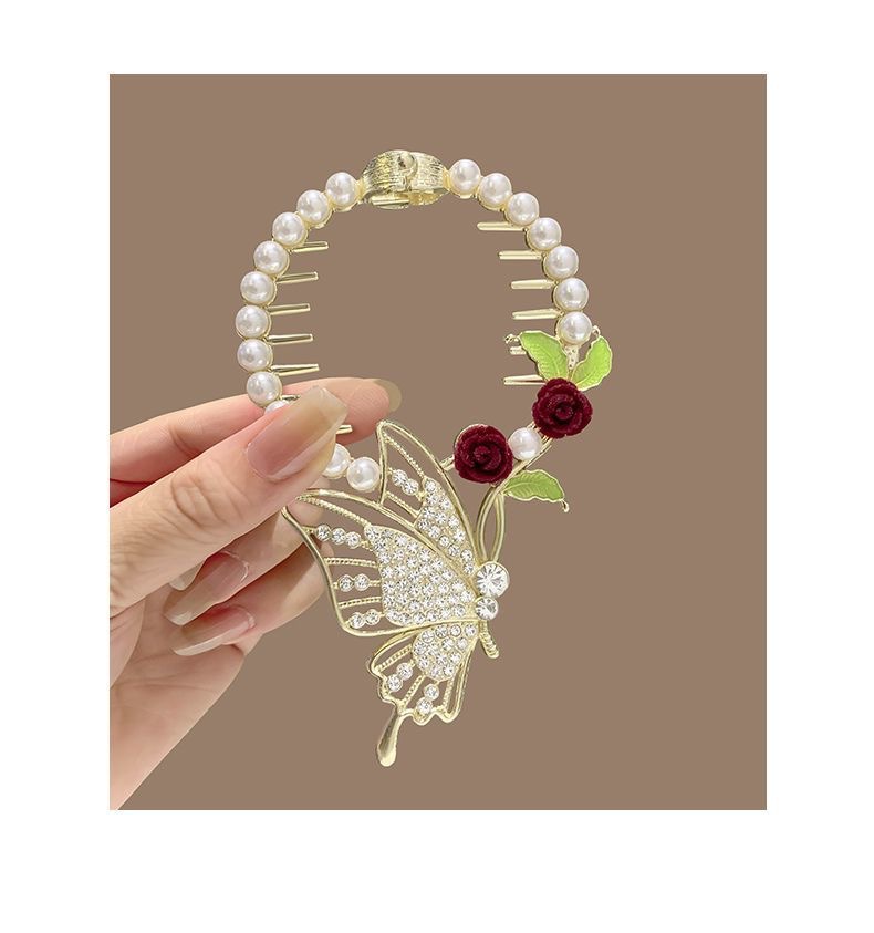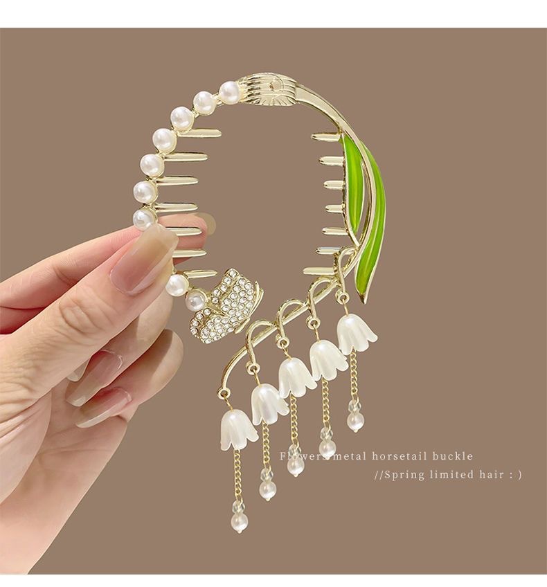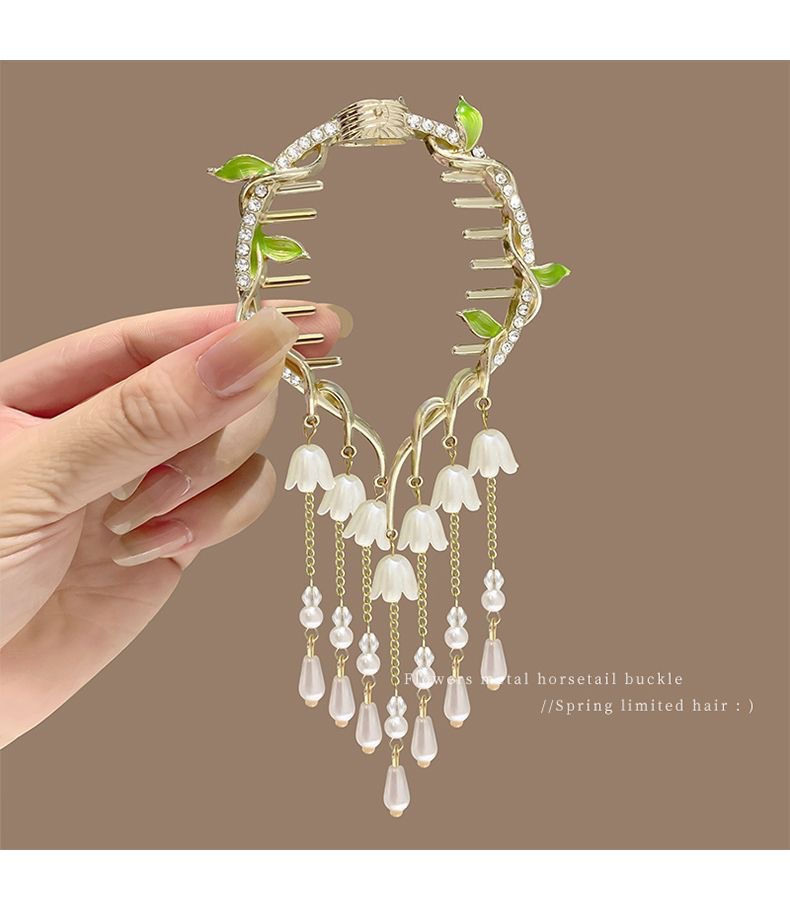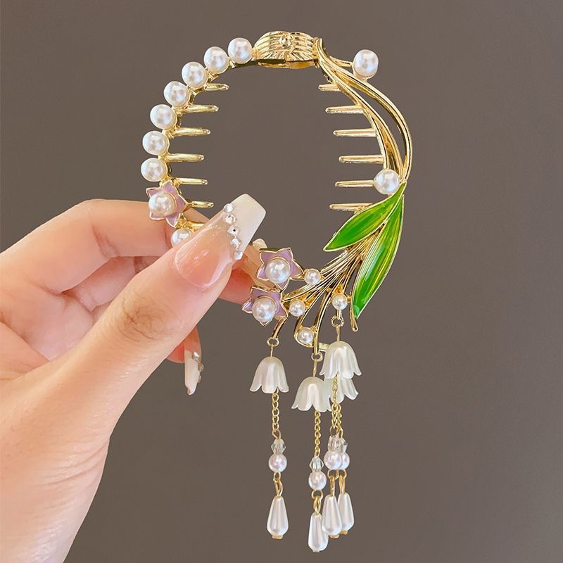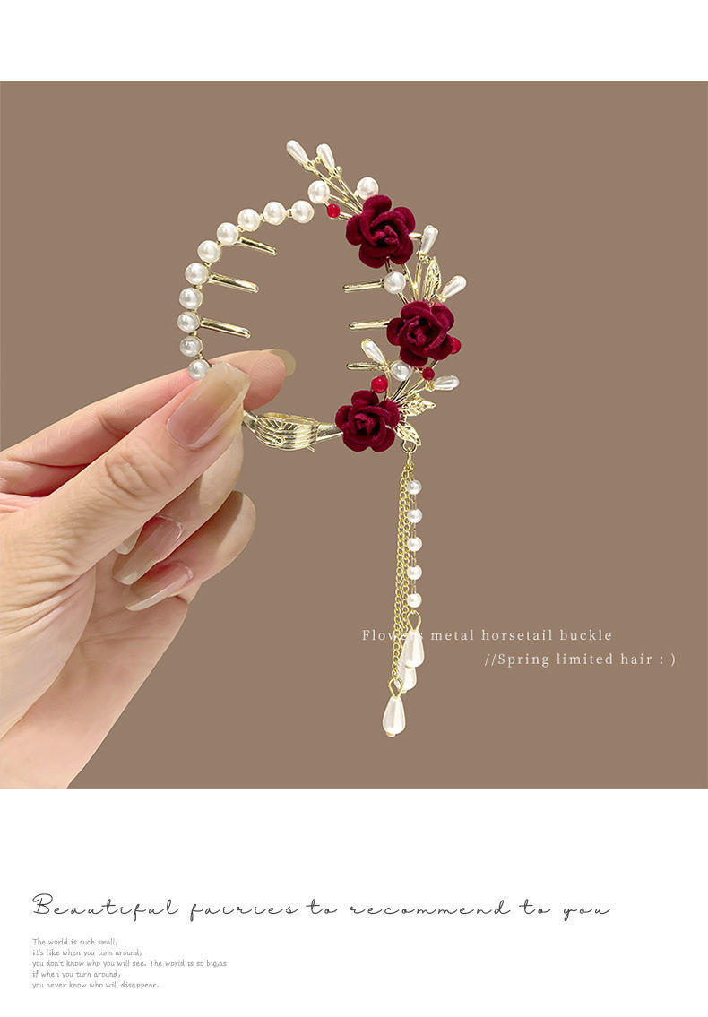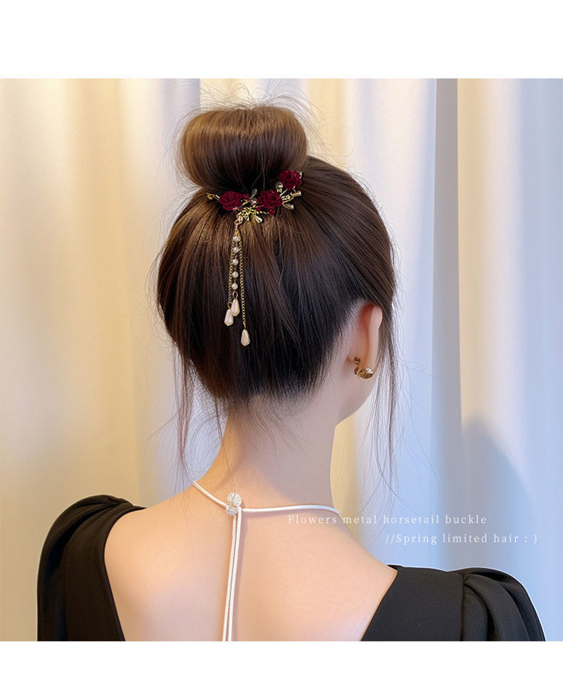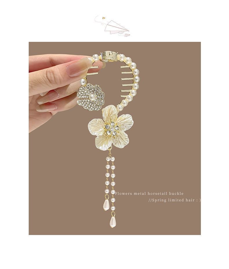 流苏珍珠花朵发夹后脑勺盘发抓夹女高级感丸子头发饰2023年新款