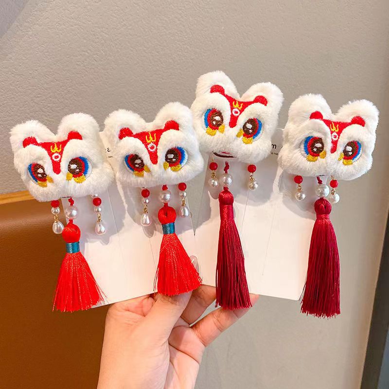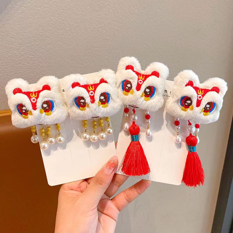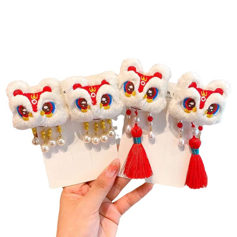 毛绒醒狮流苏发夹儿童喜庆新年发夹头饰女宝宝过年拜年发卡子发饰