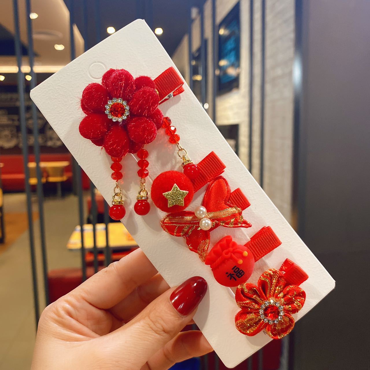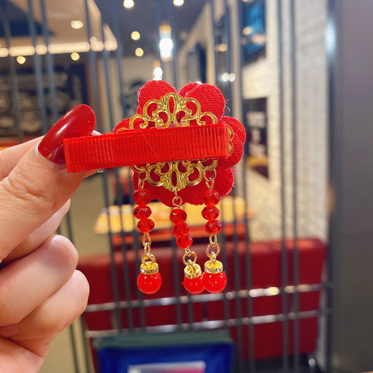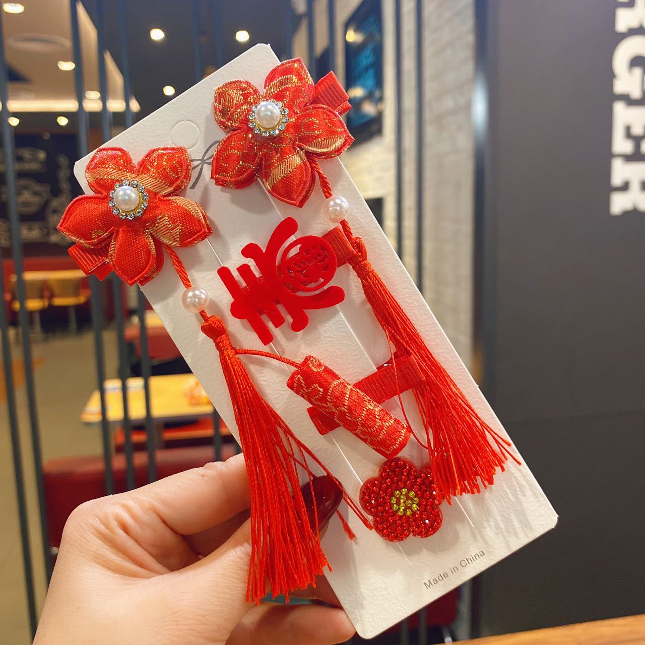 新年款少女发夹套装中国风流苏鸭嘴夹发卡拜年喜庆大红色侧边夹女