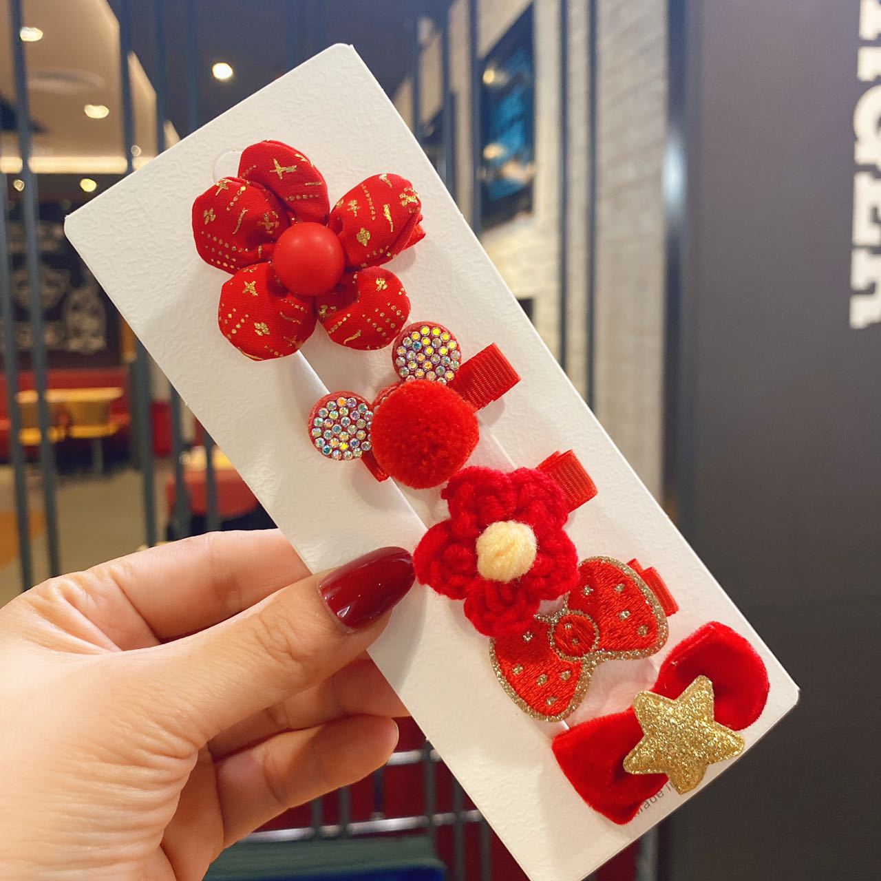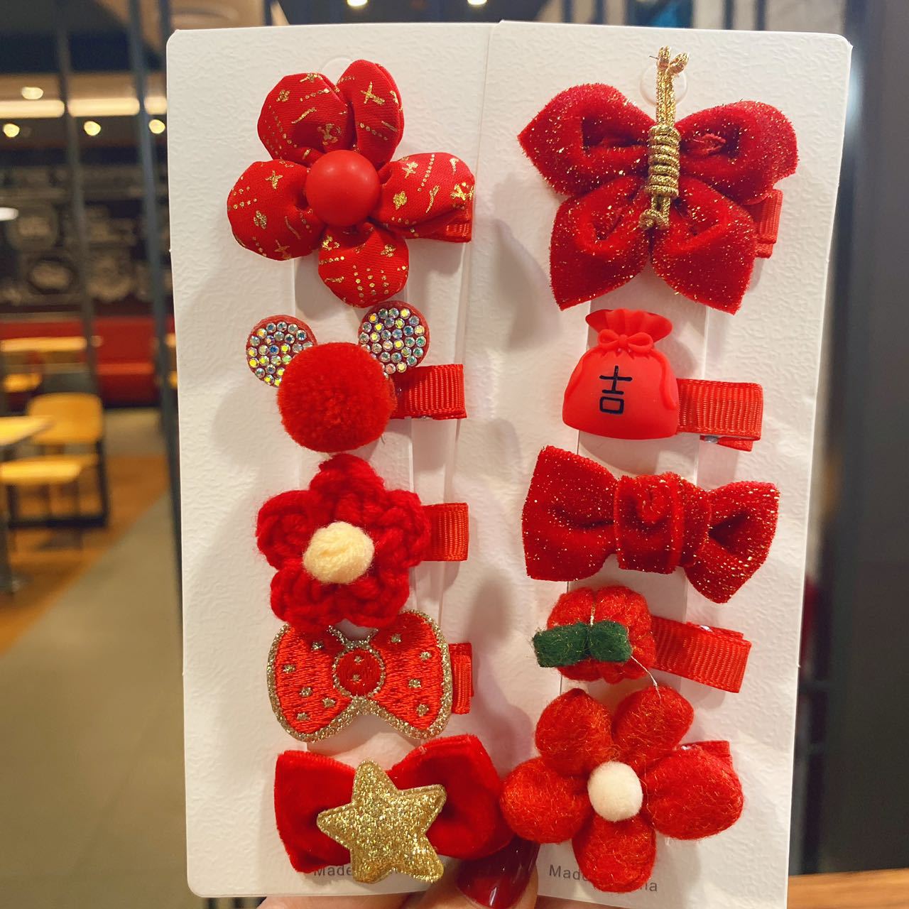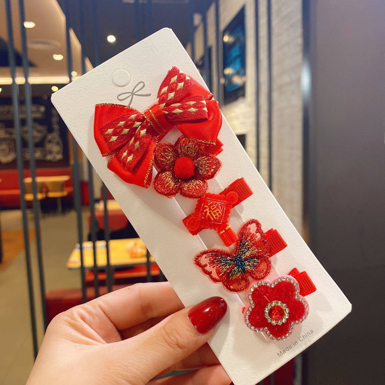 新年款少女发夹套装中国风流苏鸭嘴夹发卡拜年喜庆大红色侧边夹女