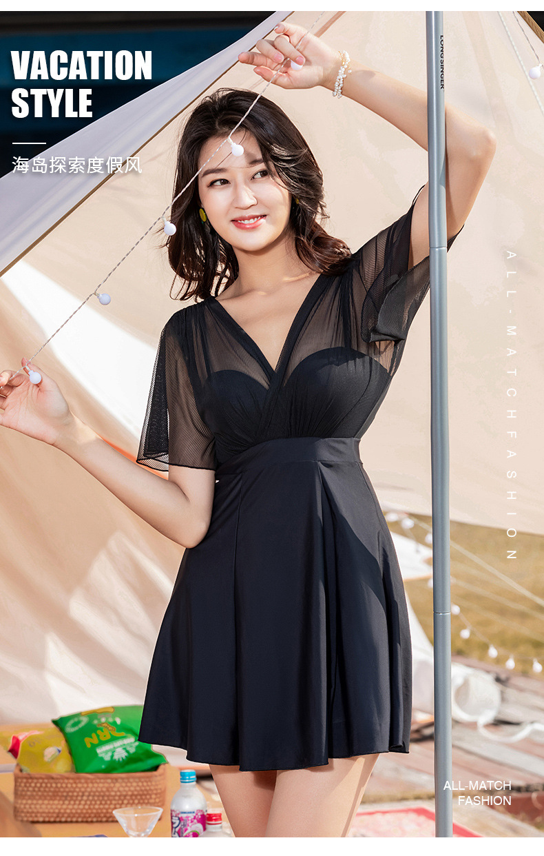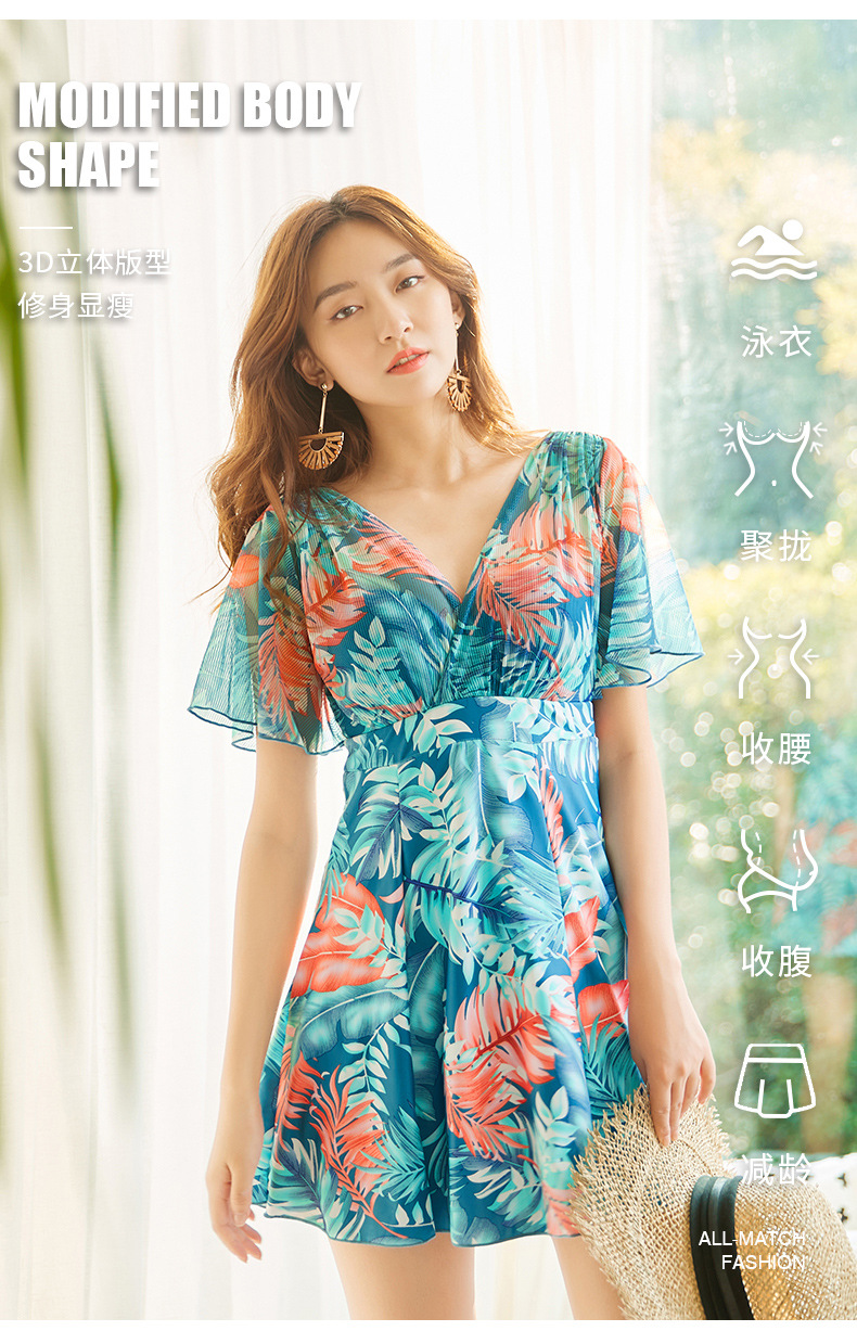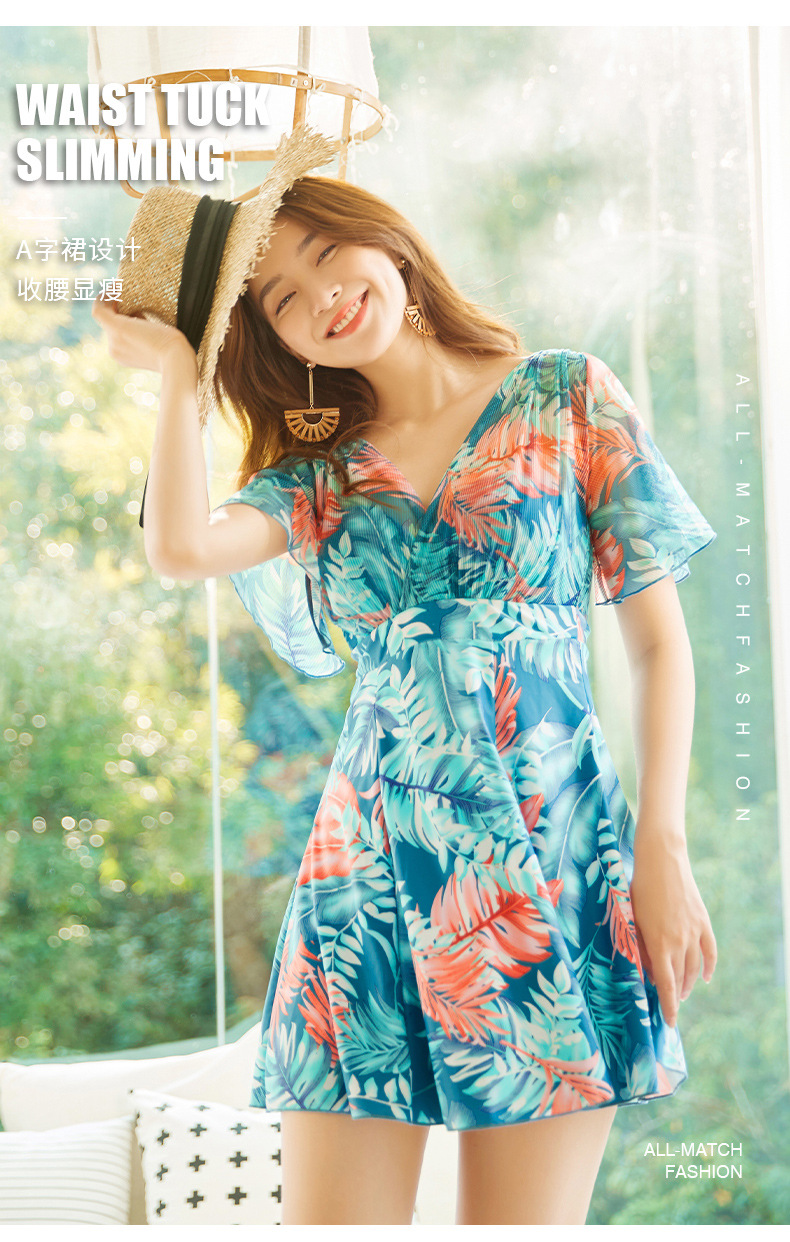 大码女式泳衣ins风印花显瘦遮肩保守温泉连体裙泳装沙滩度假新款