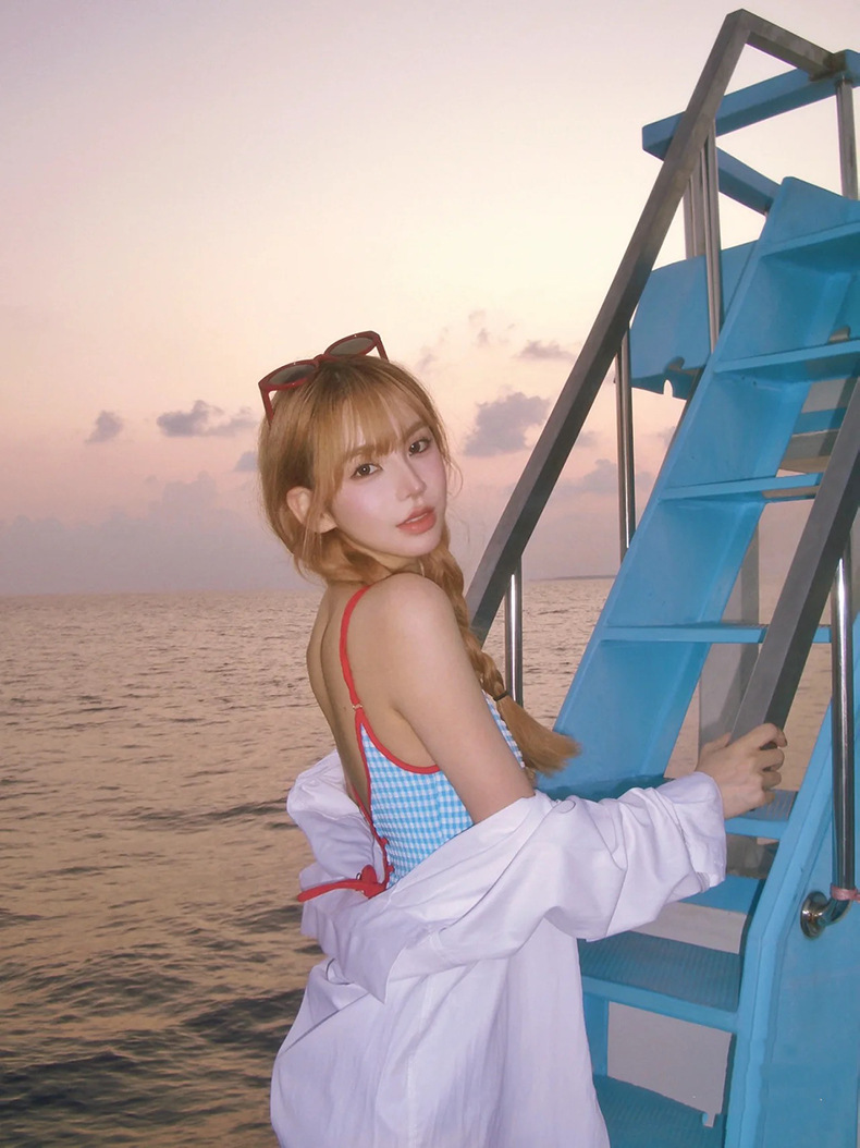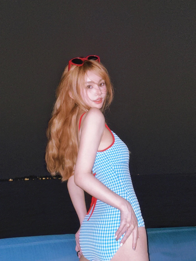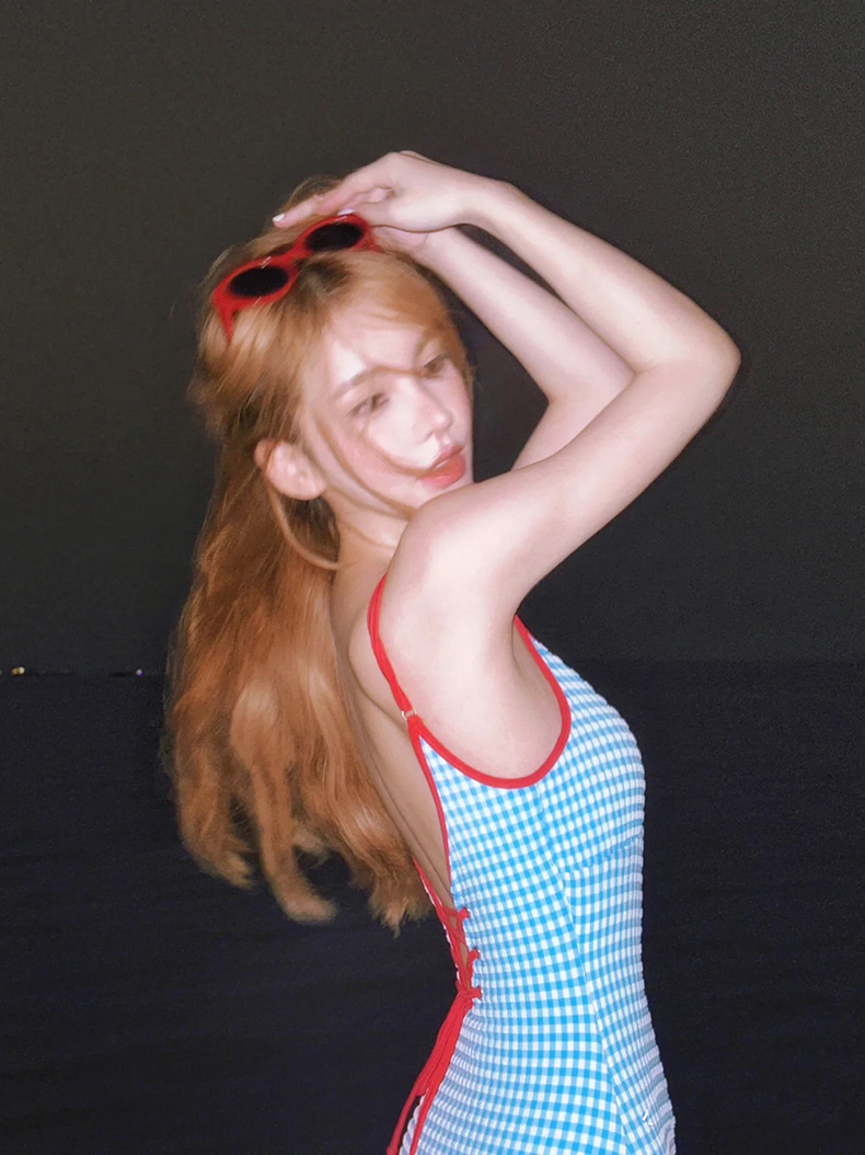 纯欲小香风可爱少女甜美格子性感露背简约连体游泳衣女swimsuit
