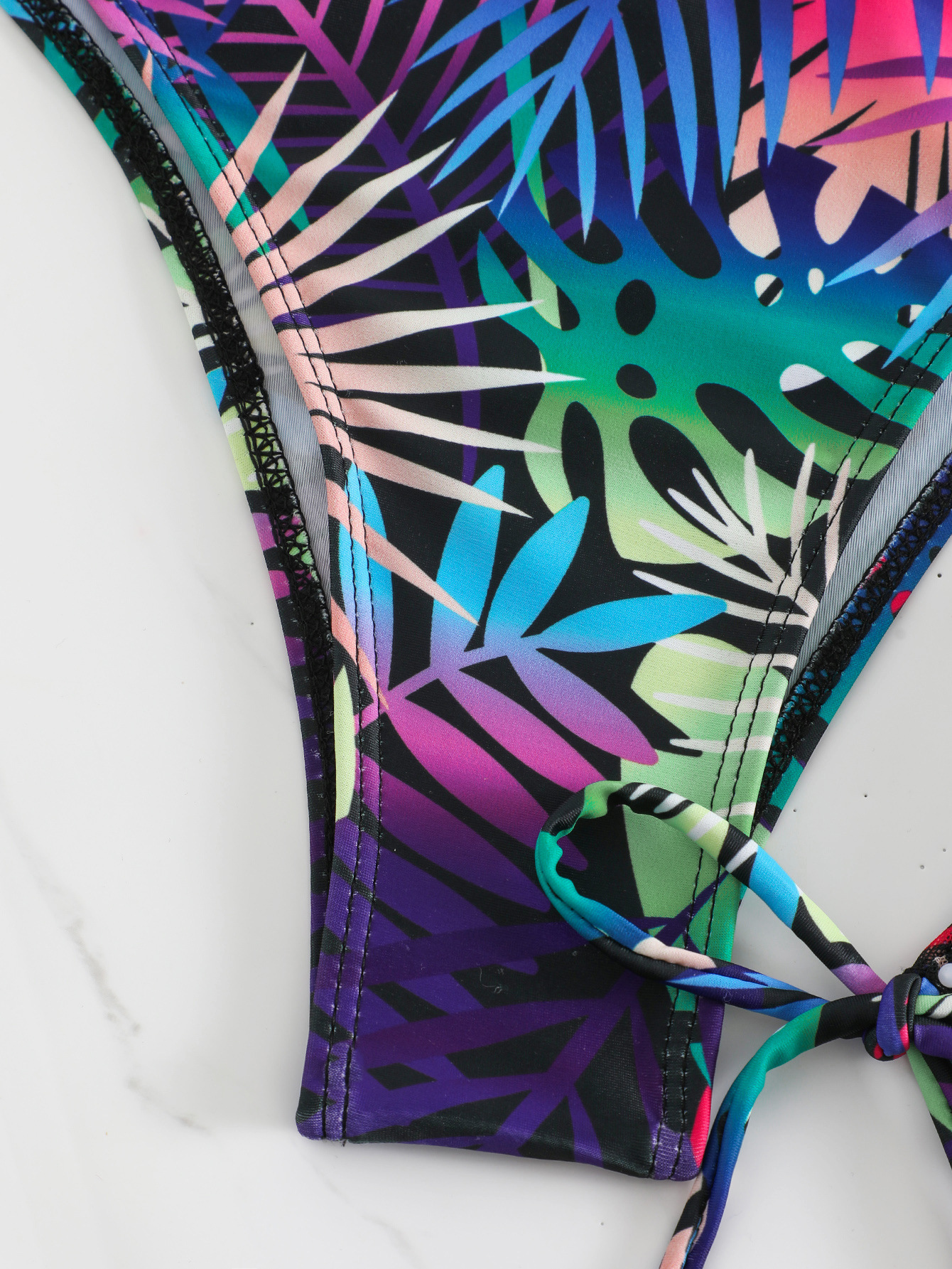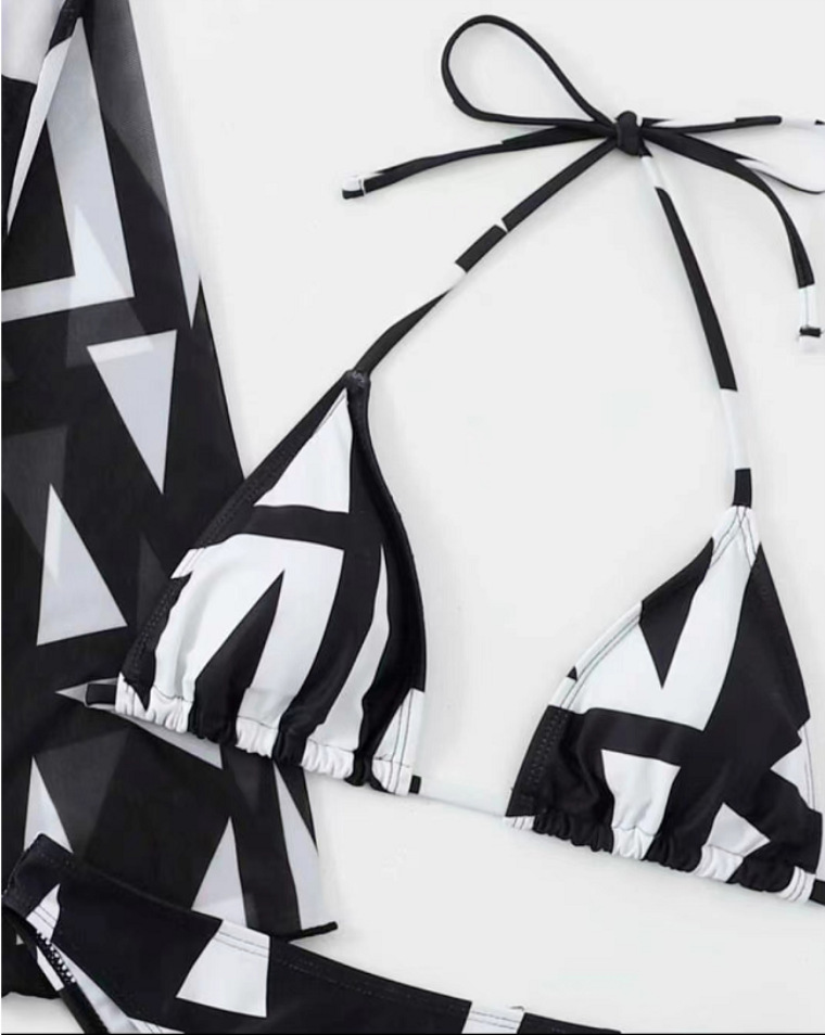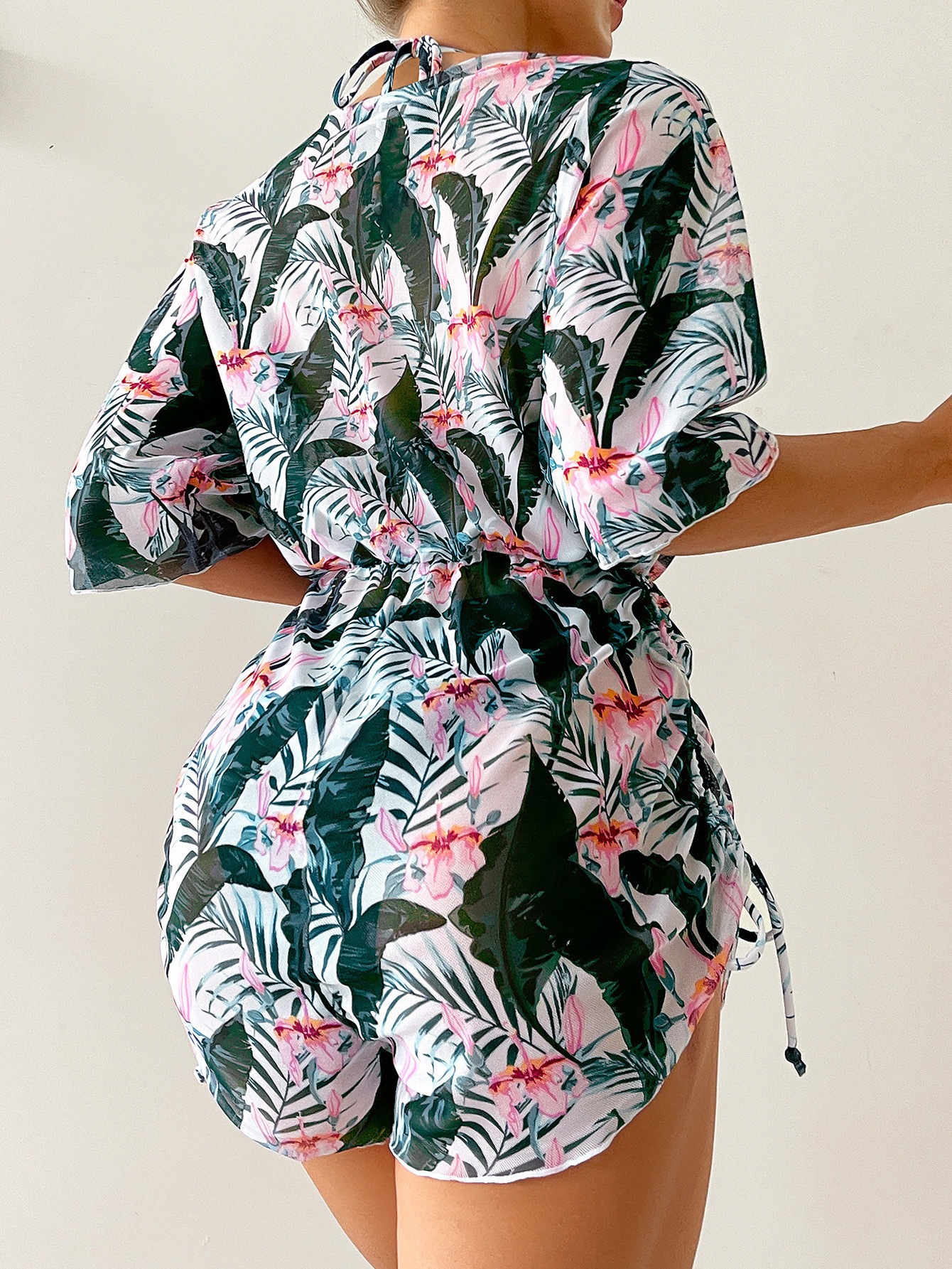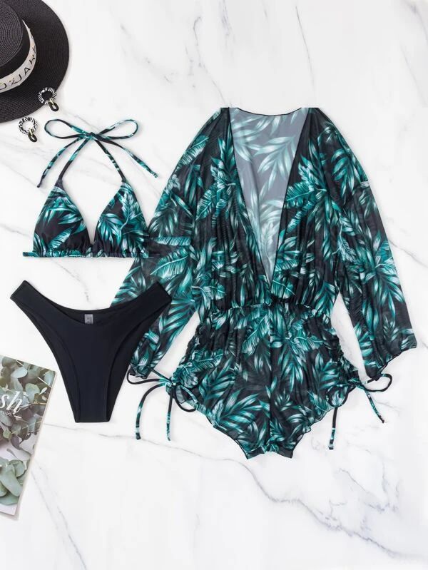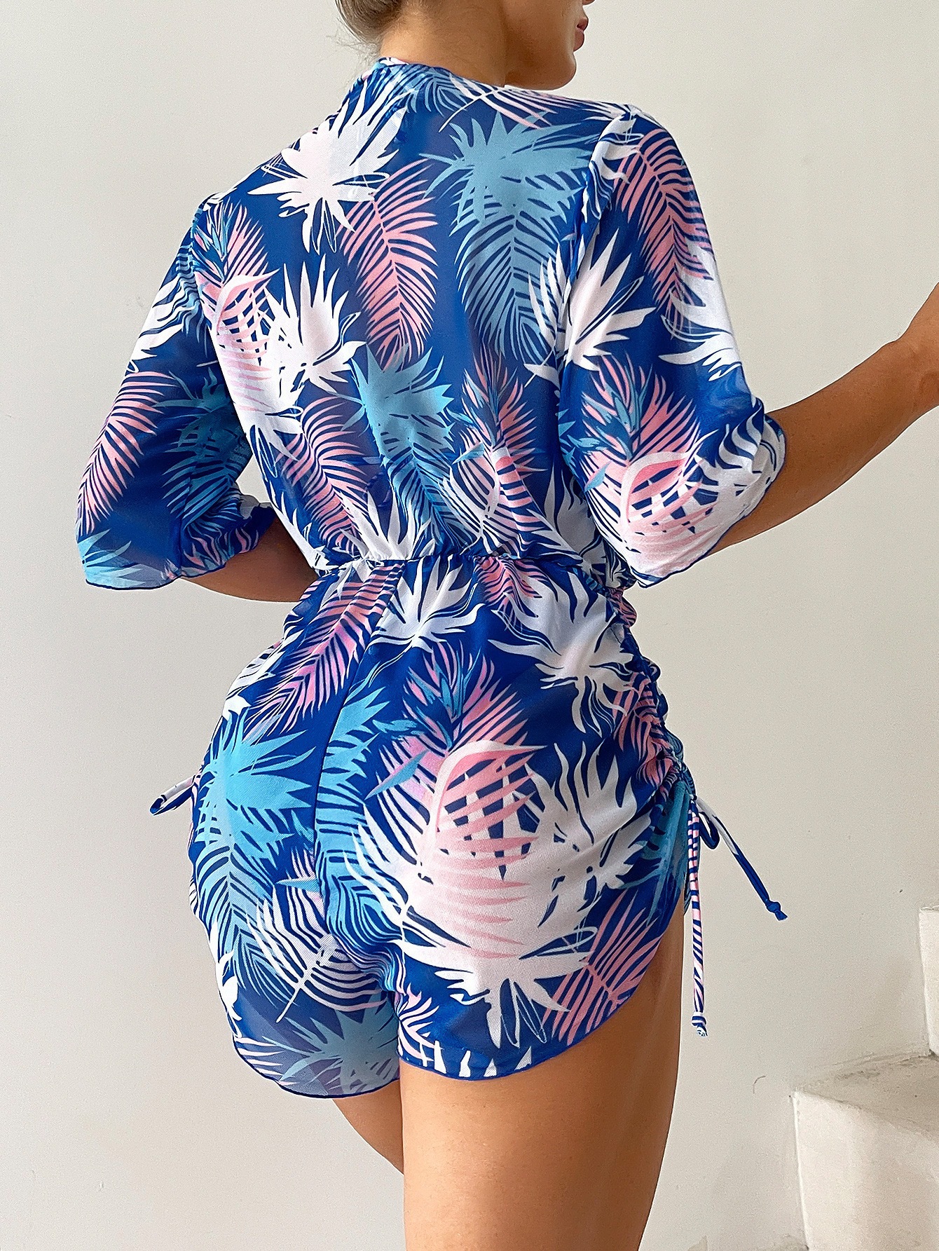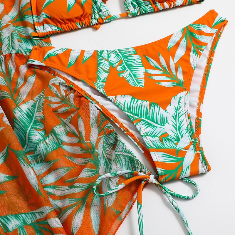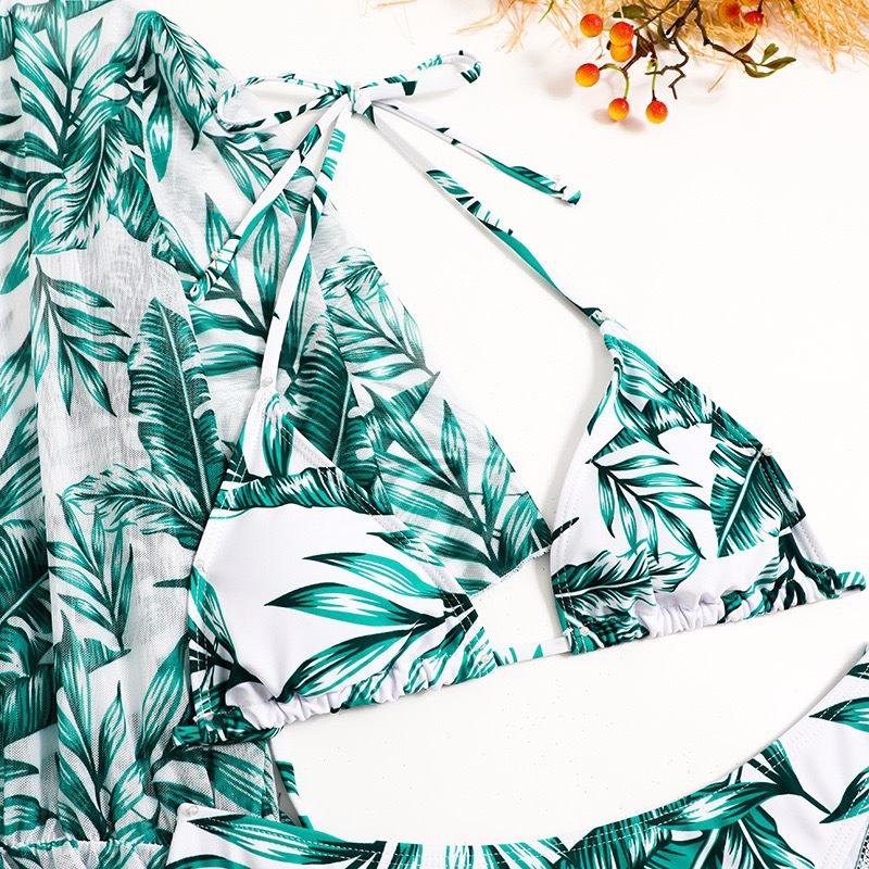 2024新款欧美三件套比基尼树叶印花收腰系带时尚长袖沙滩防嗮泳衣