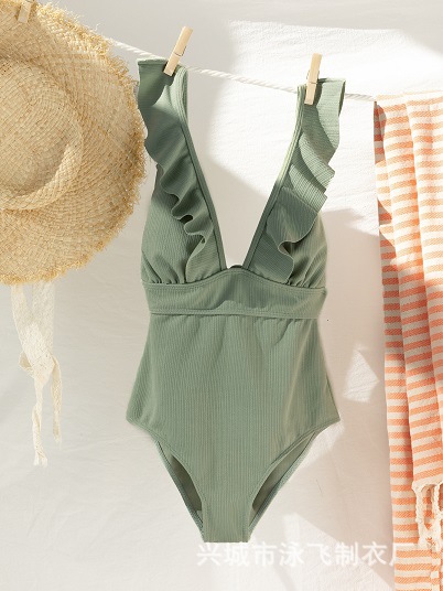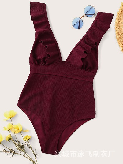 2023新款欧美纯色连体泳衣女 性感荷叶边深V穿绳比基尼外贸bikini