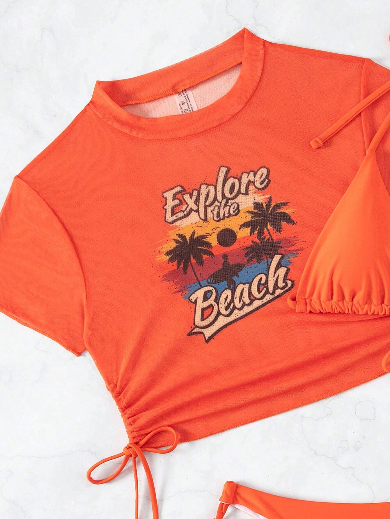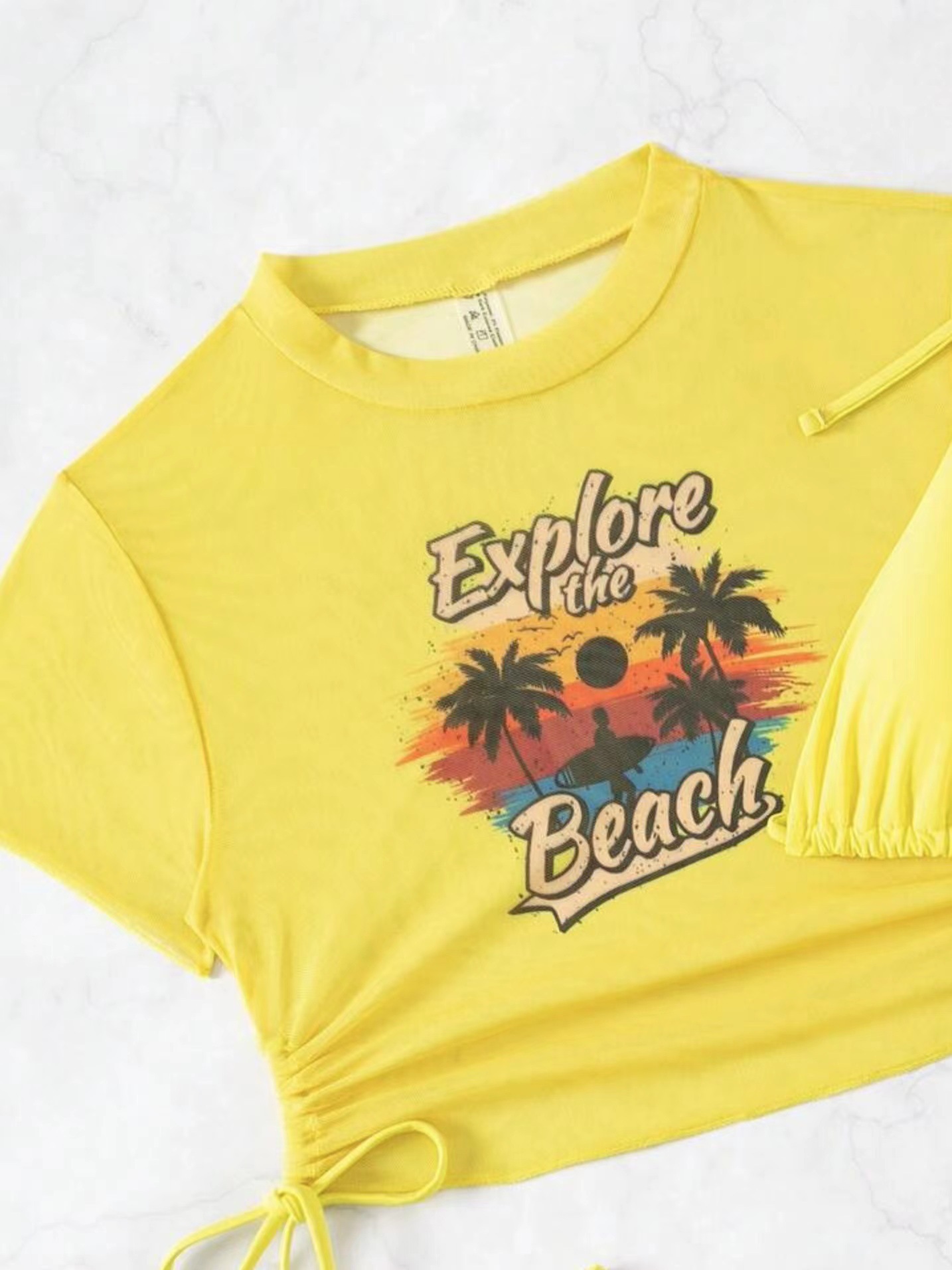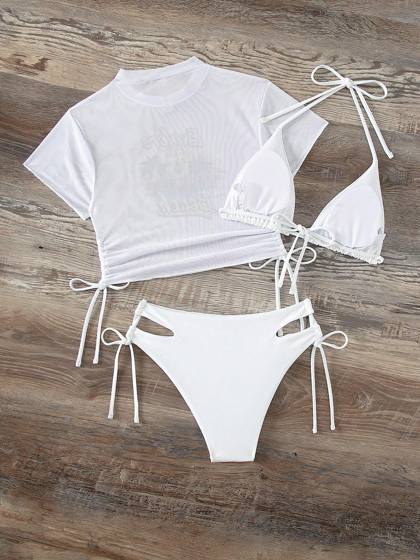 2024跨境分体泳衣性感三件套比基尼短袖网纱透肉欧美外贸泳装批发