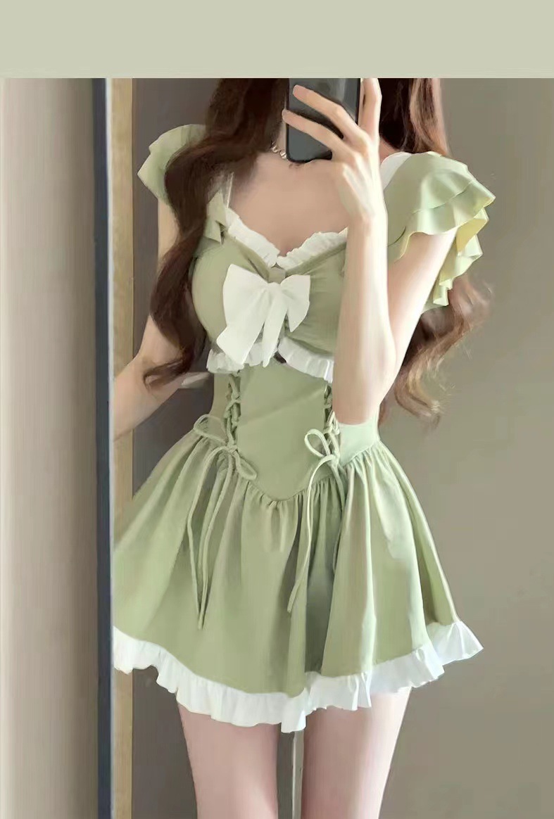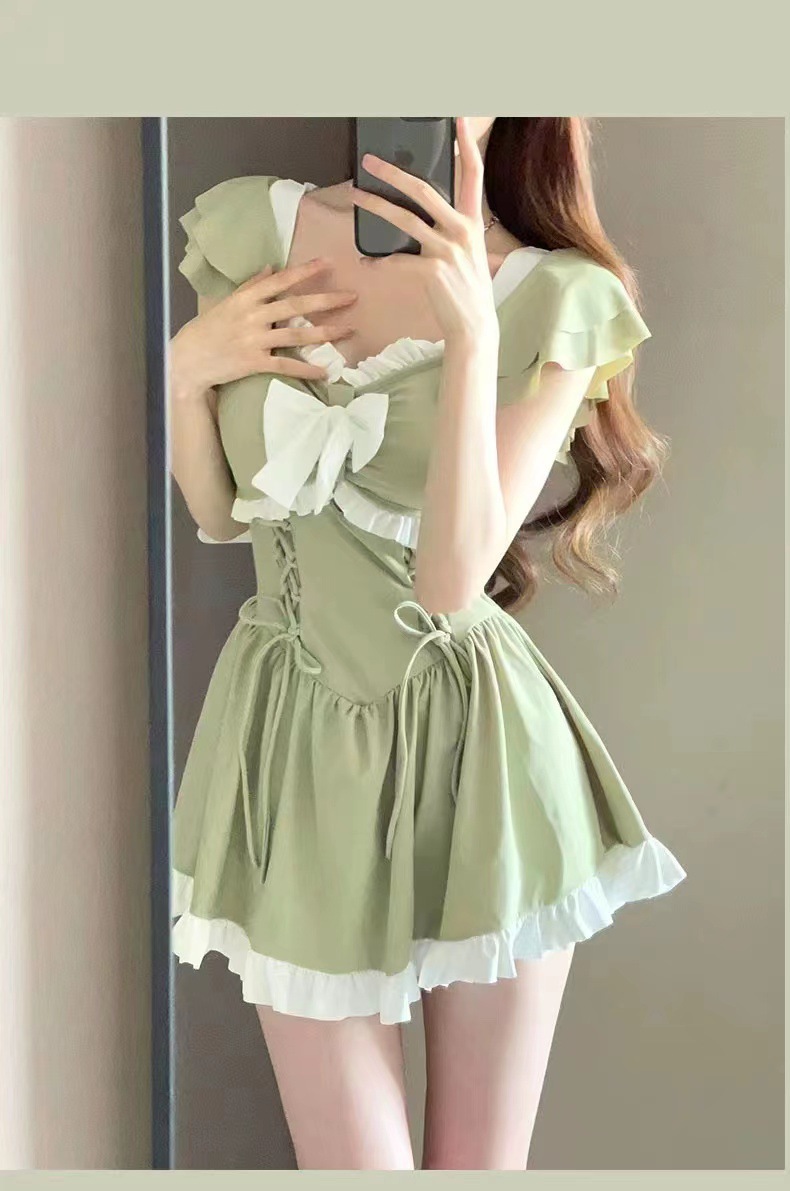 泳衣女2023连体夏季新款保守遮肚甜美牛油果绿裙式平角高级感游泳