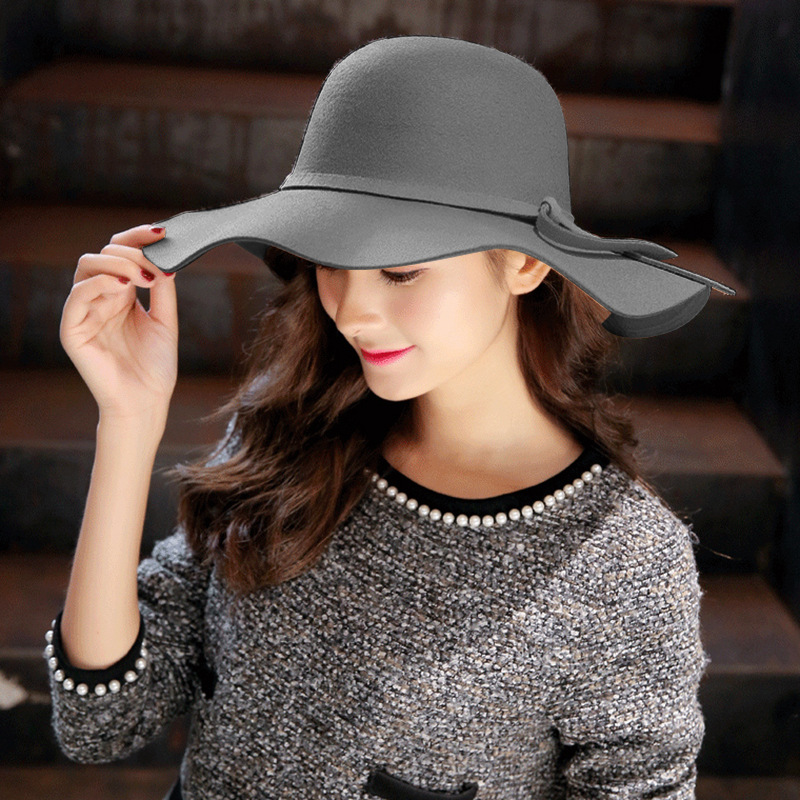 欧美名媛复古风毛呢帽女春秋季新款韩版百搭波浪檐大檐礼帽女盆帽