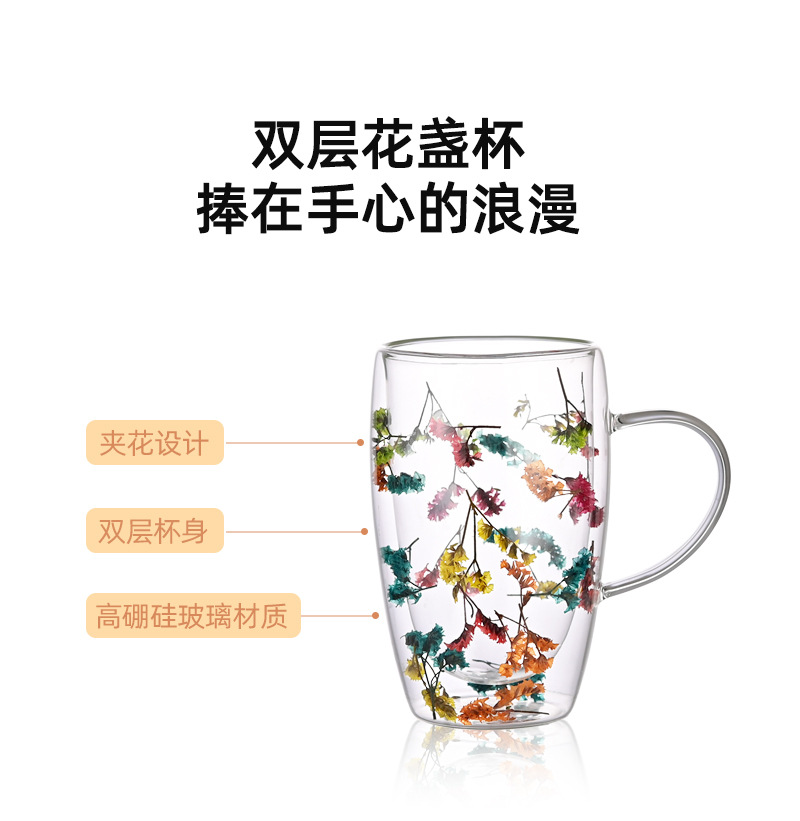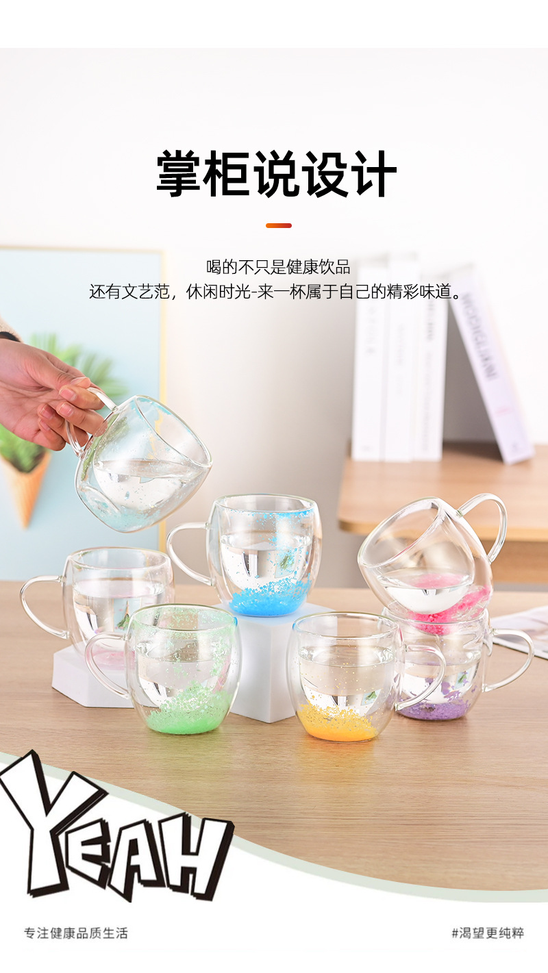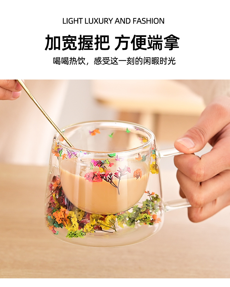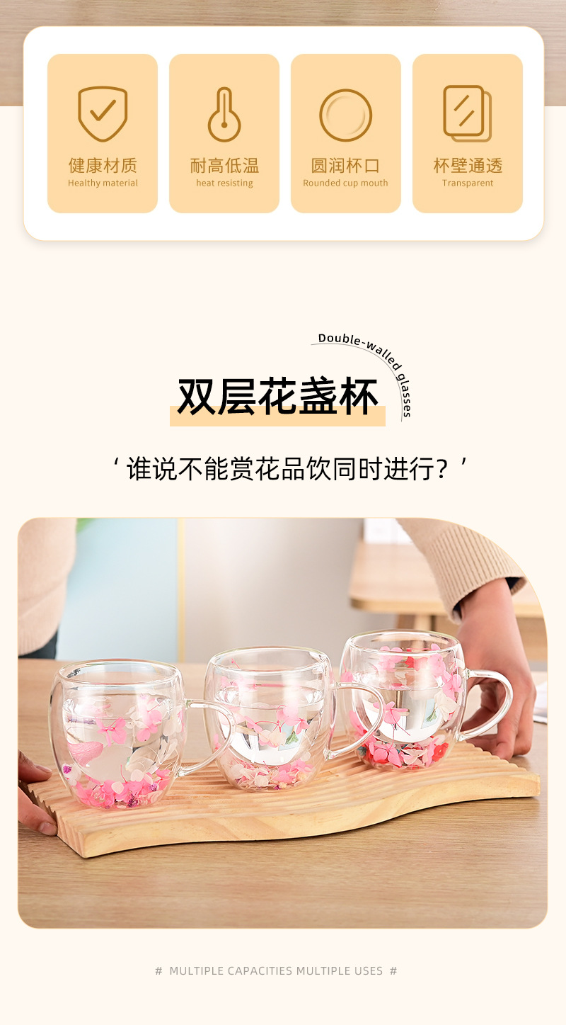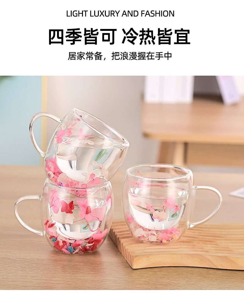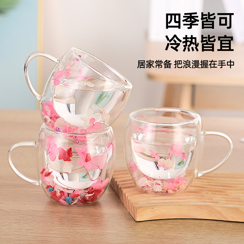 网红花瓣流沙杯厂家批发高颜值真花双层玻璃杯简约高硼硅玻璃杯
