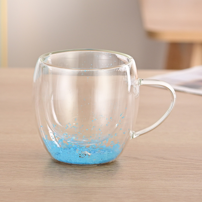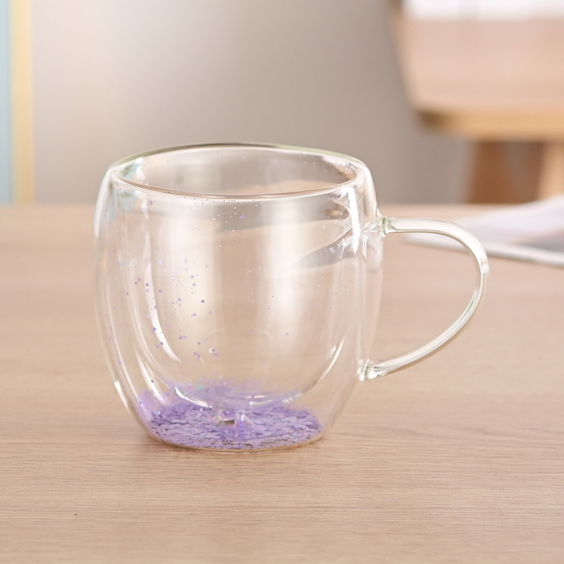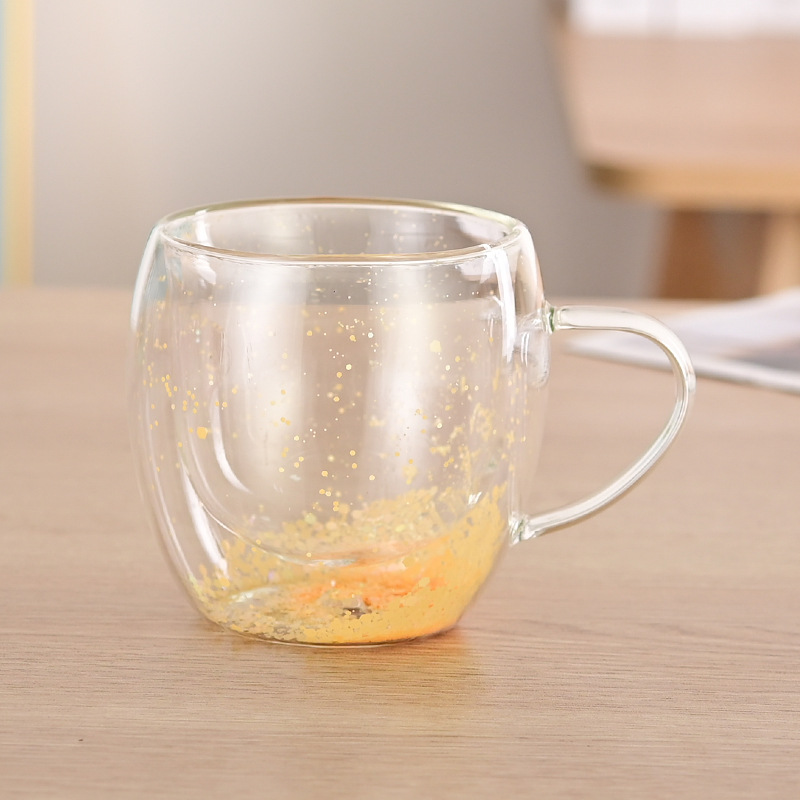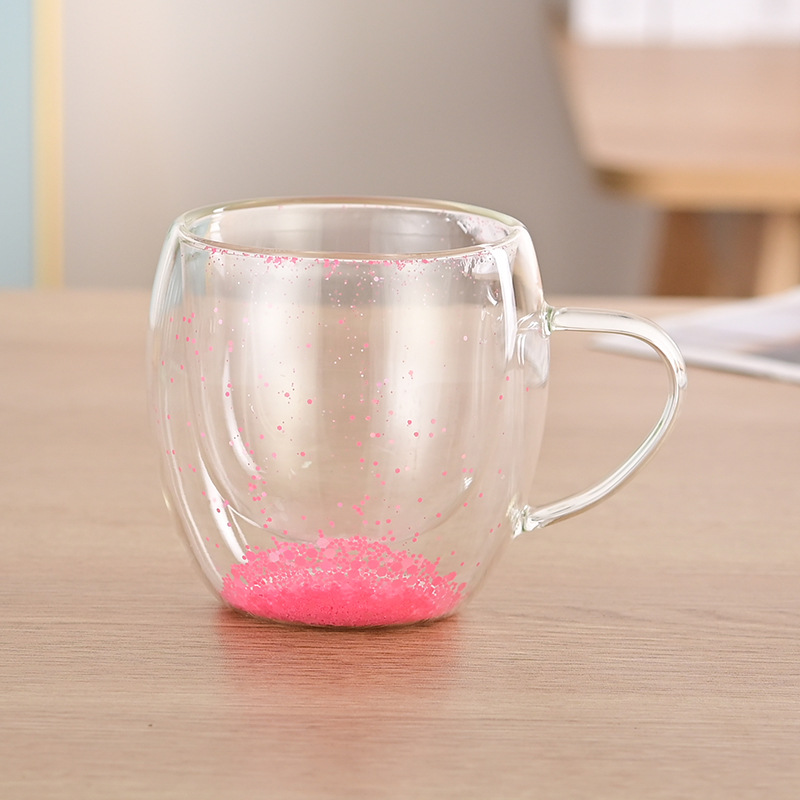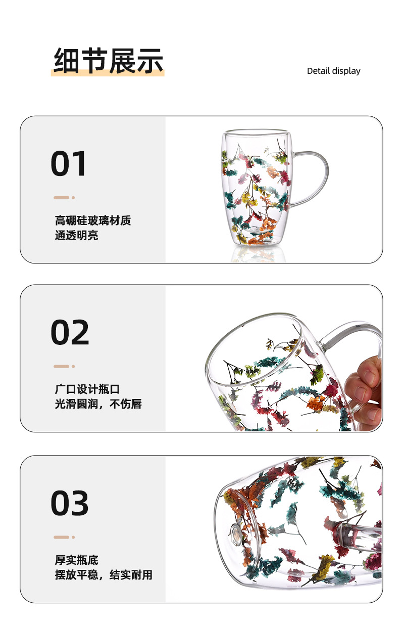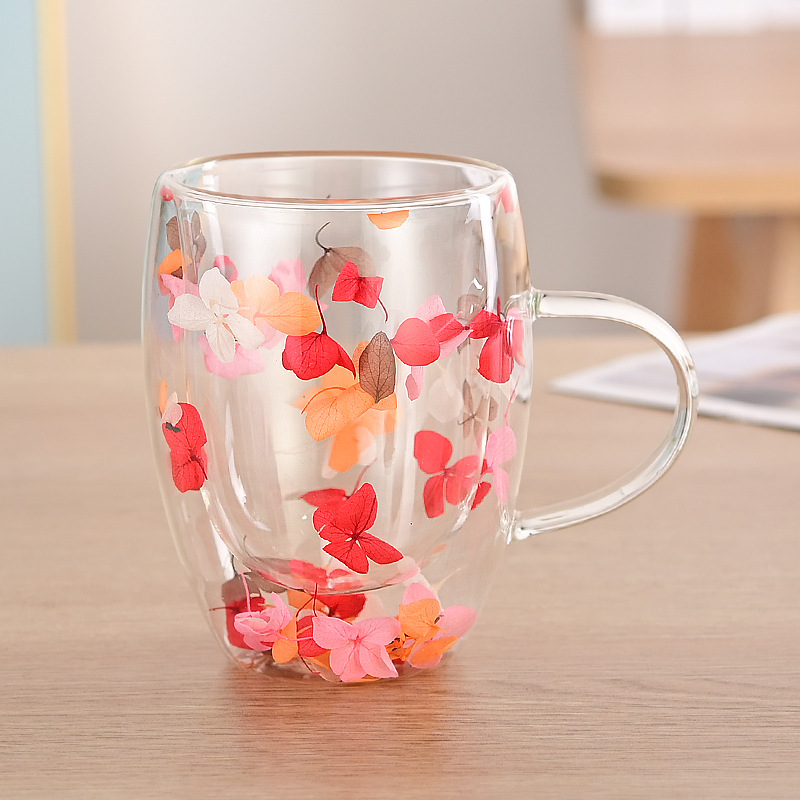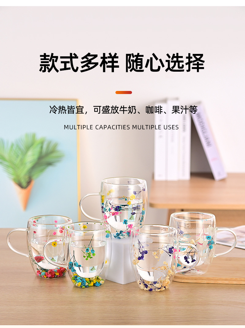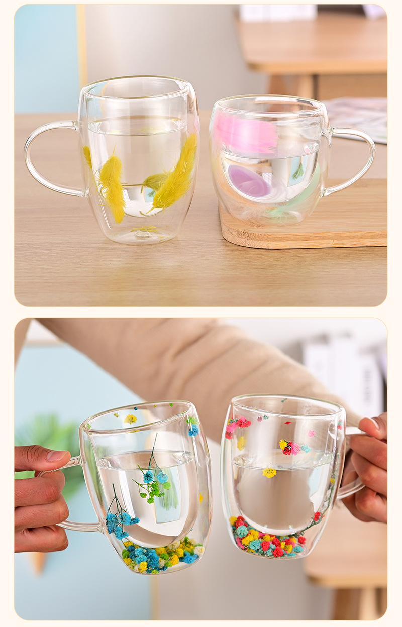 网红花瓣流沙杯厂家批发高颜值真花双层玻璃杯简约高硼硅玻璃杯