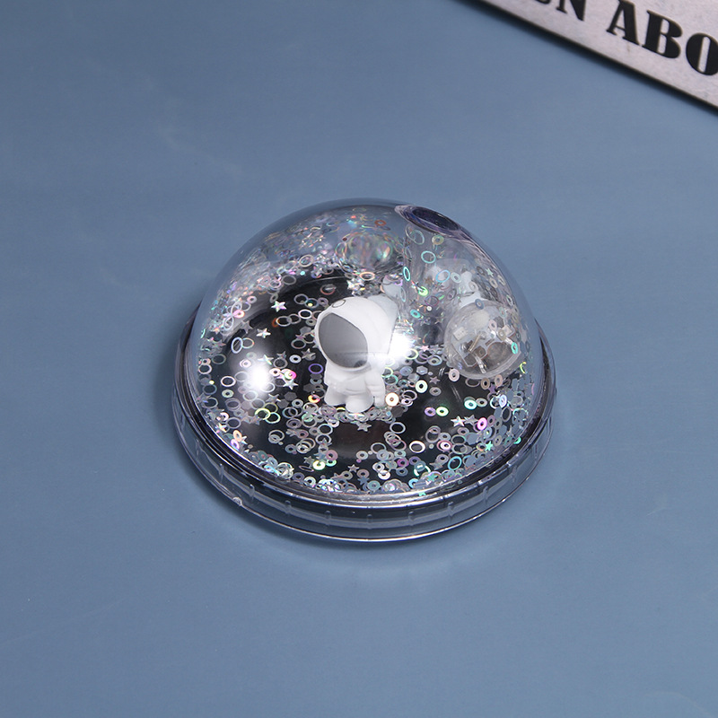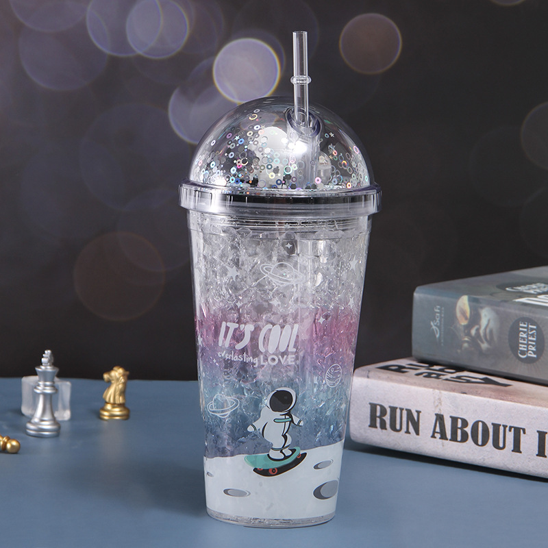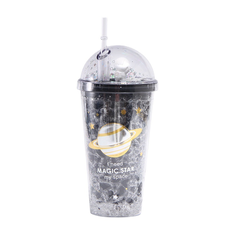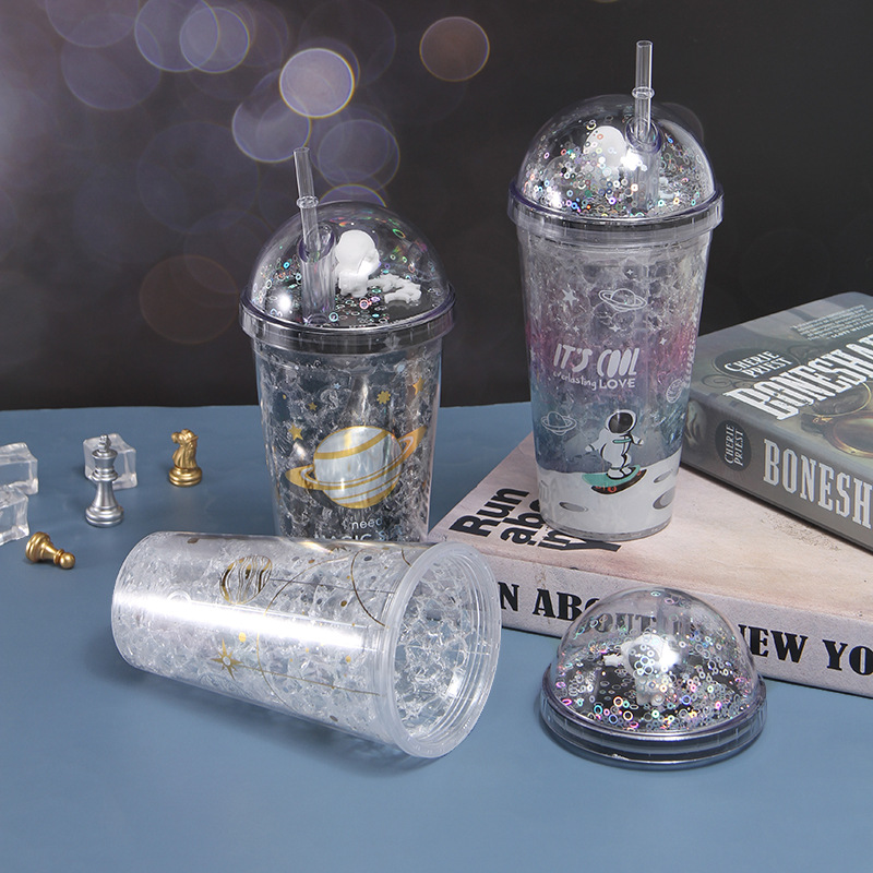 创意网红ins风双层塑料杯学生带灯随手杯微观星球太空人吸管水杯
