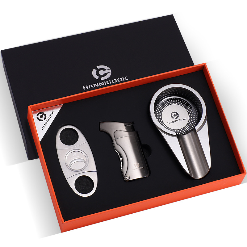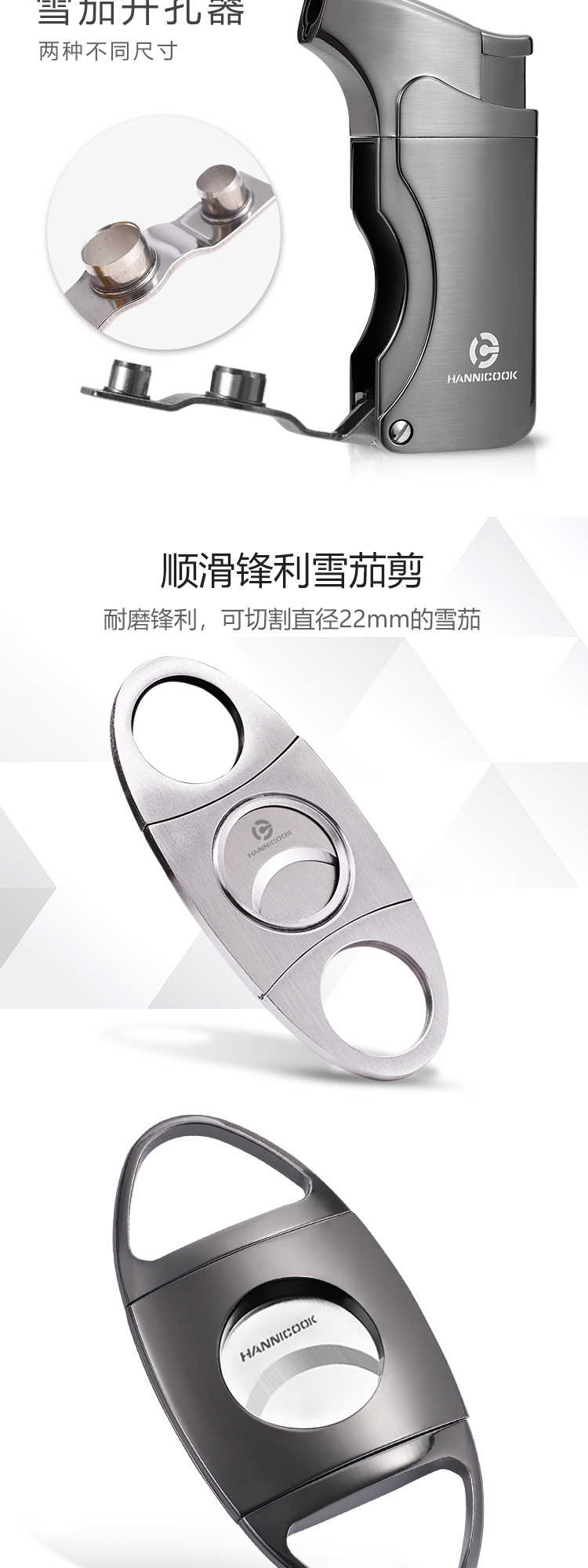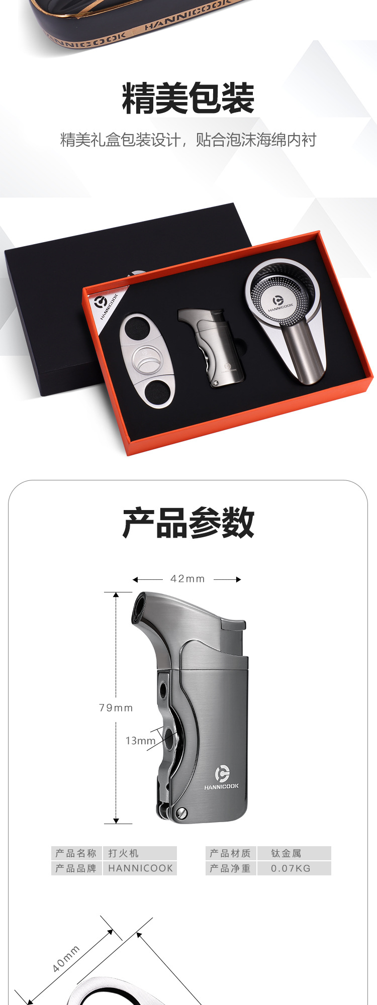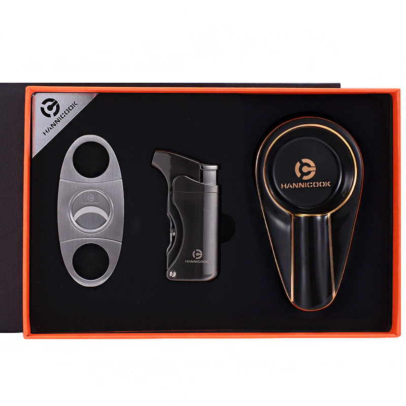 HANNICOOK锋利雪茄剪防风打火机陶瓷金属烟灰缸三件雪茄套装轻奢