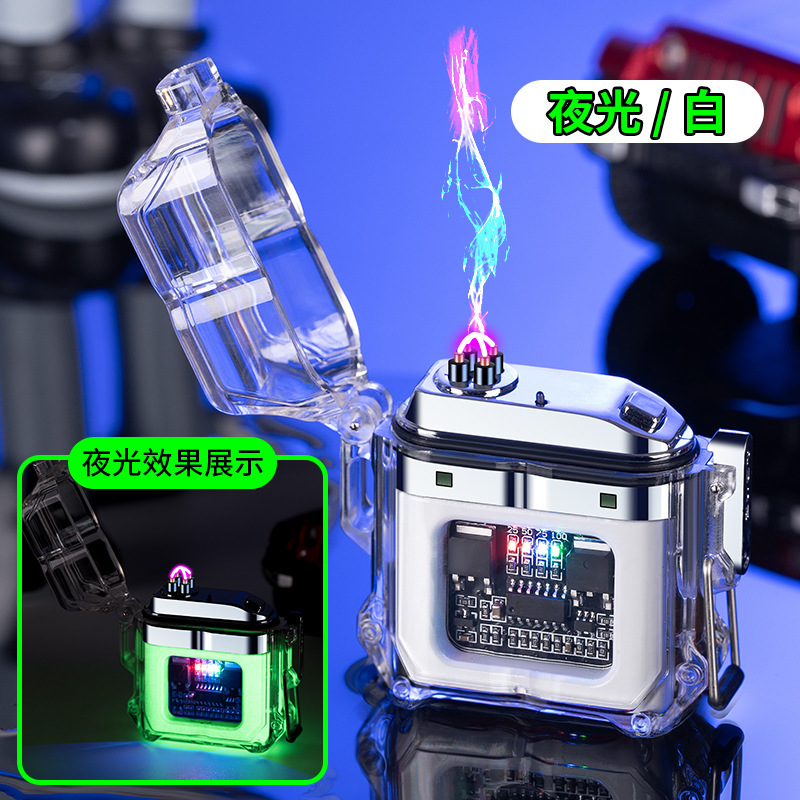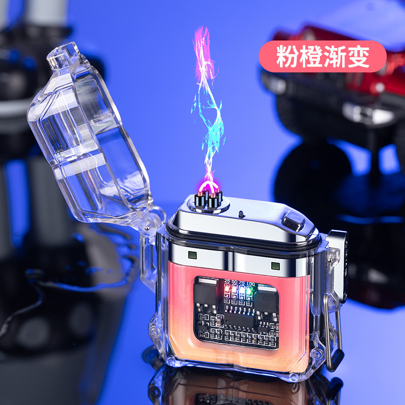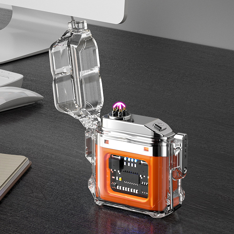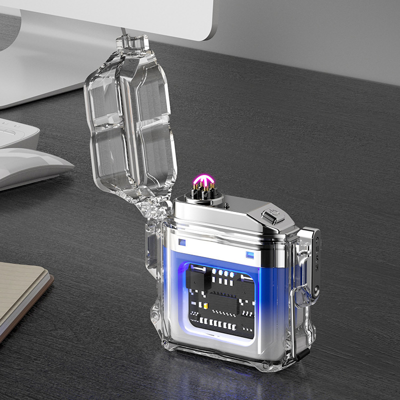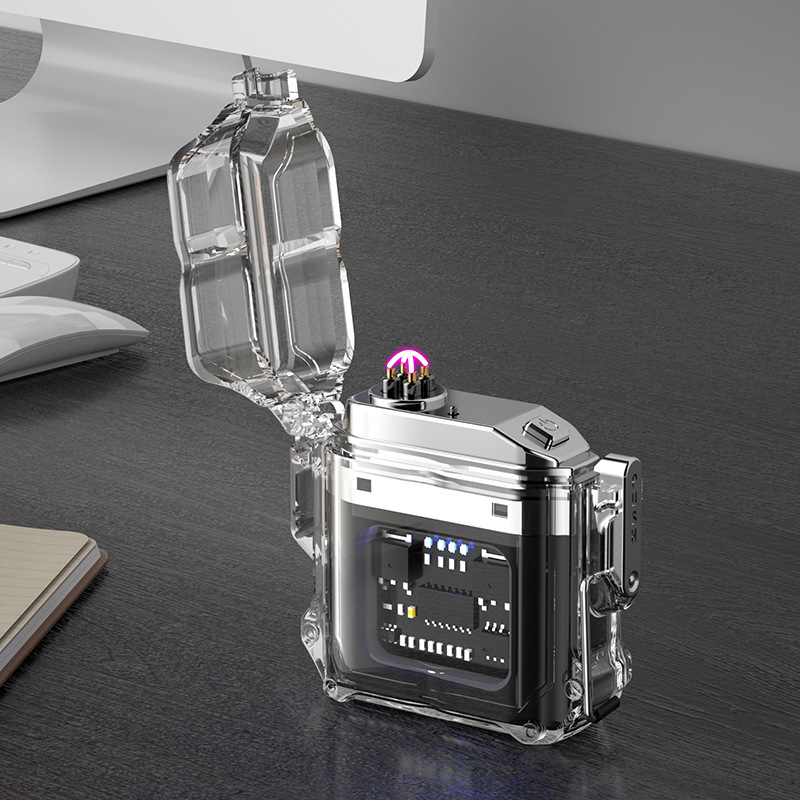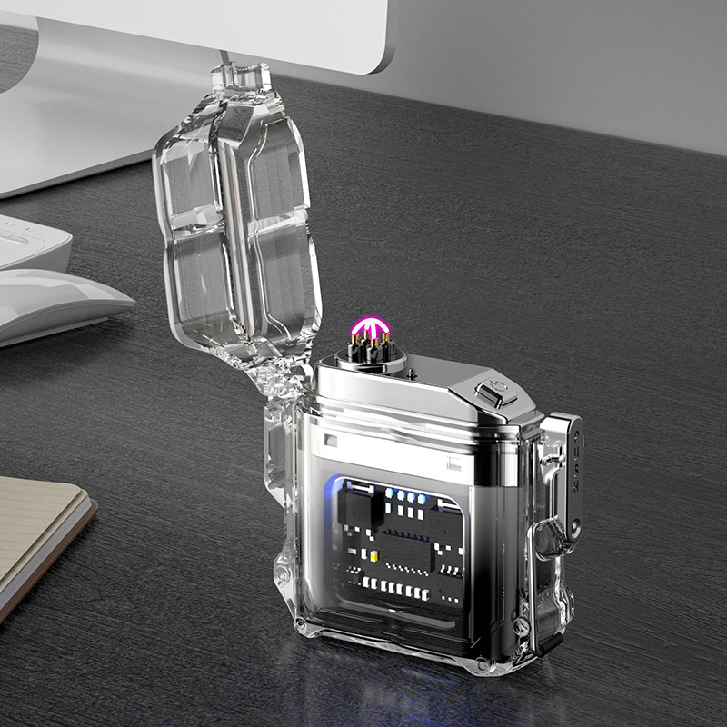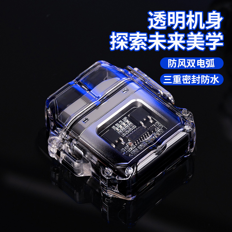 透明壳防水电子脉冲充电火机户外防风打火机防水双电弧点烟器跨境