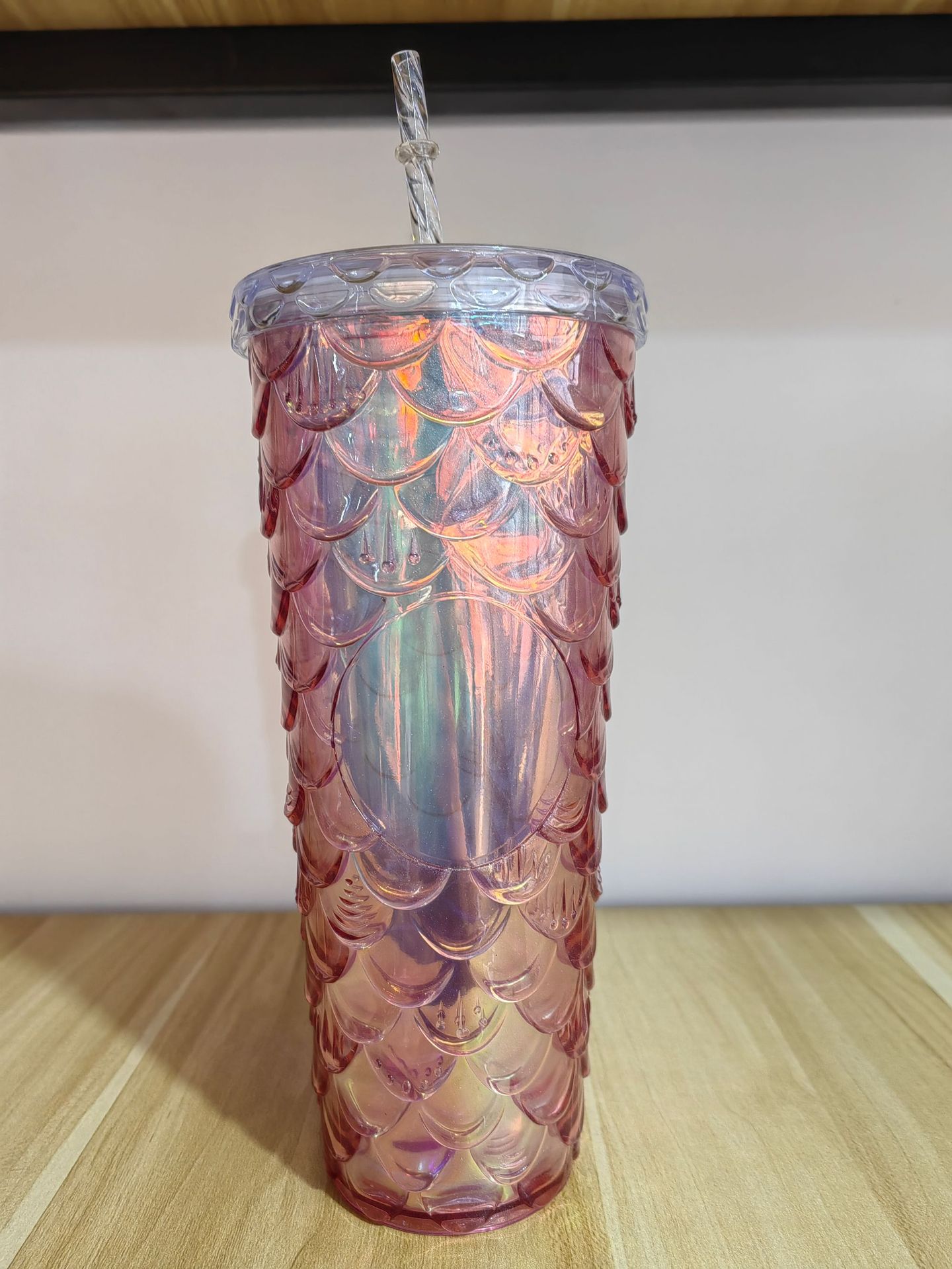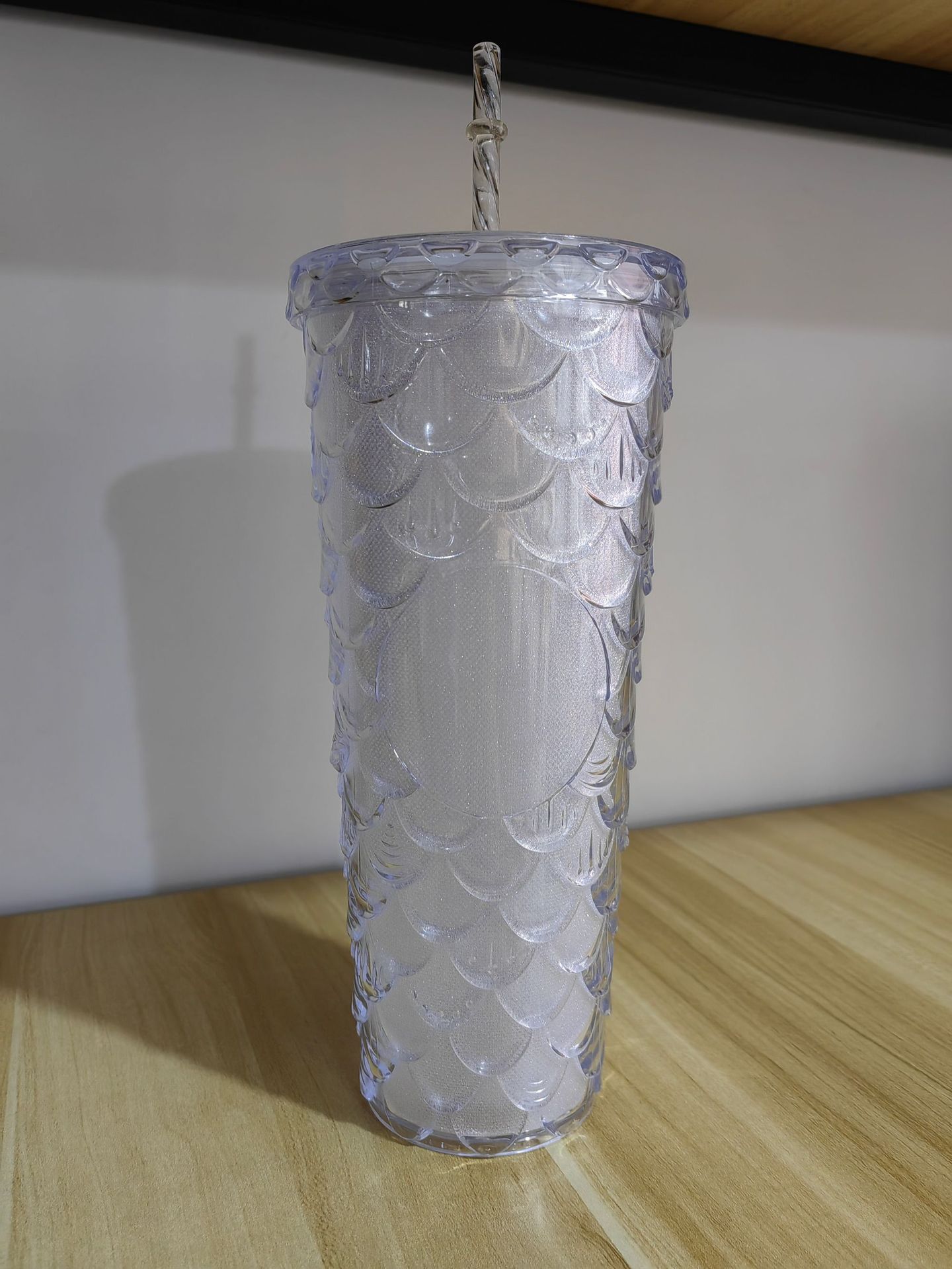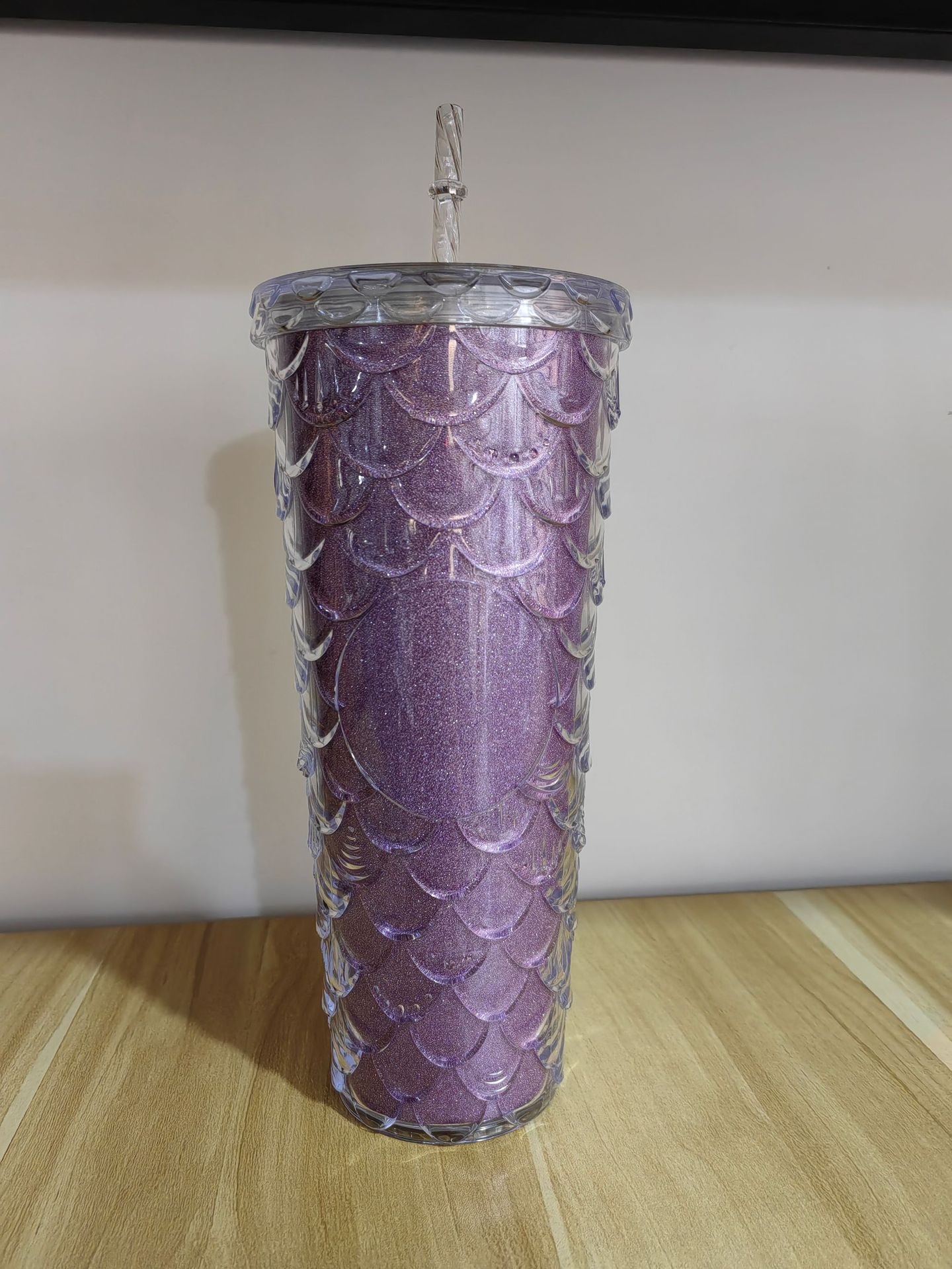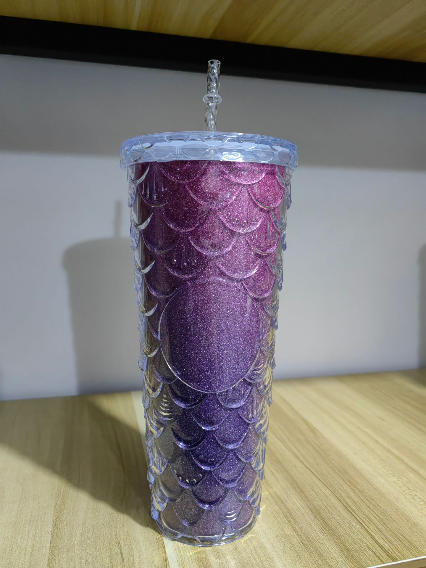 新款厂家直供双层塑料杯吸管杯时尚鱼鳞杯大容量榴莲杯水杯吸管杯