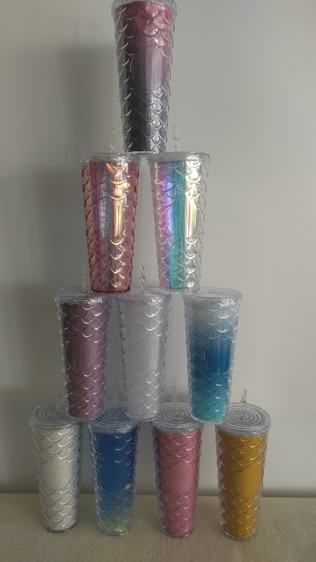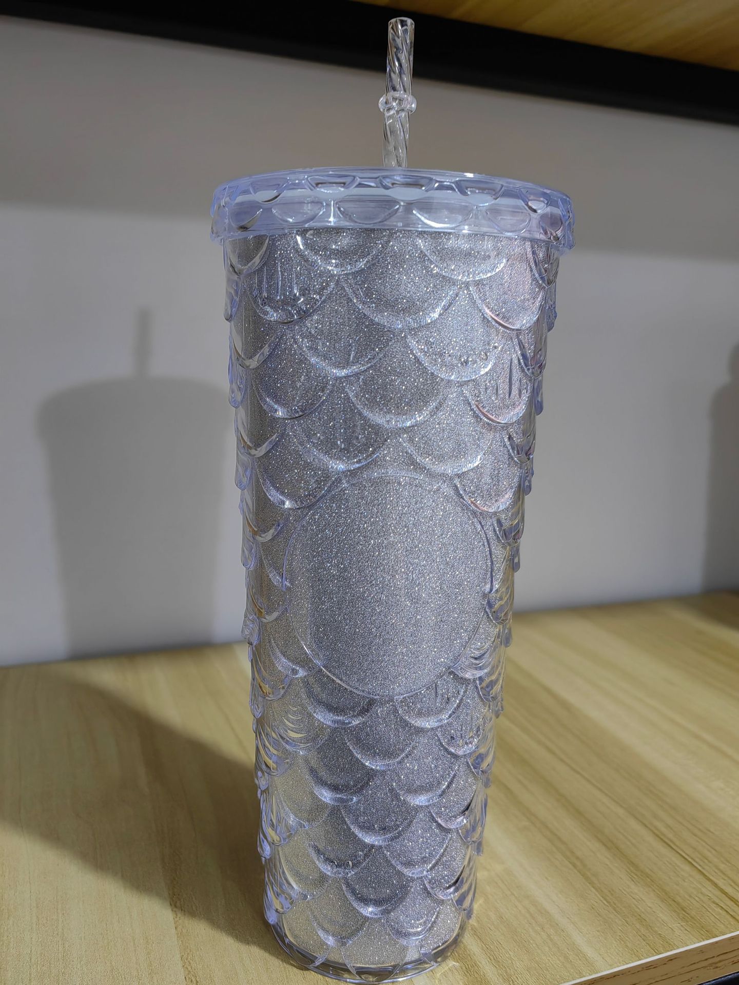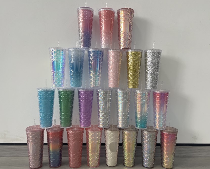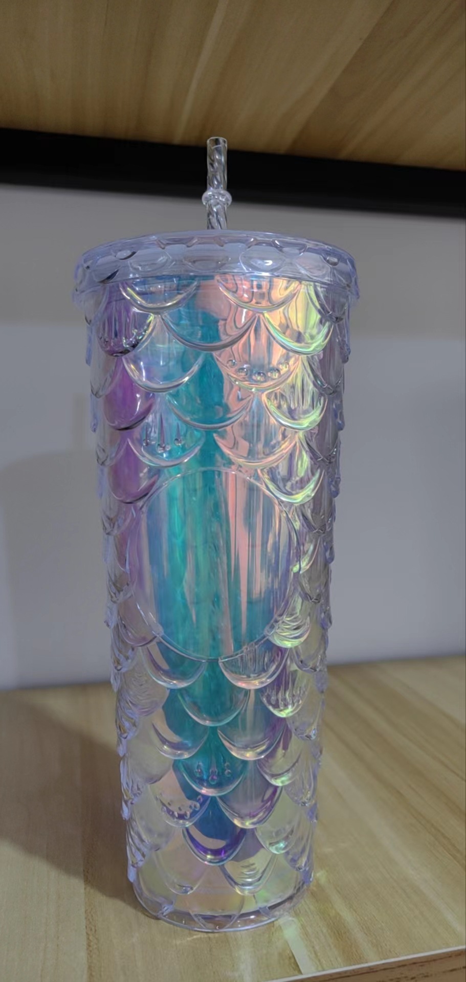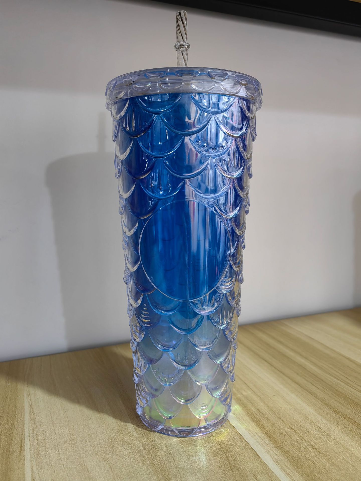 新款厂家直供双层塑料杯吸管杯时尚鱼鳞杯大容量榴莲杯水杯吸管杯