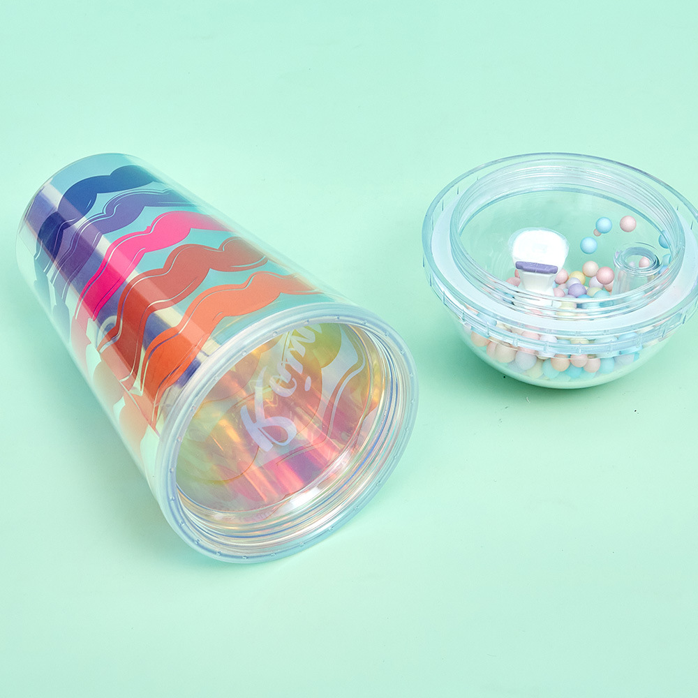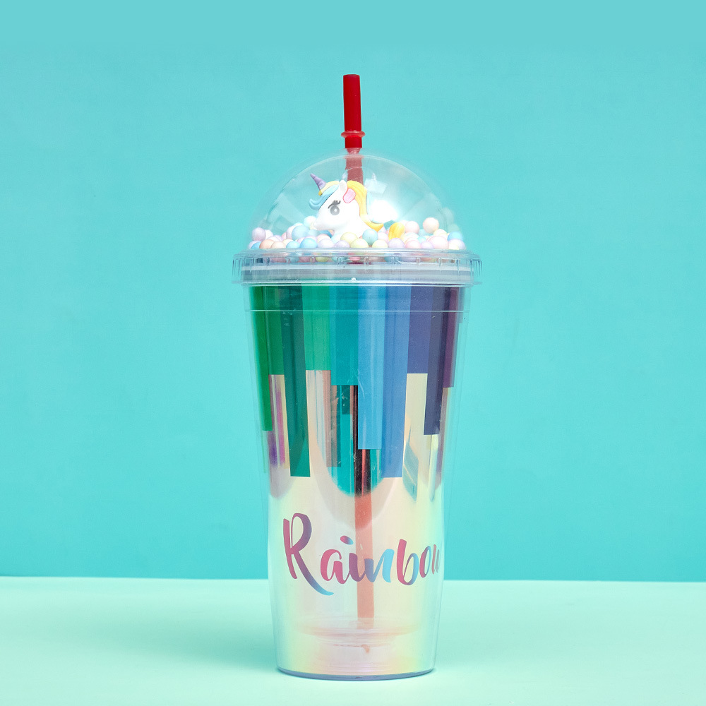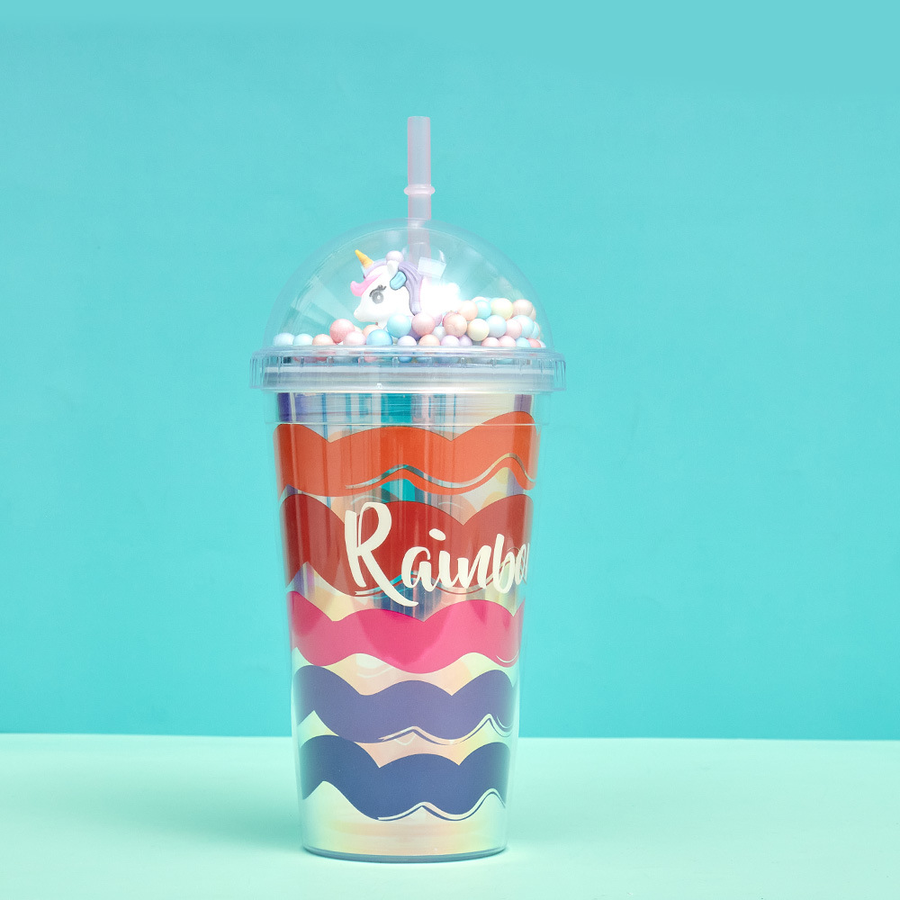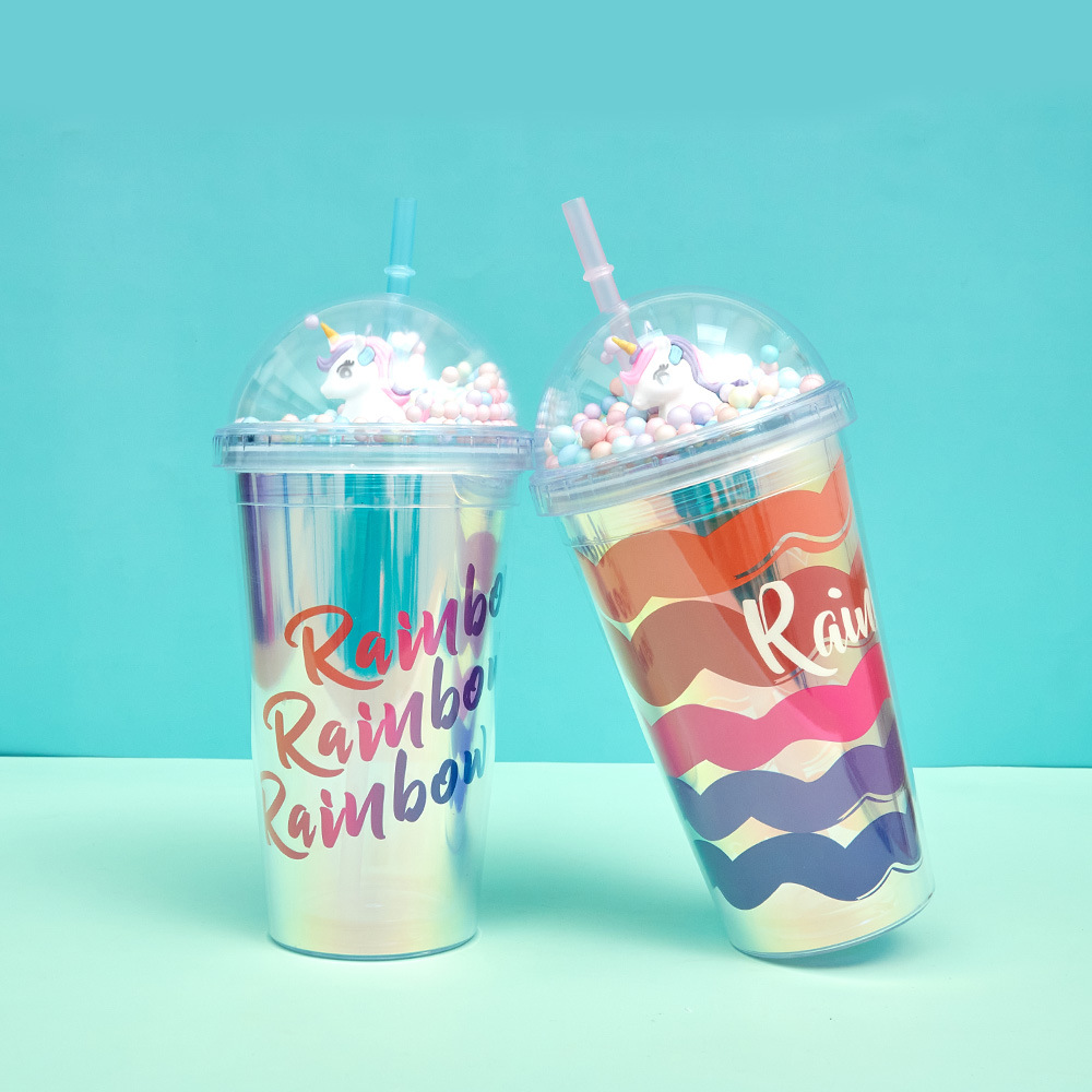 跨境新品彩虹波浪水杯网红杯大容量吸管杯简约可爱风双层塑料水杯