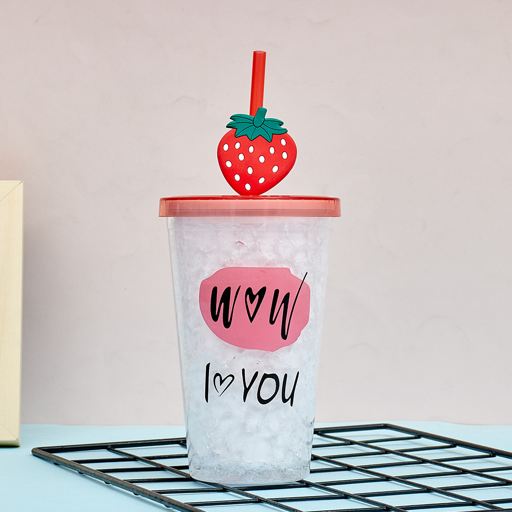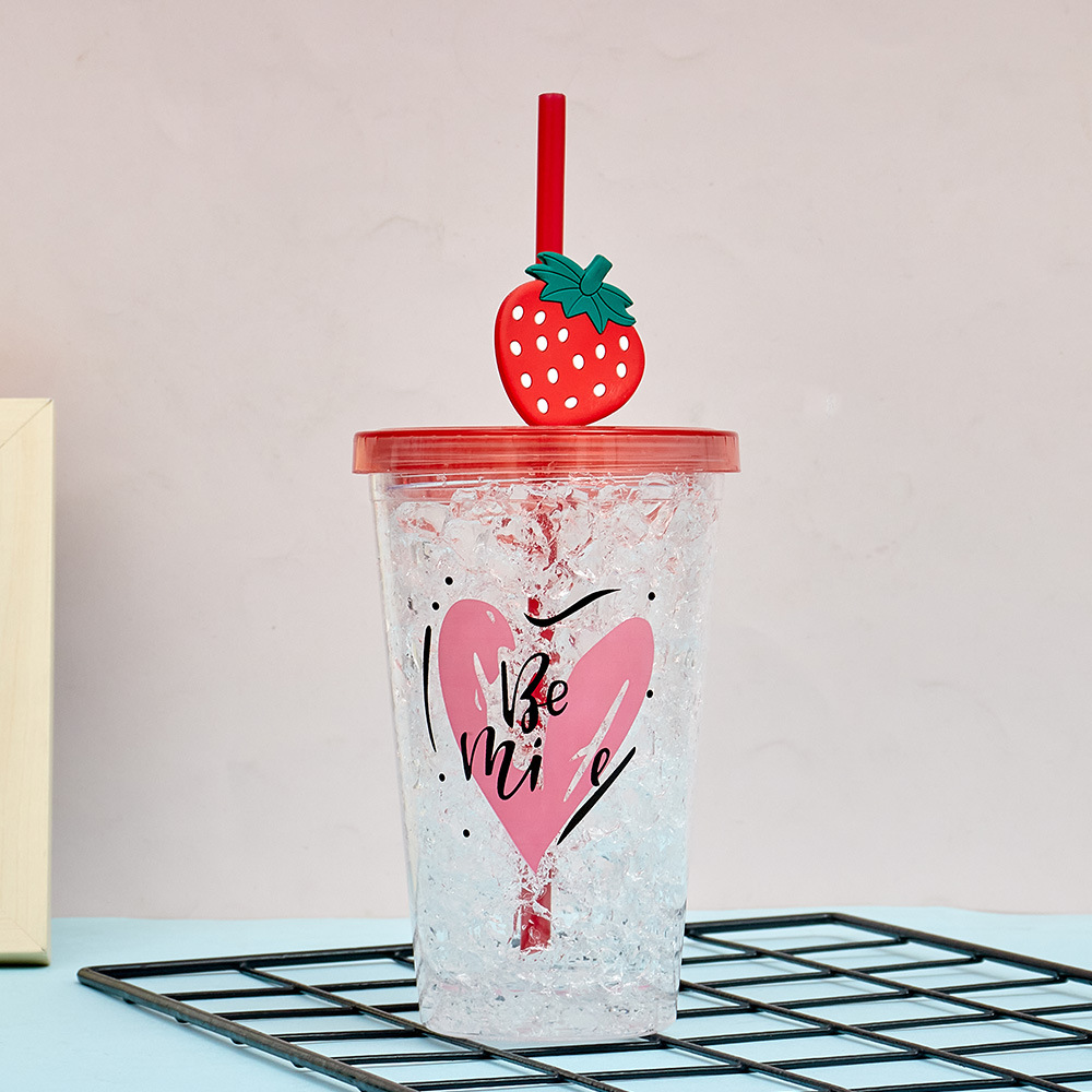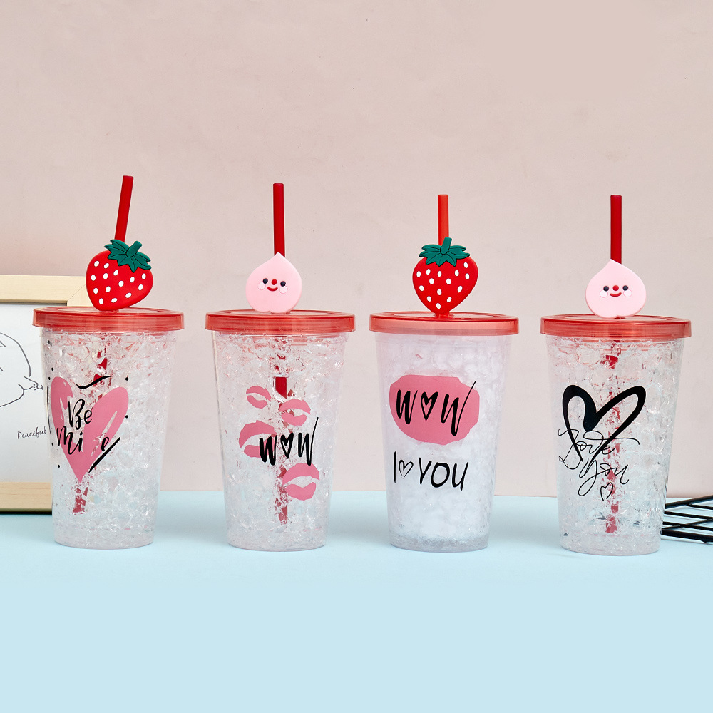 夏季爱心吸管杯塑料杯双层便携碎冰杯小清新酷爽制冷带盖随手杯