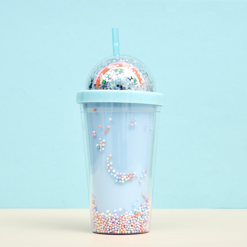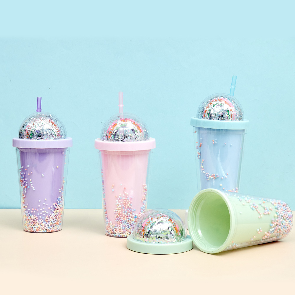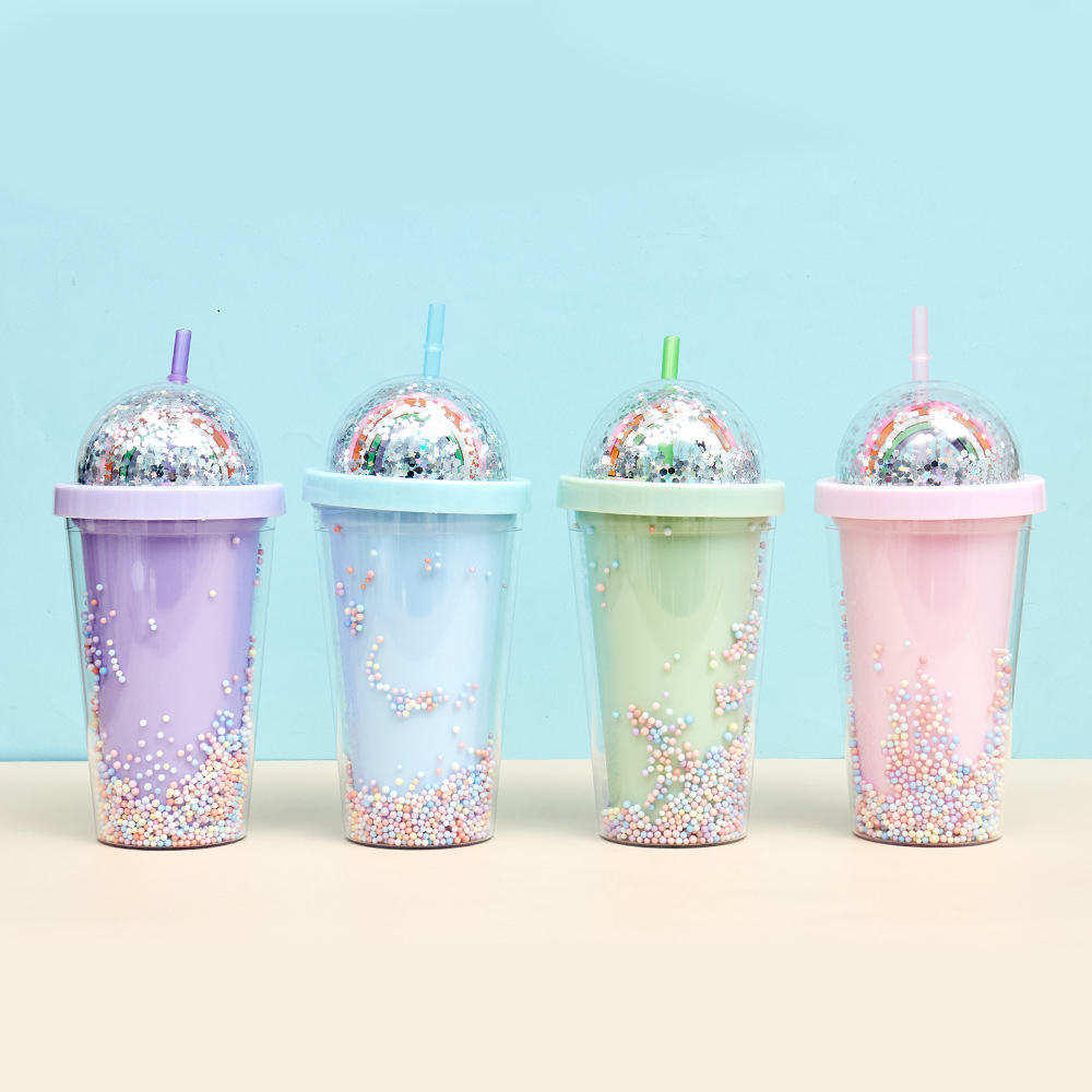 创意彩虹亮片杯盖塑料杯吸管水杯马卡龙色时尚双层高颜值制冷水杯