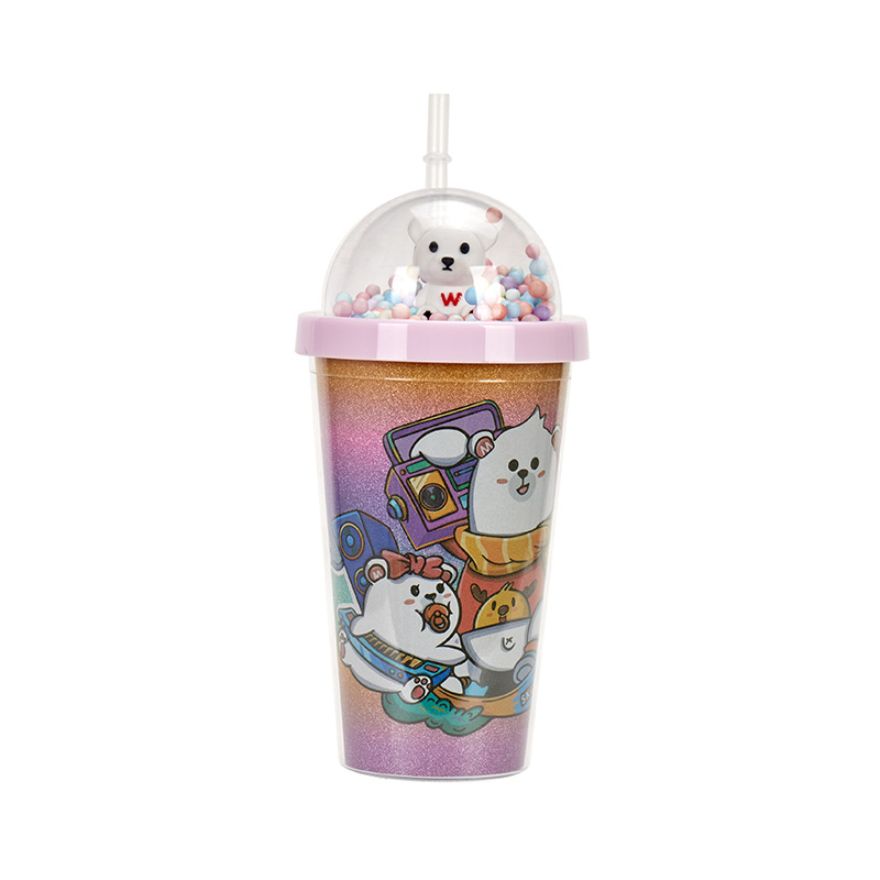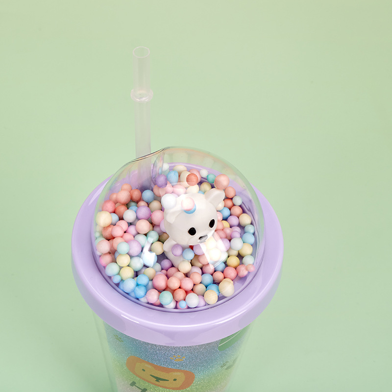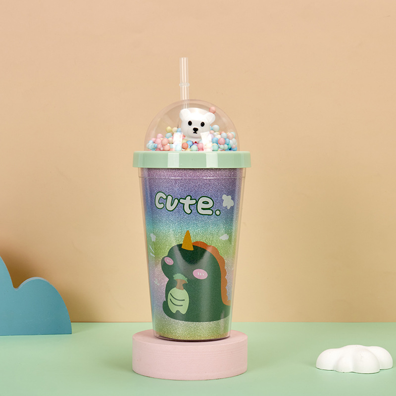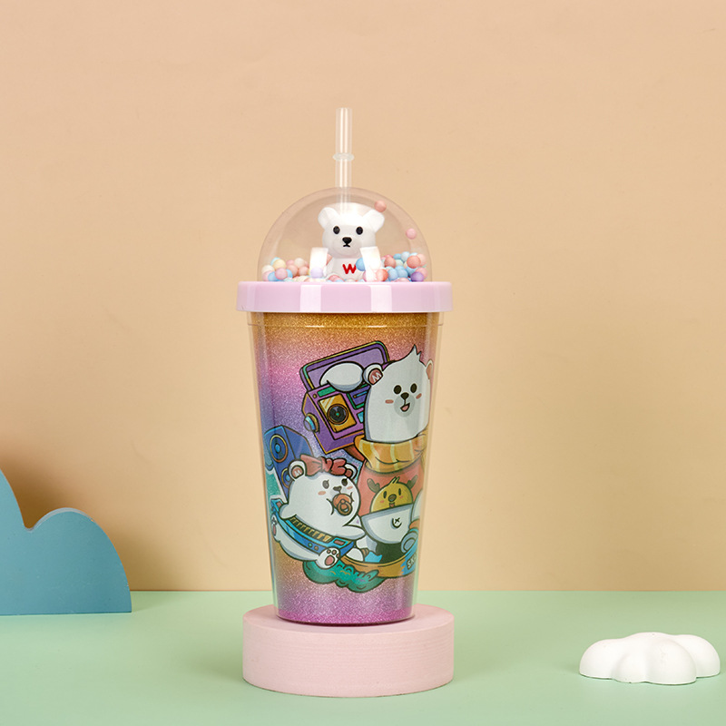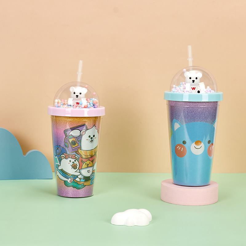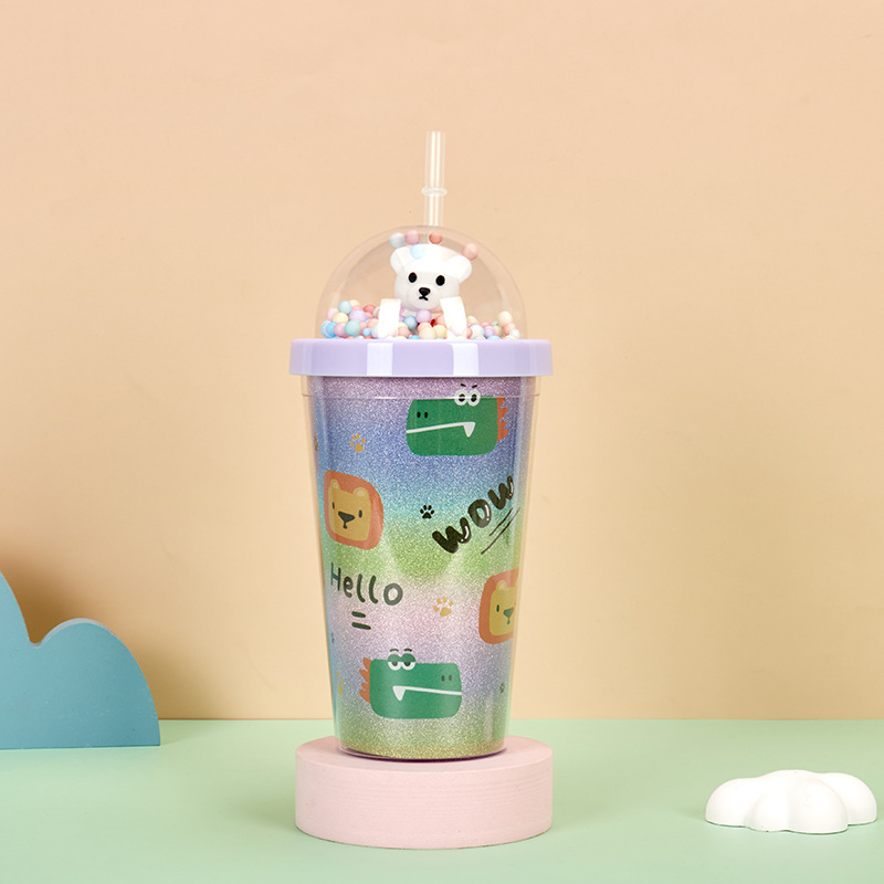 创意少女心小白熊公仔玩偶双层儿童吸管塑料杯装饰圆顶杯学生礼物