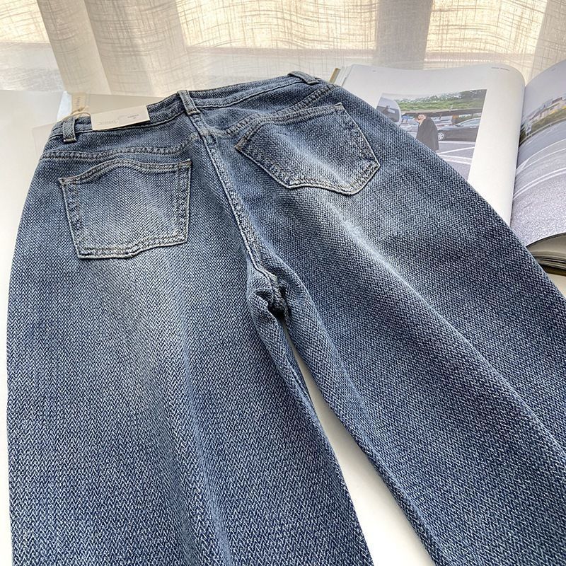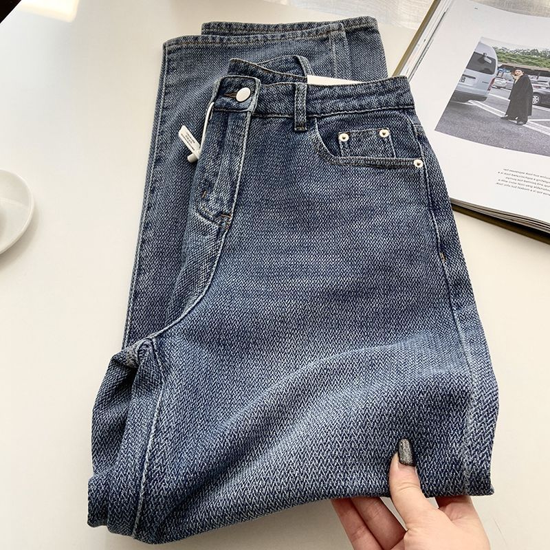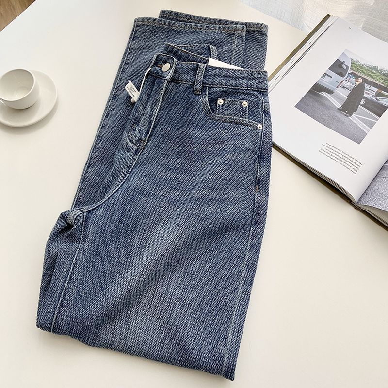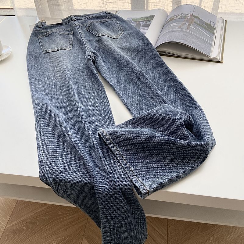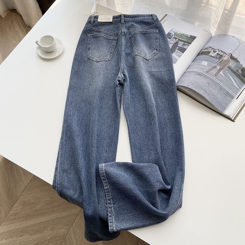 美式复古蓝色直筒牛仔裤女春秋设计感小众高腰宽松阔腿拖地长裤子