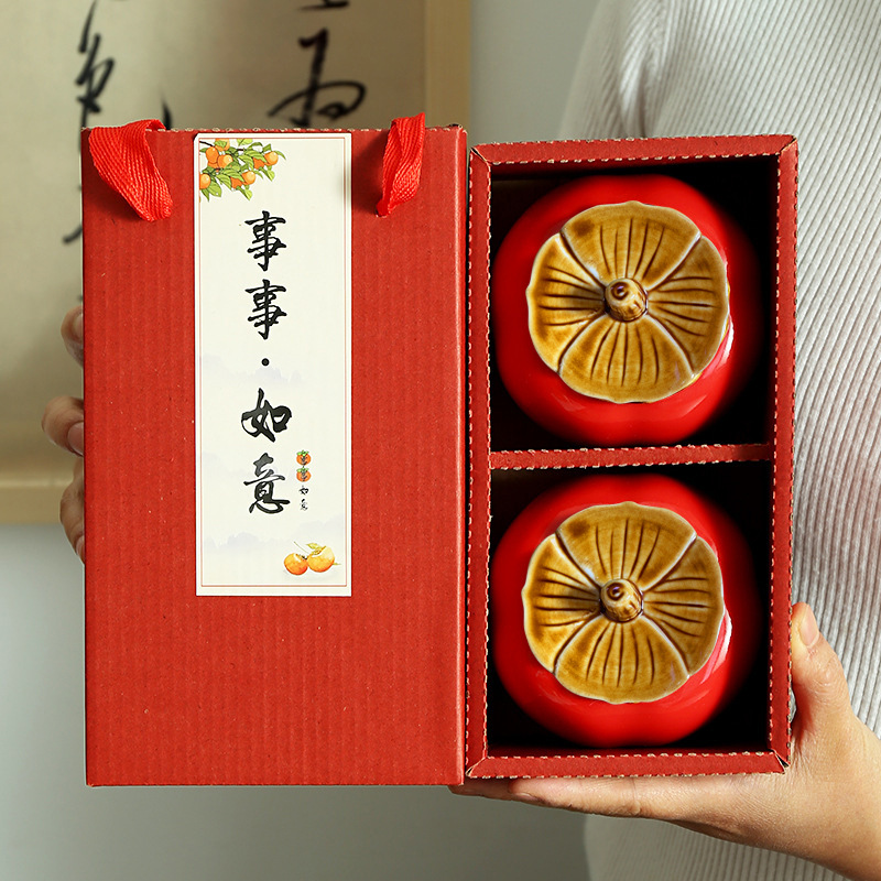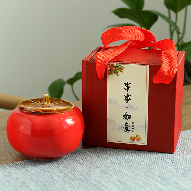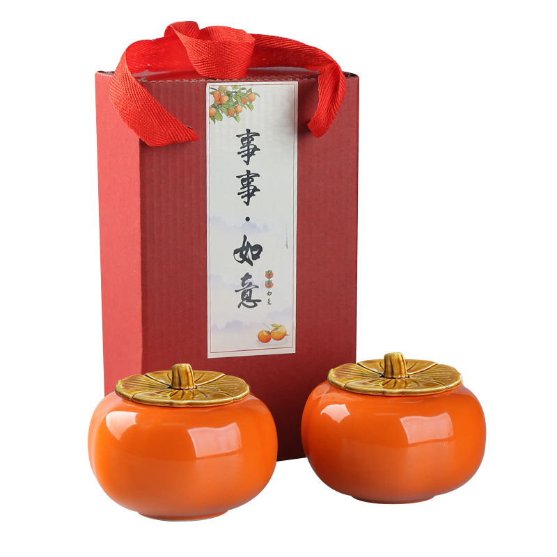 柿子陶瓷茶叶罐事事如意密封罐婚庆喜糖罐礼盒活动伴手礼品定 制