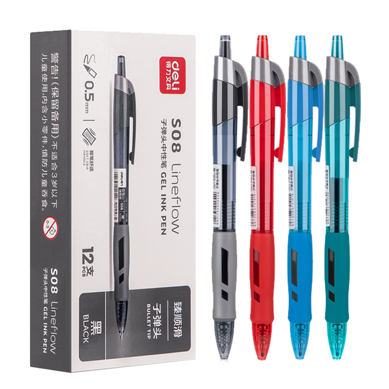 得力s08按动中性笔0.5mm蓝黑色子弹头塑料按压笔学生办公文具水笔
