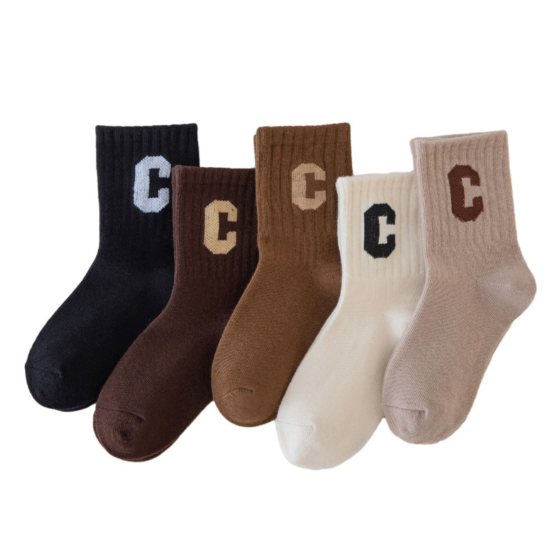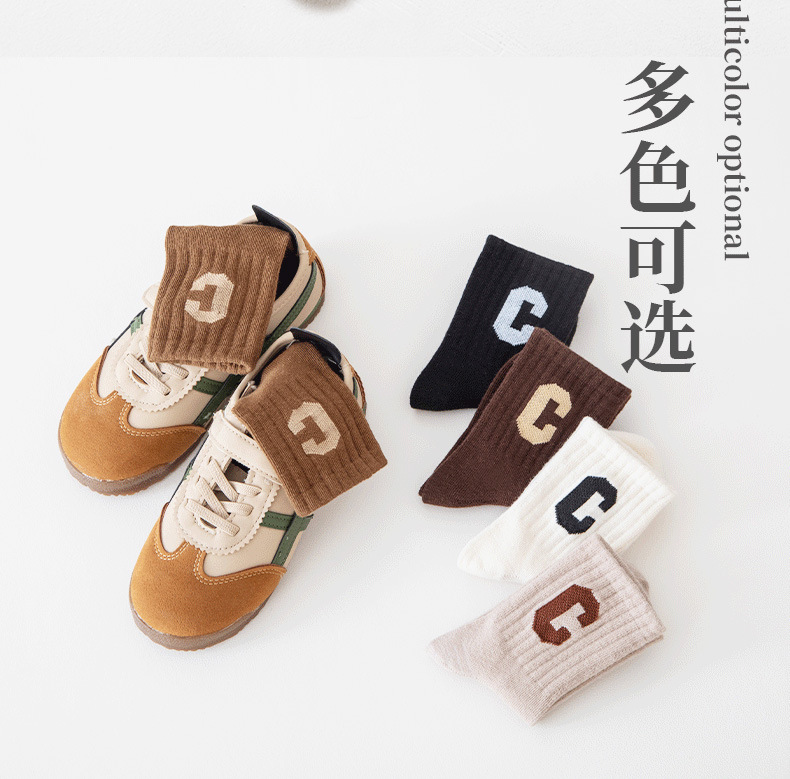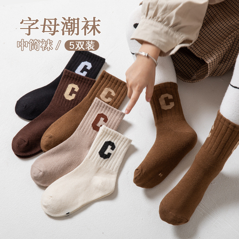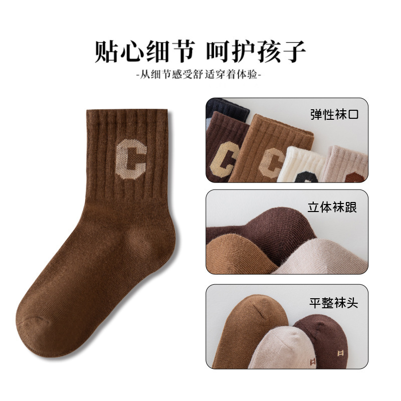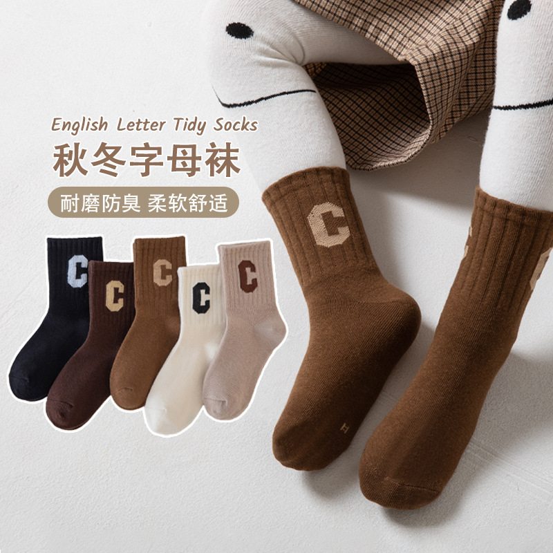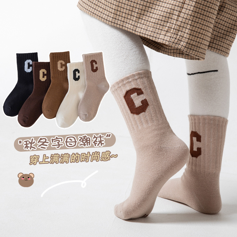 儿童袜子秋冬新款韩系C字母咖色中筒袜子男童女童棉袜学生袜家批