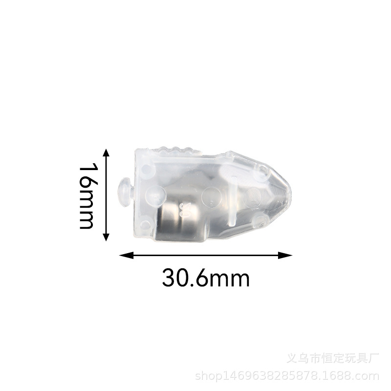 【产品材料】:塑料、LED灯、2颗AG3纽扣电池、推动开关,灯即亮起。