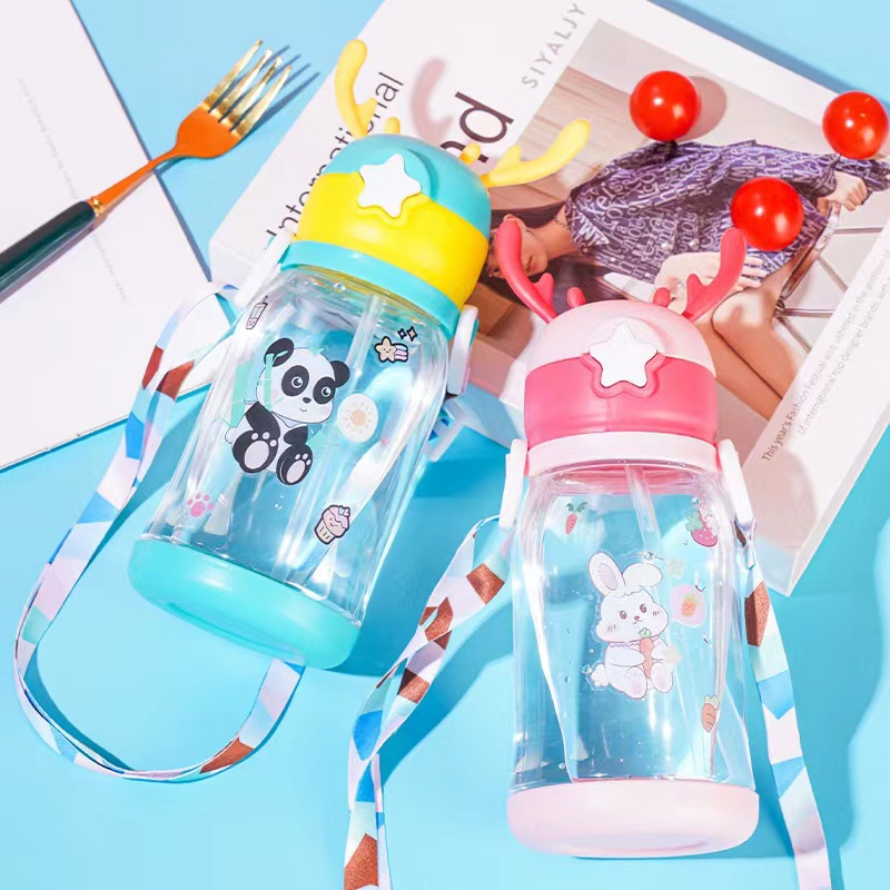 children‘s cartoon antler water cup bounce cover plastic cup with straw baby cute strap absorbent cup antler water cup