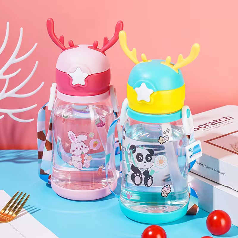 儿童卡通鹿角水杯弹跳盖塑料吸管杯宝宝可爱背带吸水杯鹿角水杯