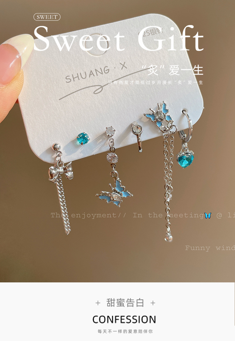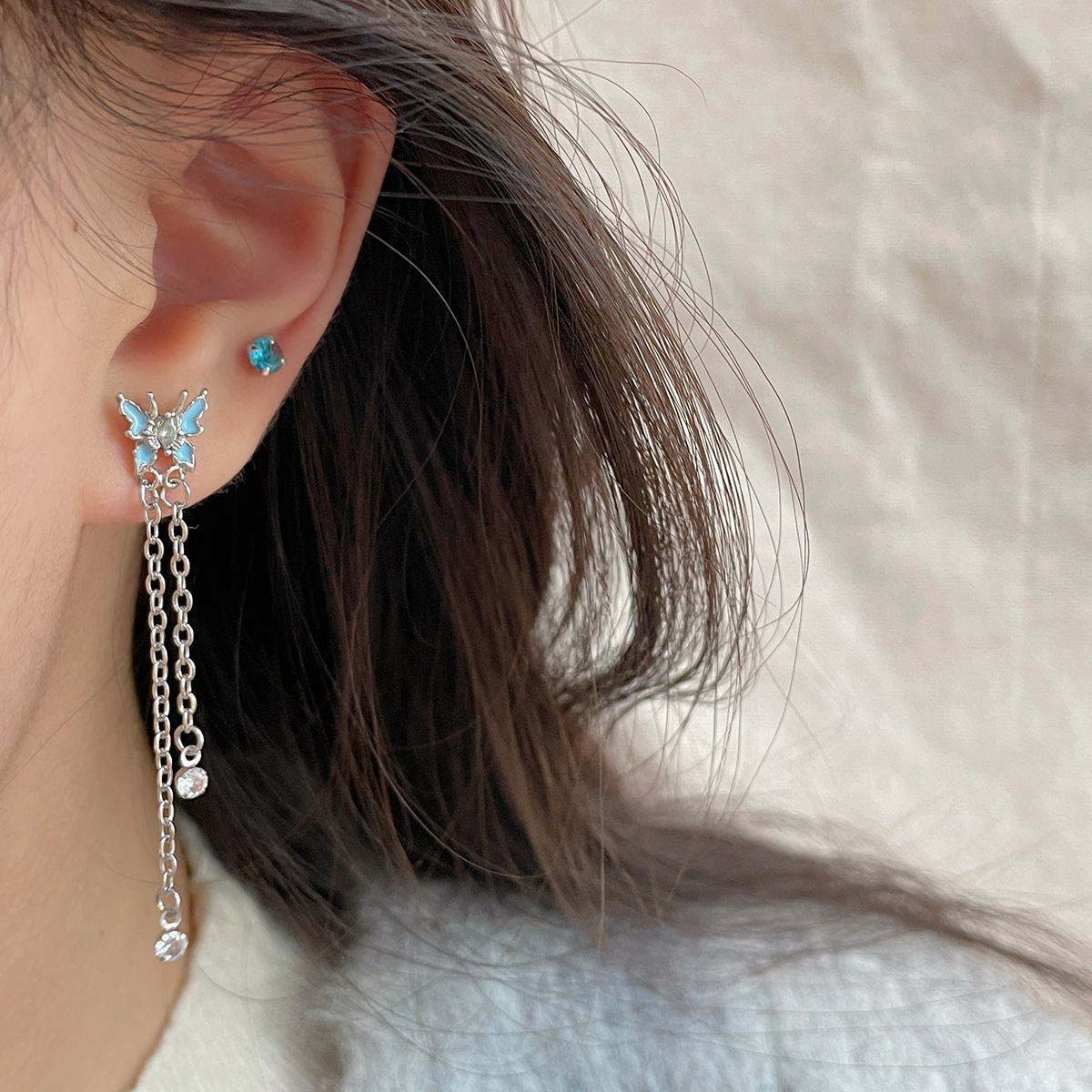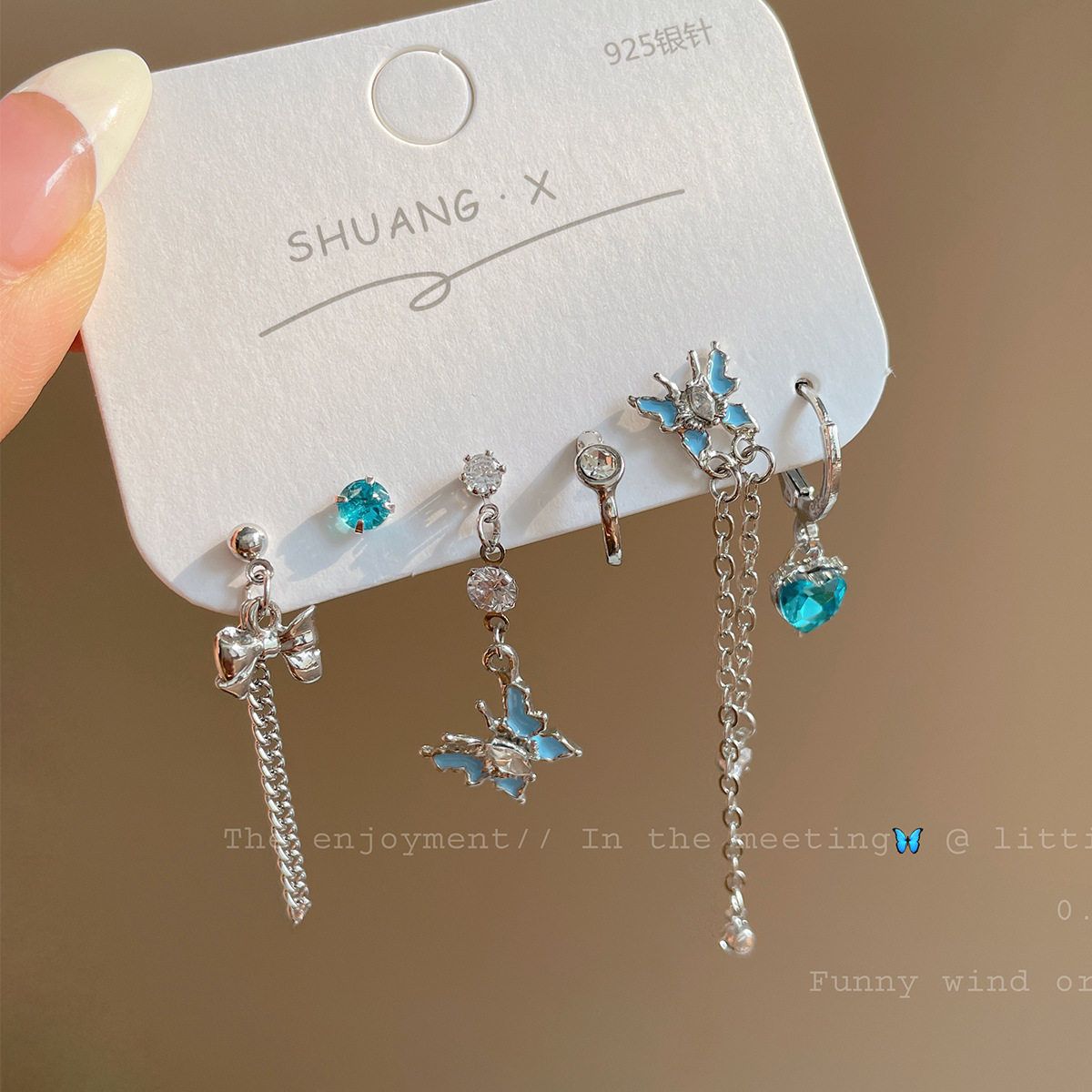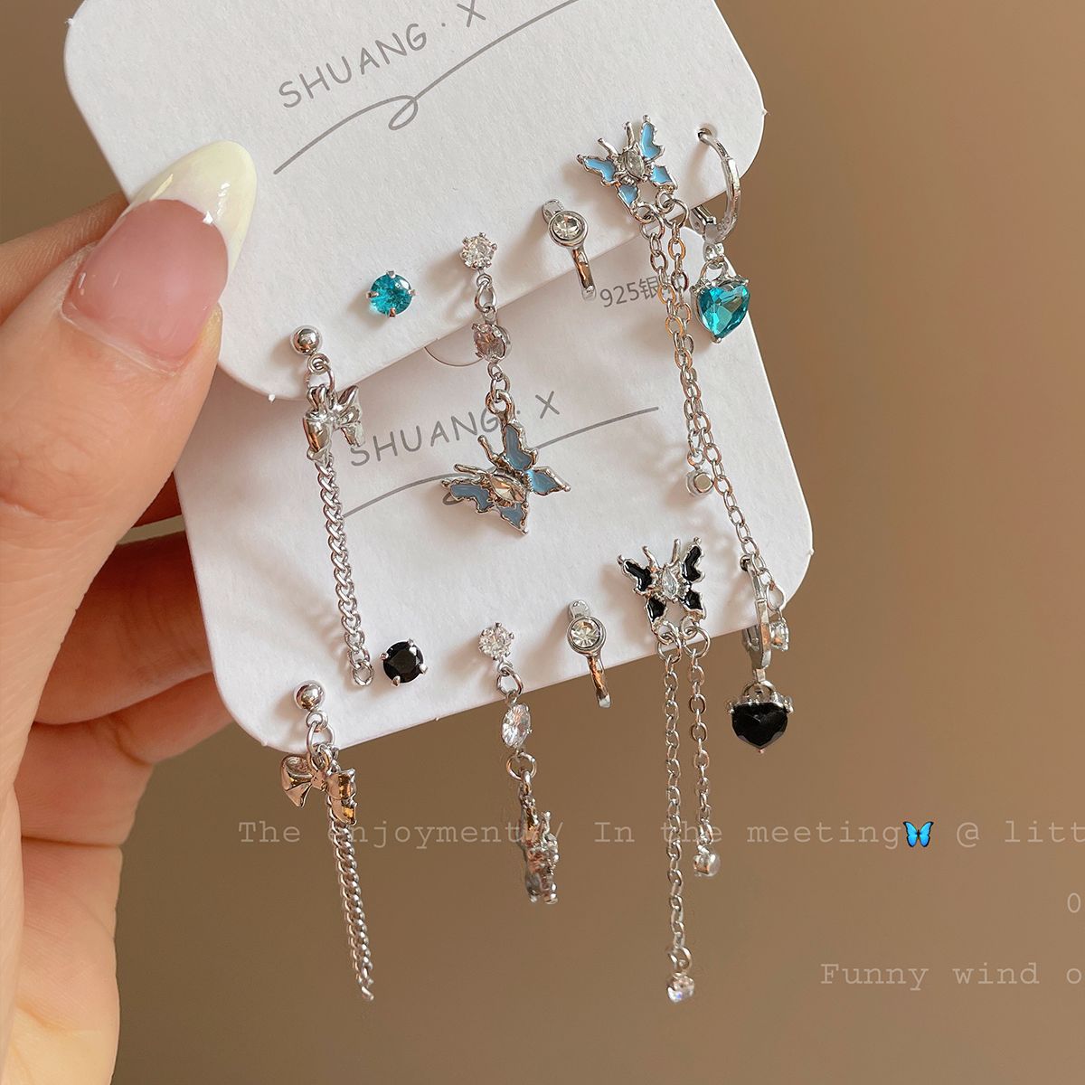 春季蓝蝴蝶少女耳扣套装银针个性小众新款甜酷不对称气质流苏耳环