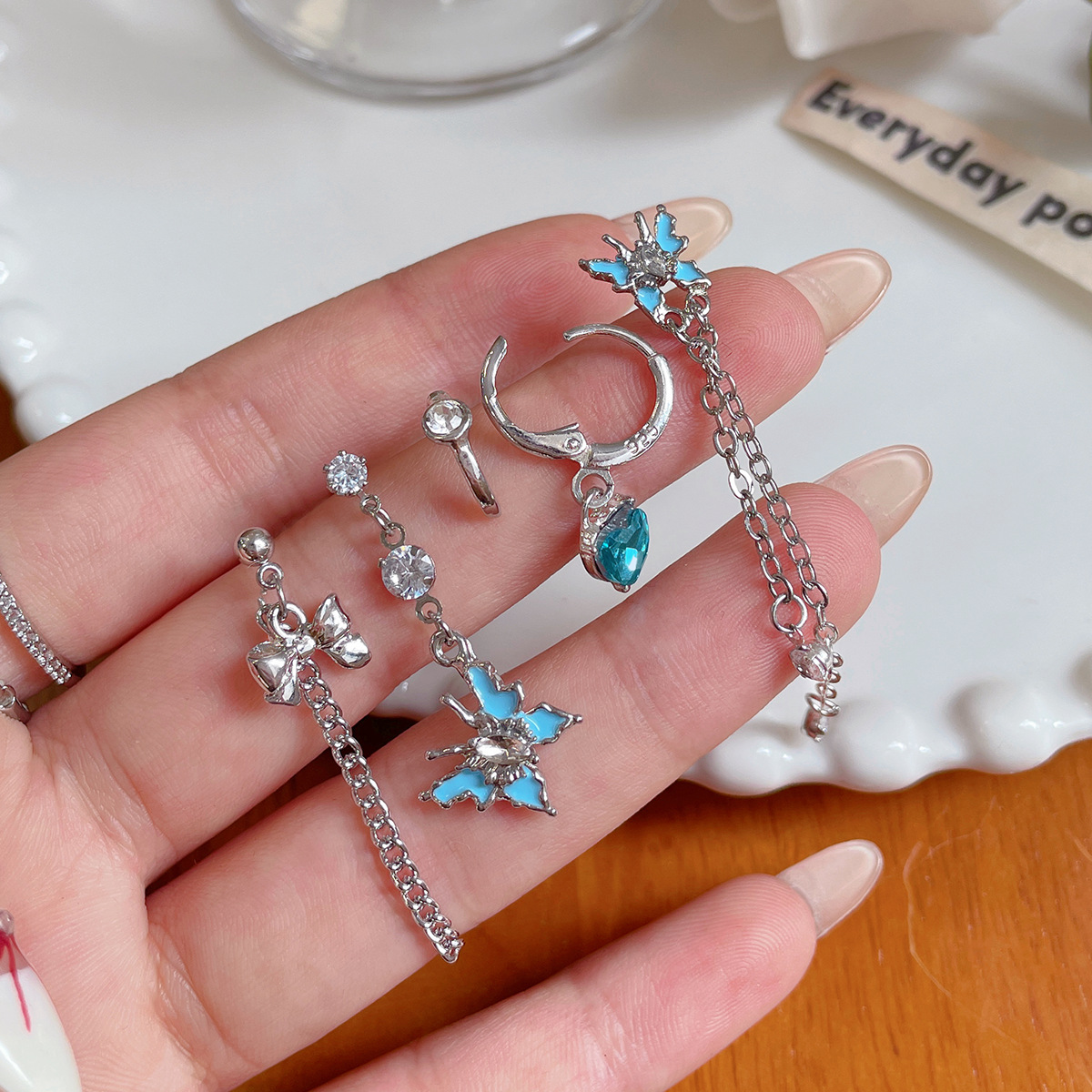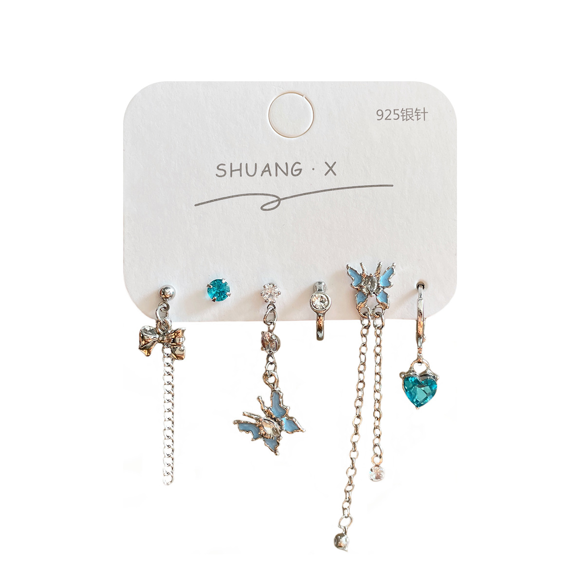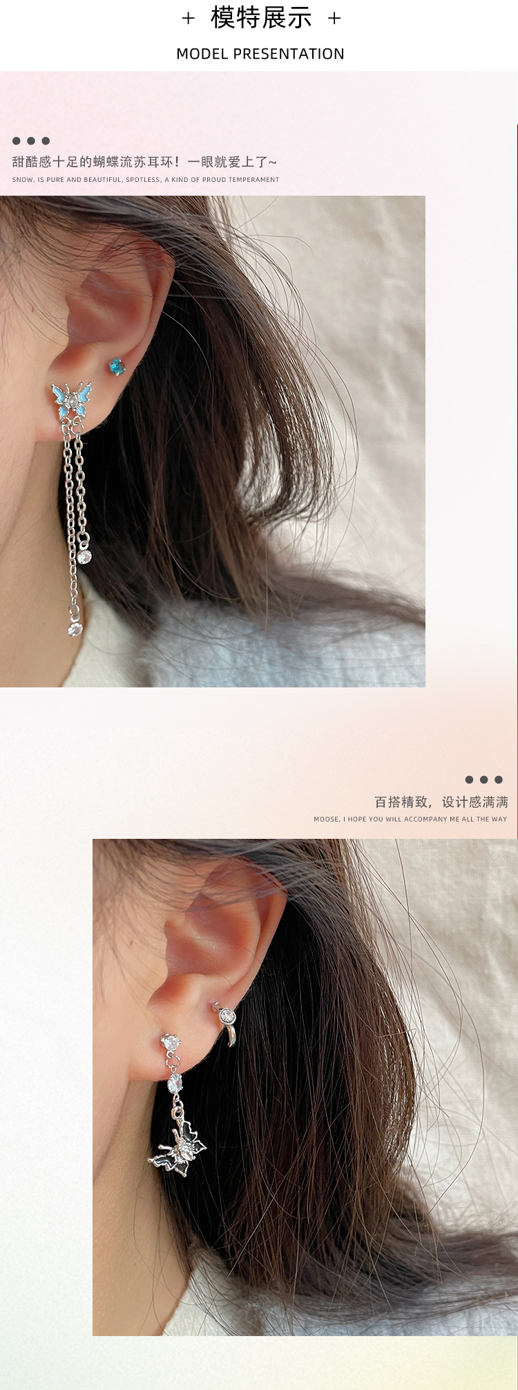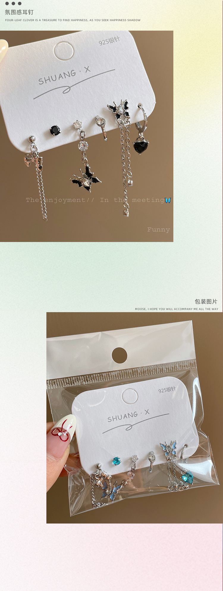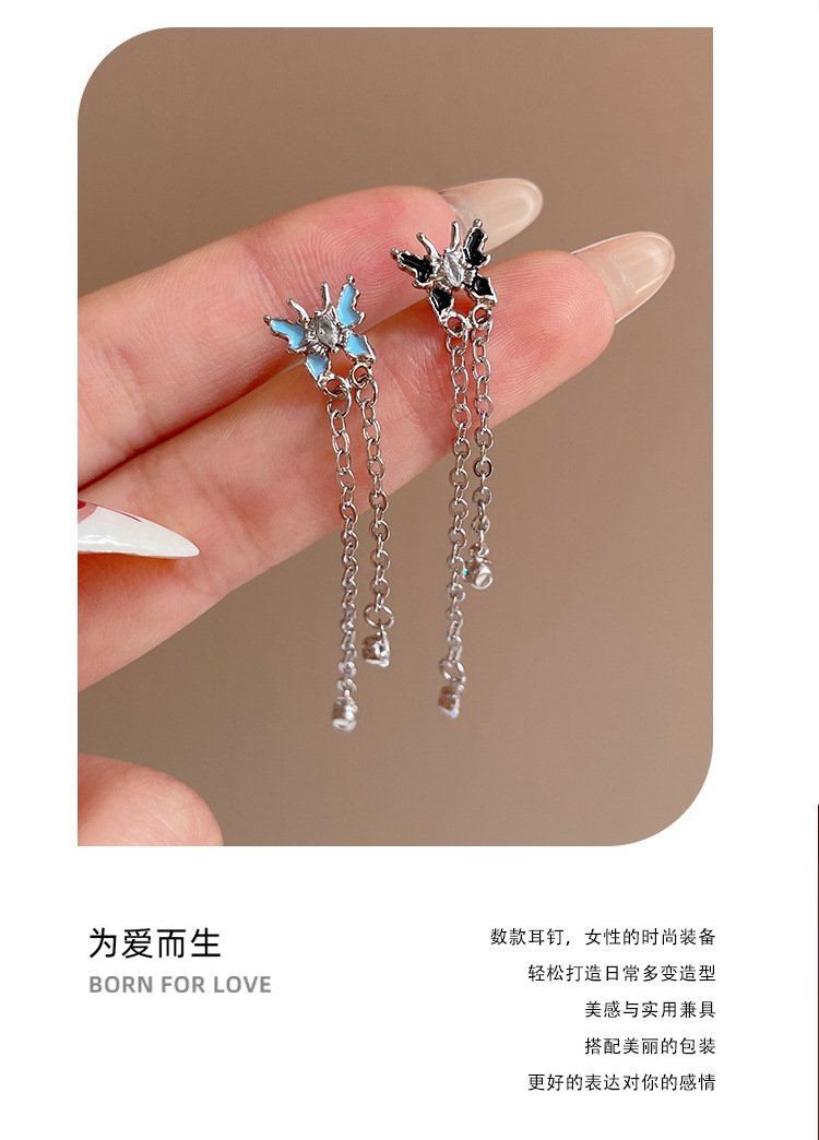 春季蓝蝴蝶少女耳扣套装银针个性小众新款甜酷不对称气质流苏耳环